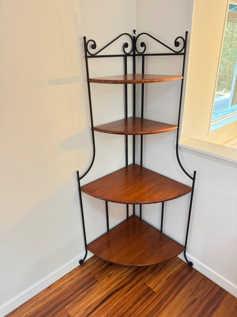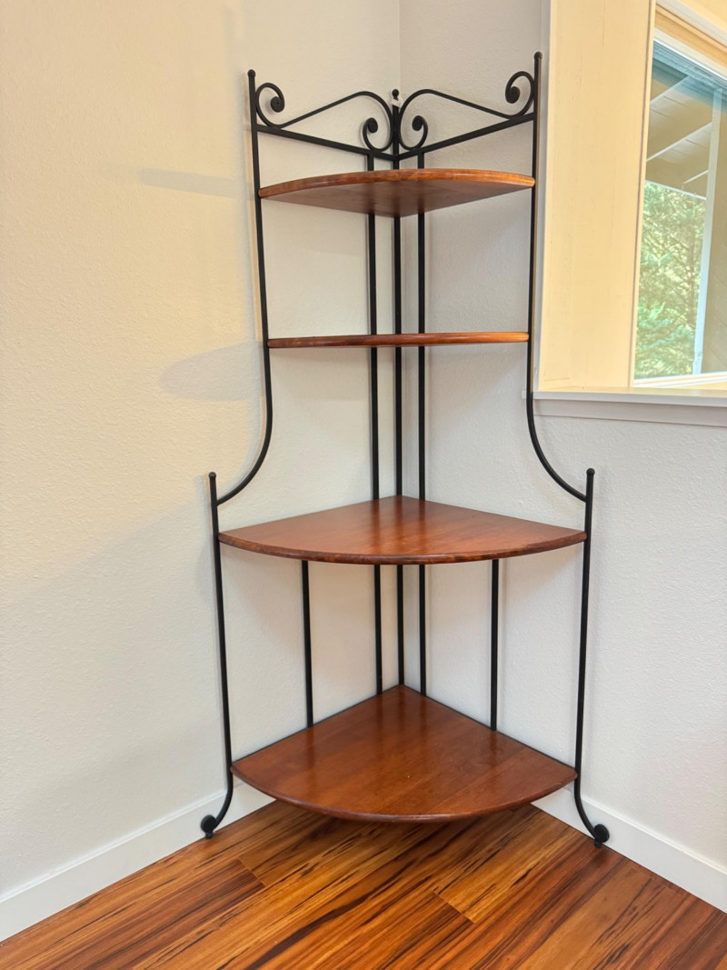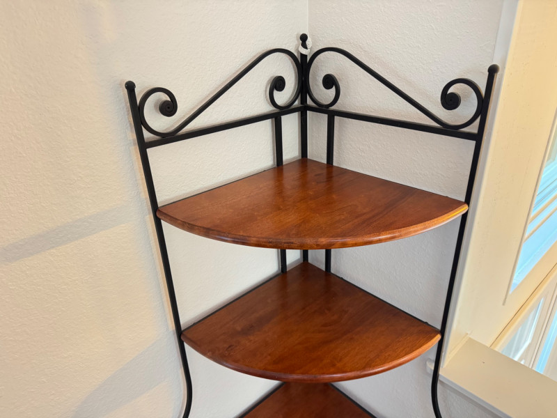 Iron and Wood Corner Display Shelf – 4 Tiers w/ Scroll Details.