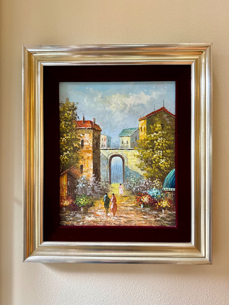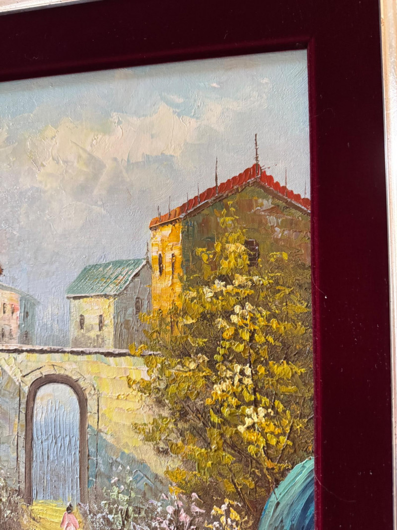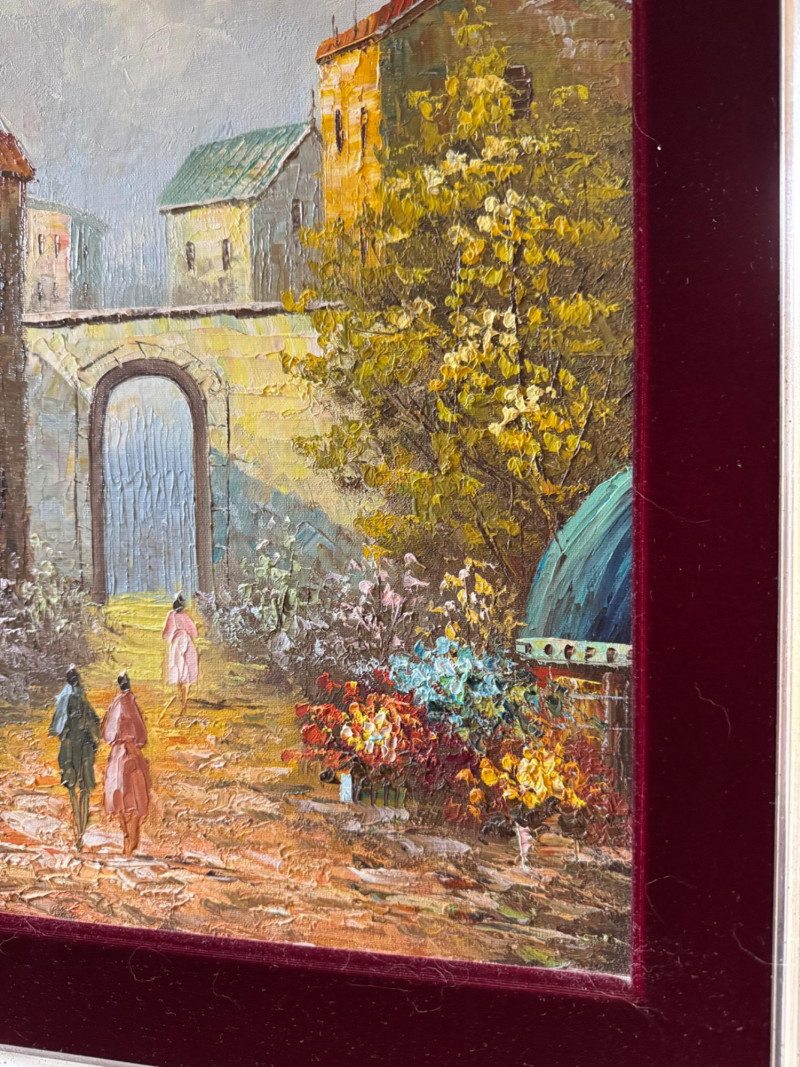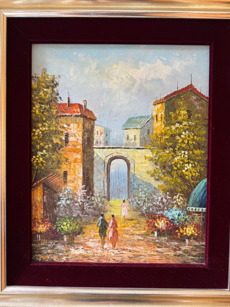 Framed Acrylic Painting, Red Velvet Matting – Village Scene w/ Archway.