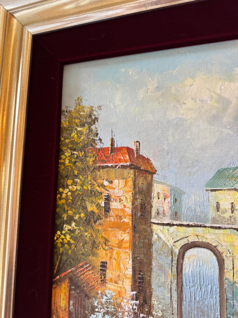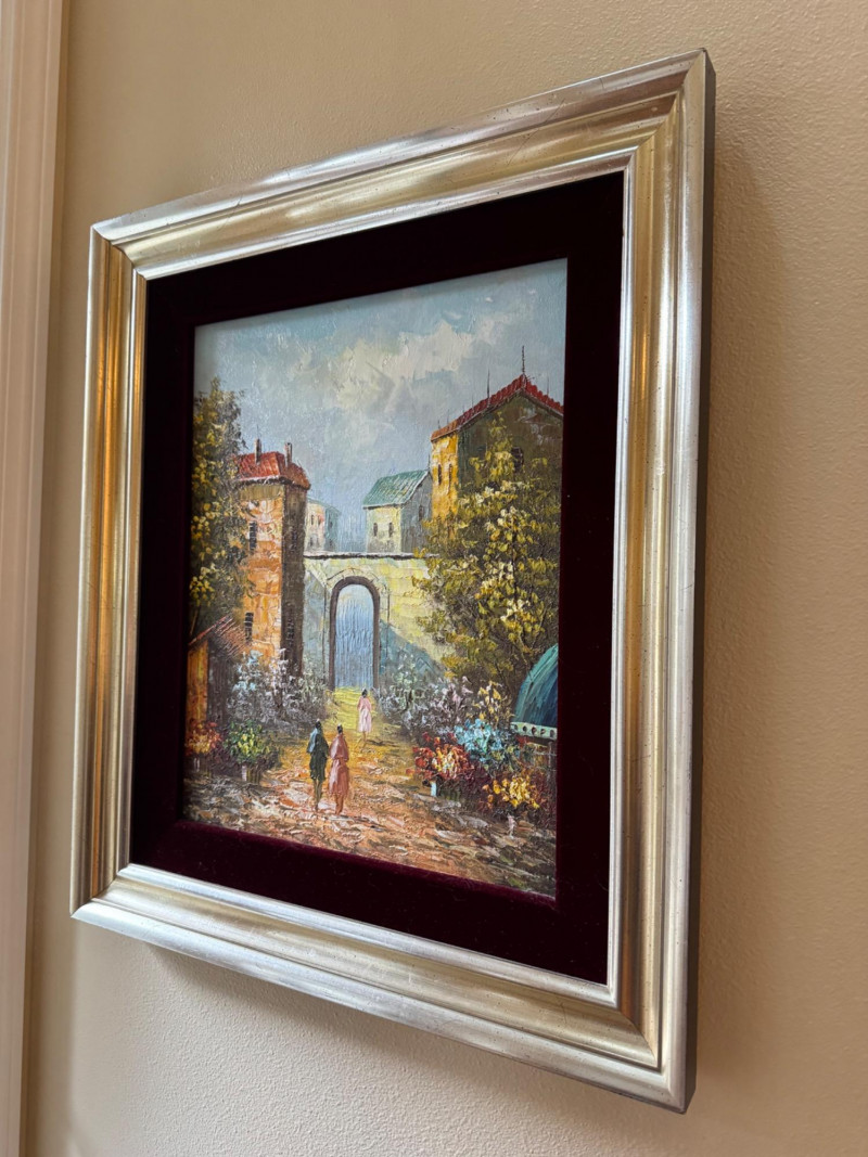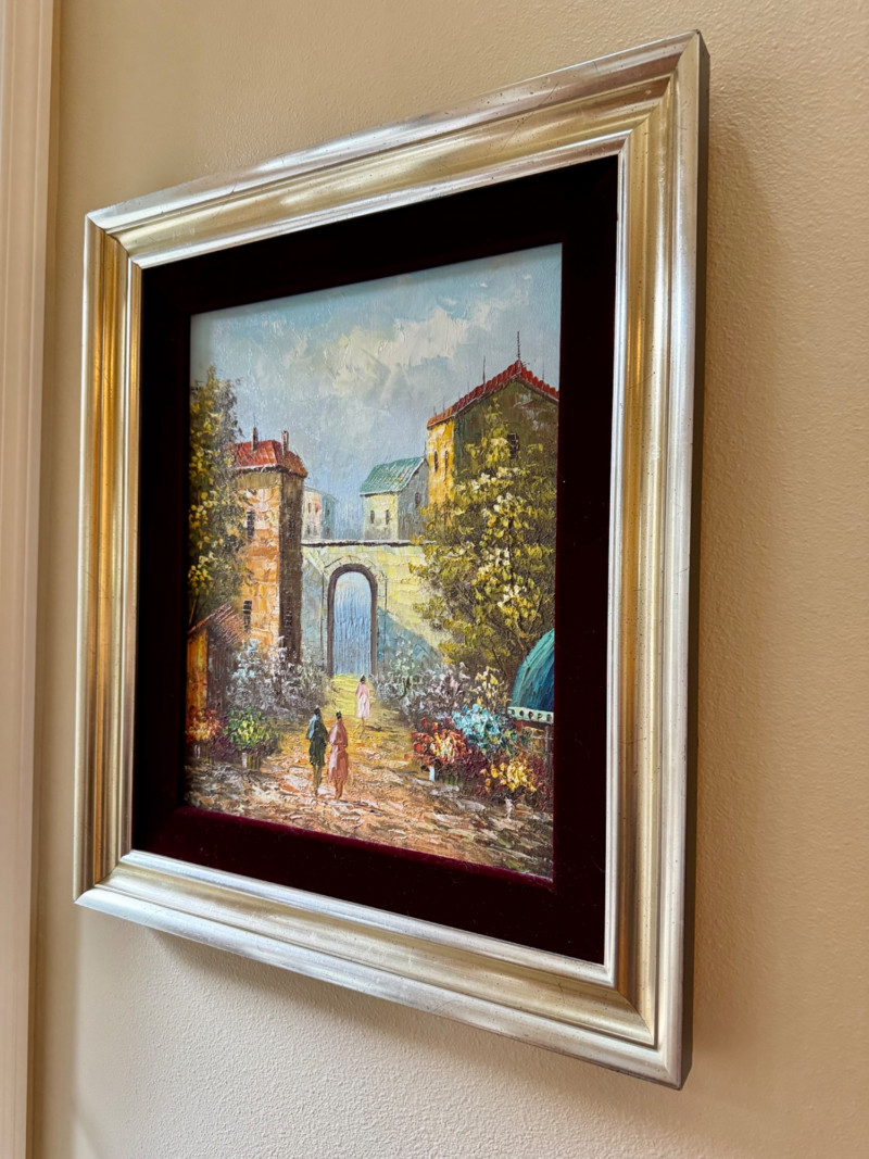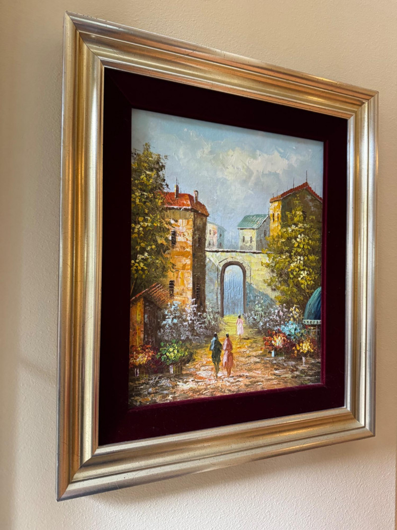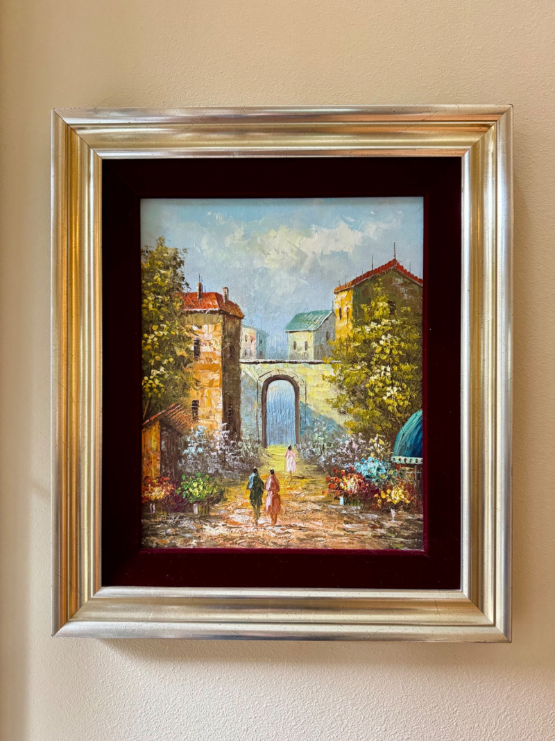Framed Acrylic Painting, Red Velvet Matting – Village Scene w/ Archway.