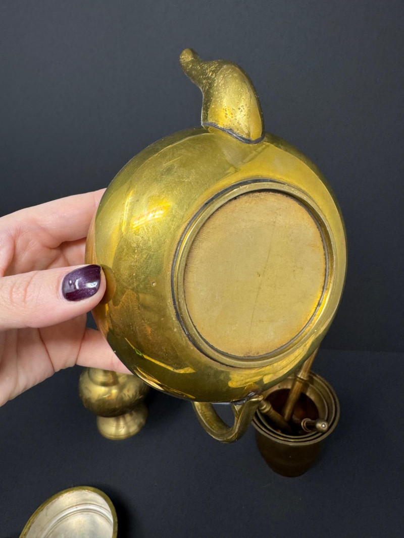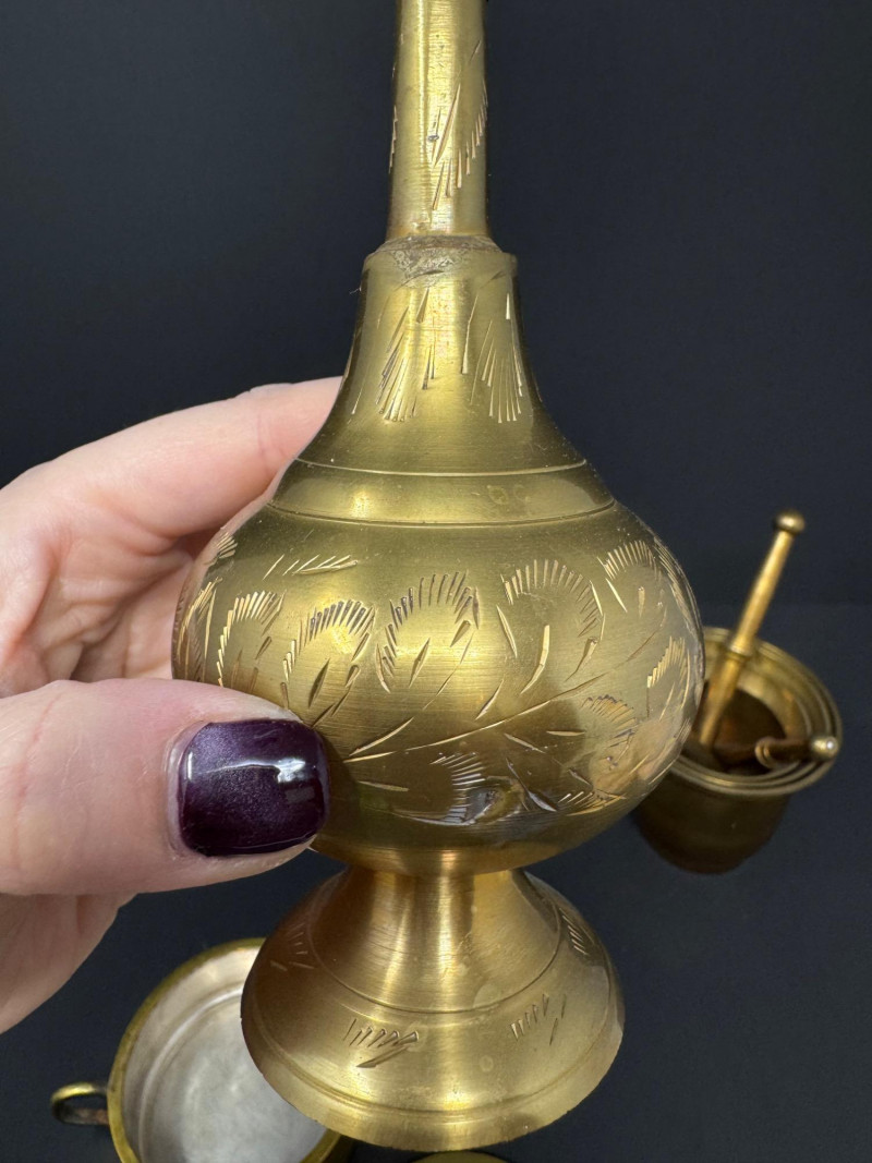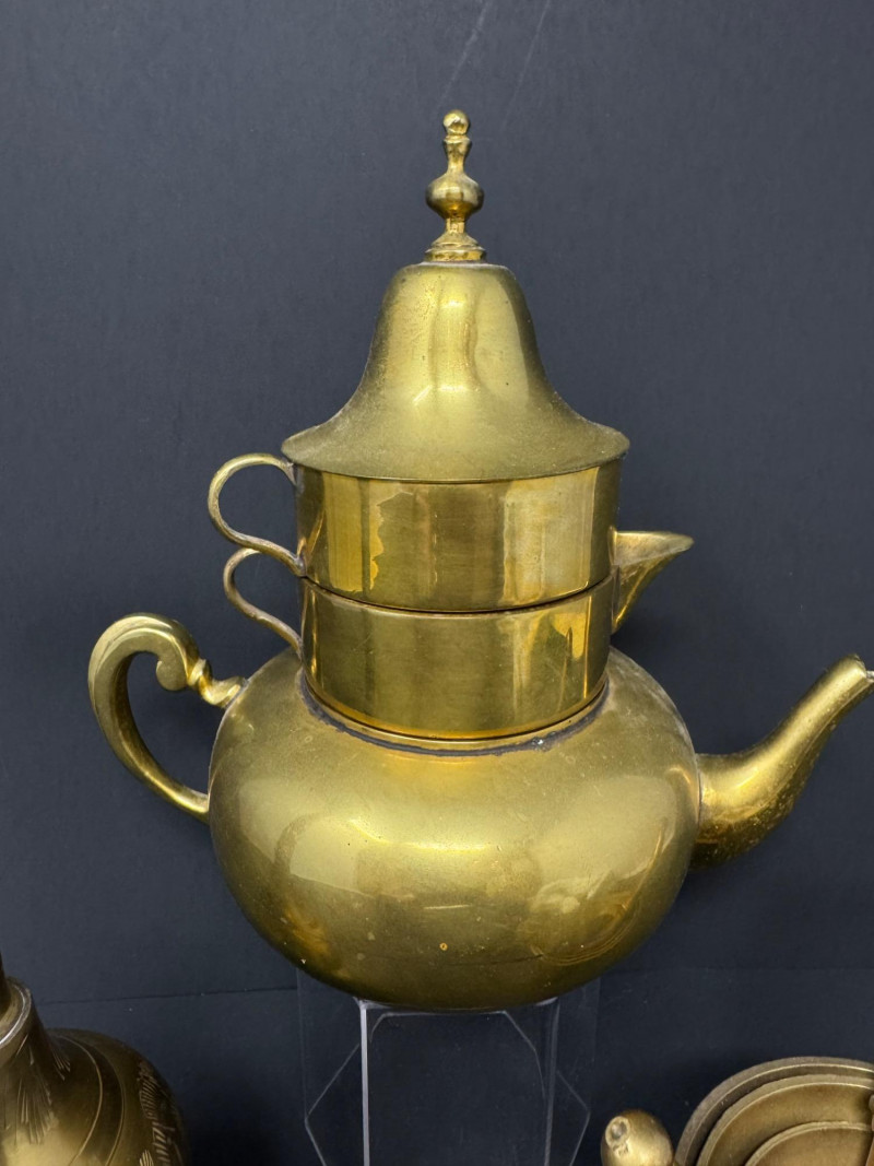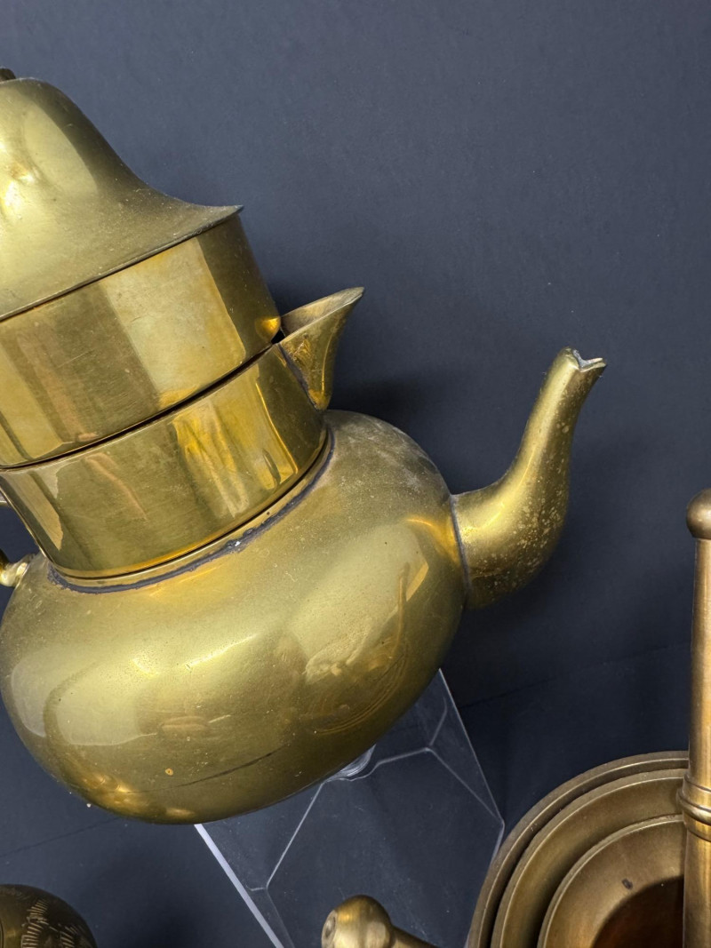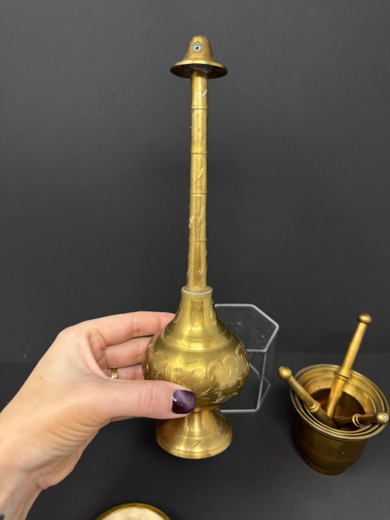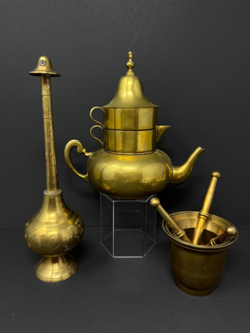 Saudi Arabia Brass Teapot, Rose Water Sprinkler & Mortars.