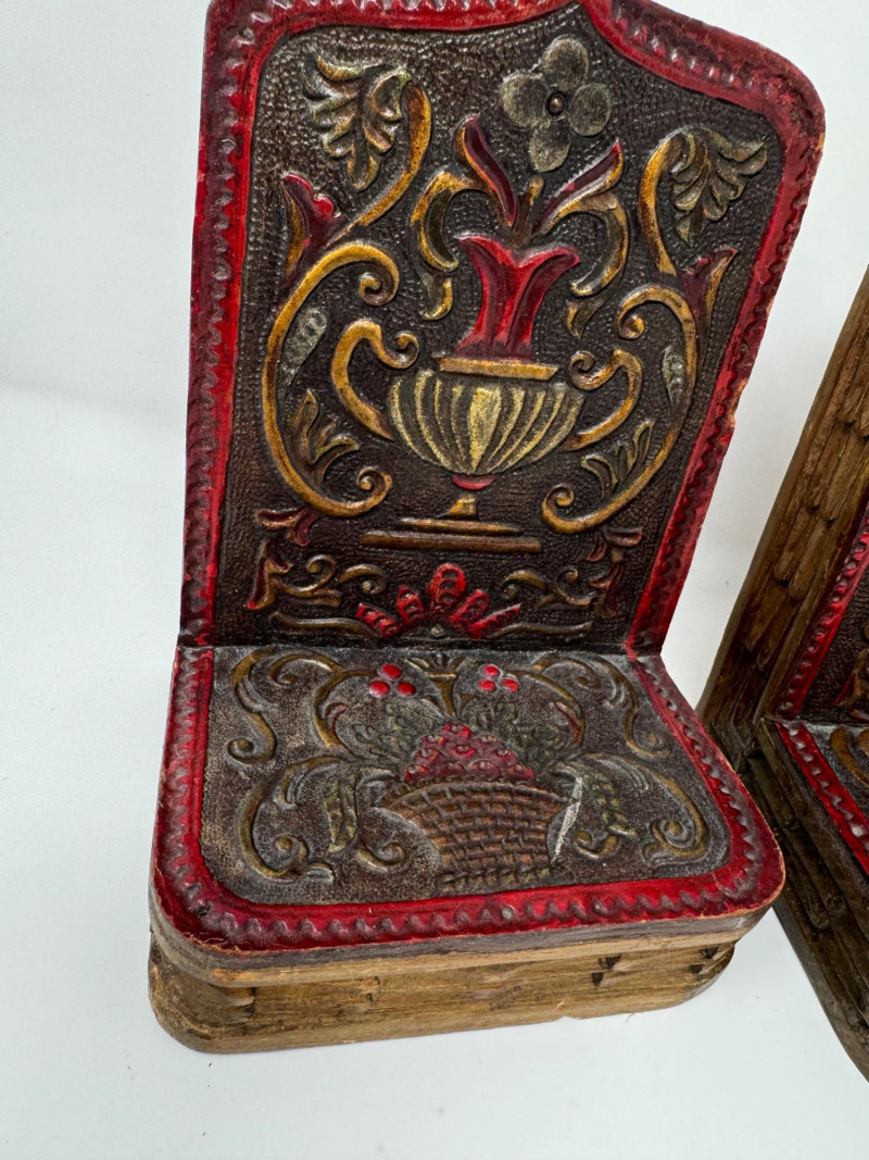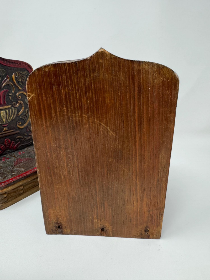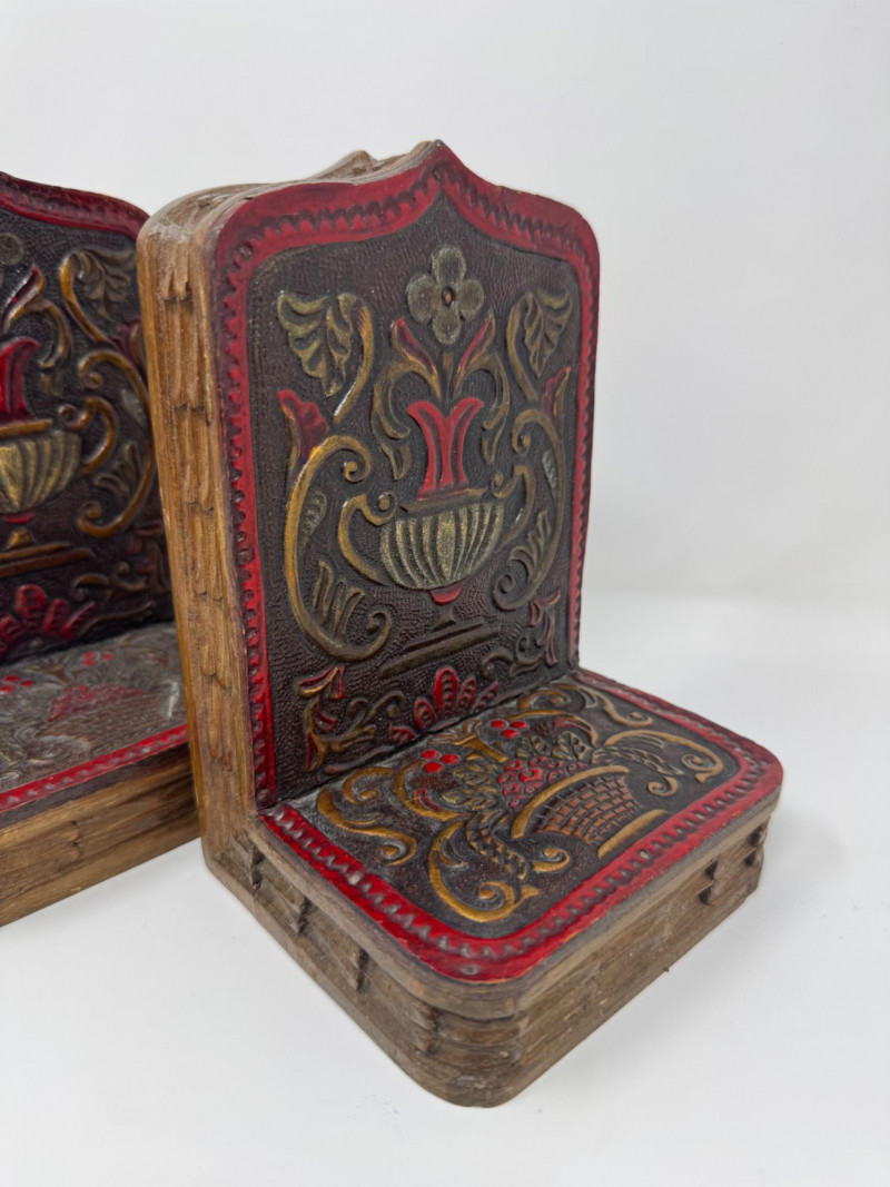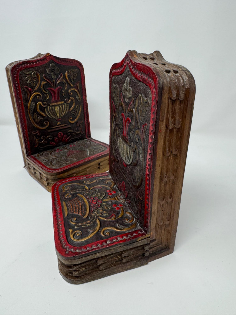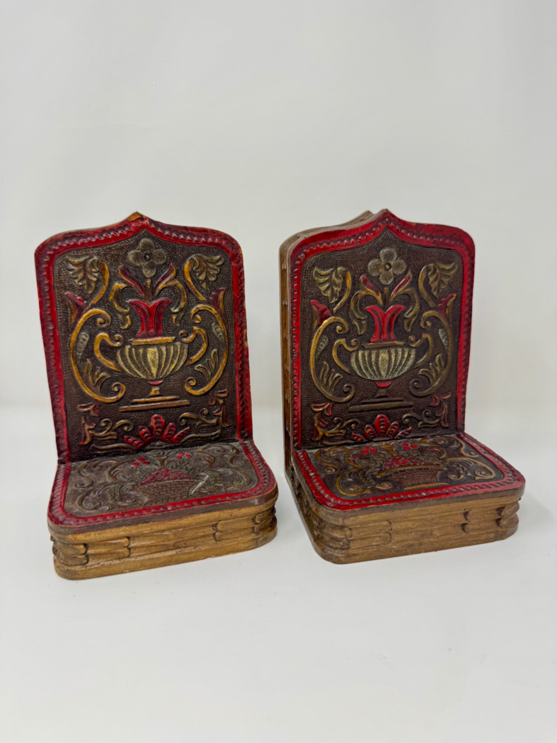 Vintage Carved Wood Bookends – Embossed Floral Urn Design.