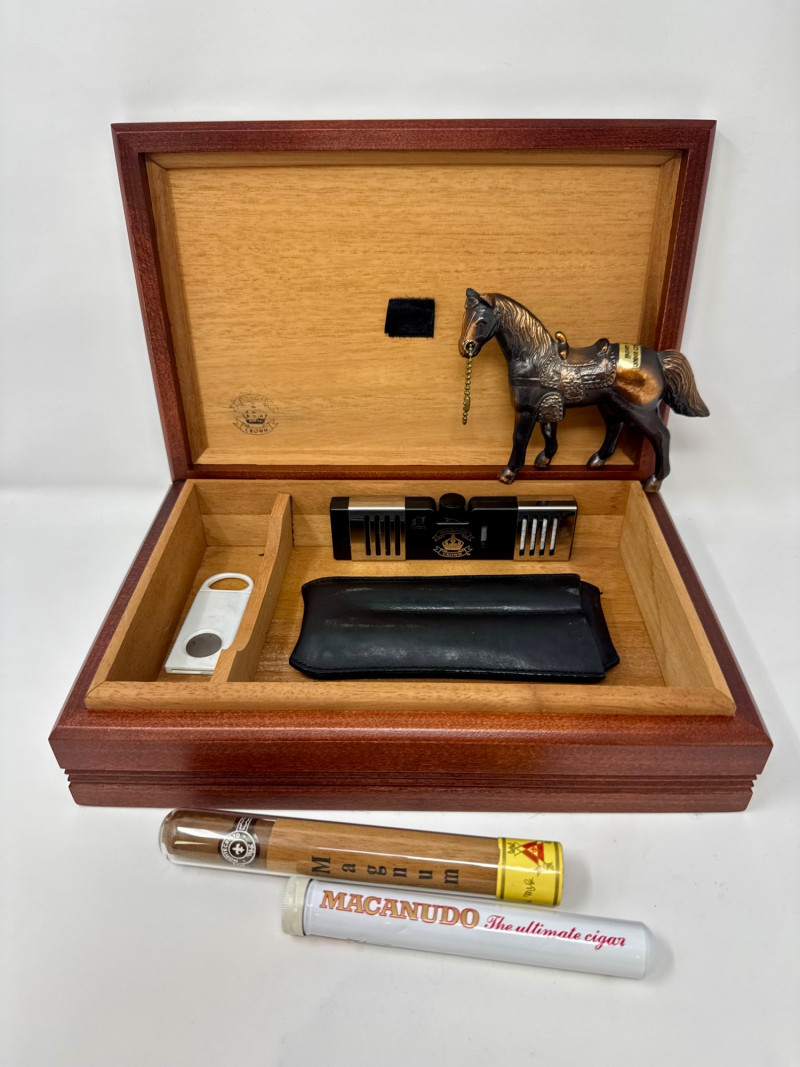 Reed & Barton Cigar Humidor Set w/ Cutter, Holder & Dodge City Horse.