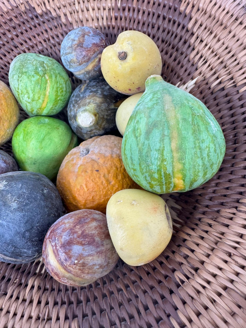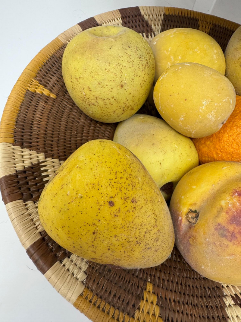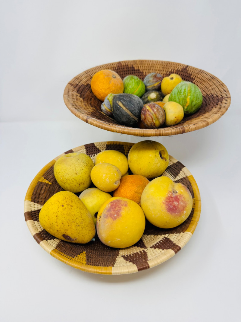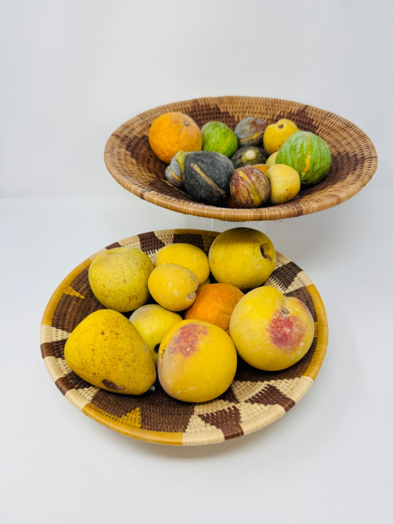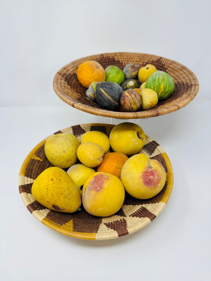 2 Woven Baskets Filled w/ Decorative Stone Fruit.