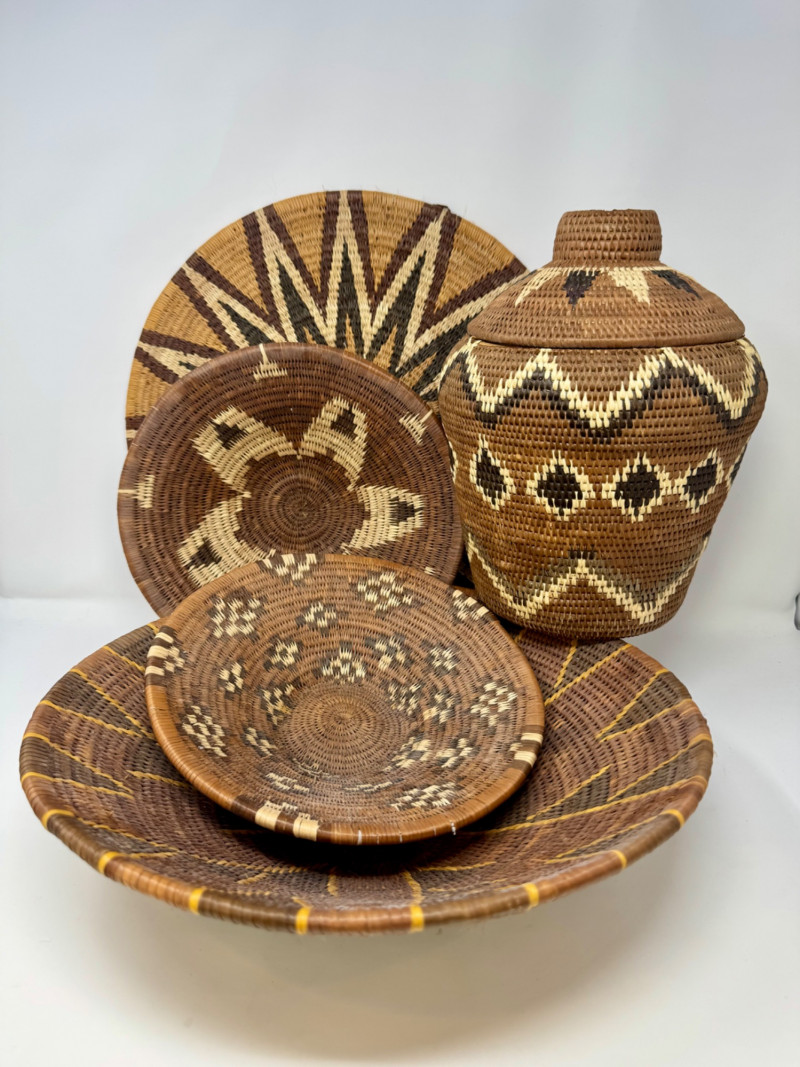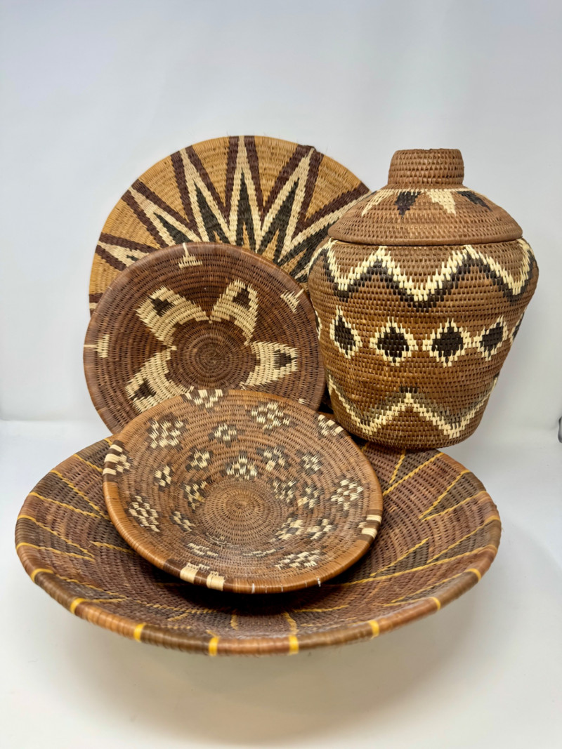Set of 5 Handwoven Baskets w/ Lidded Jar – Natural Brown Designs.