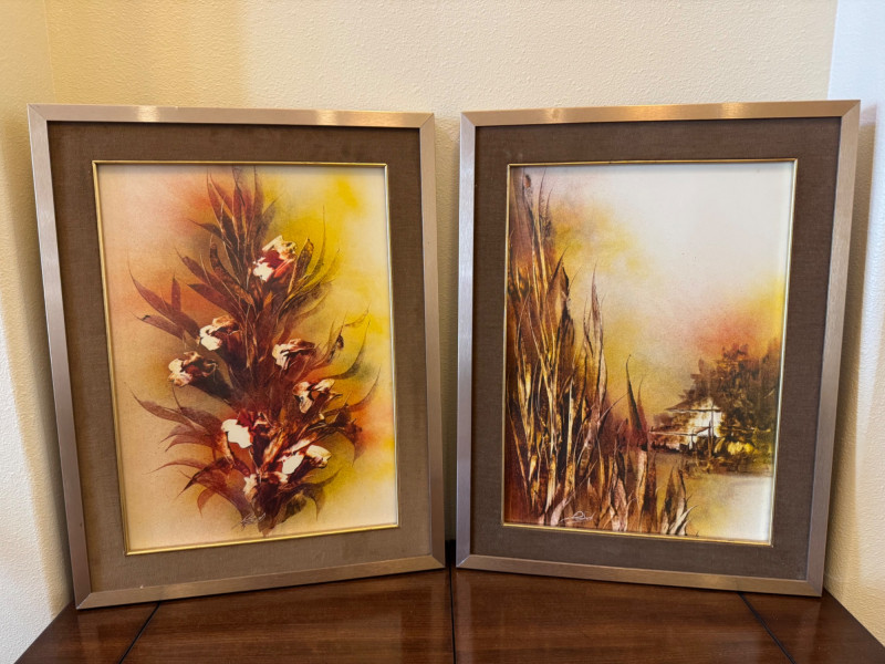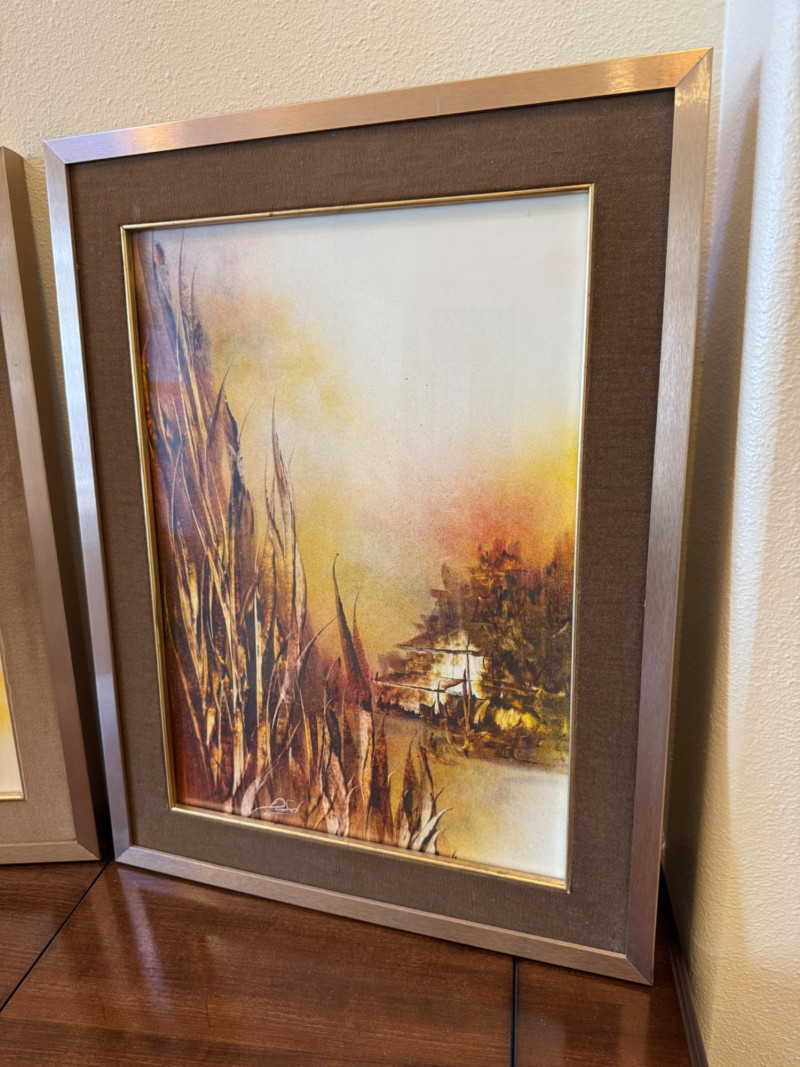 Pair of Mid Century Signed Paintings w/ Velvet Mats & Metal Frames.