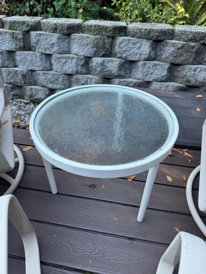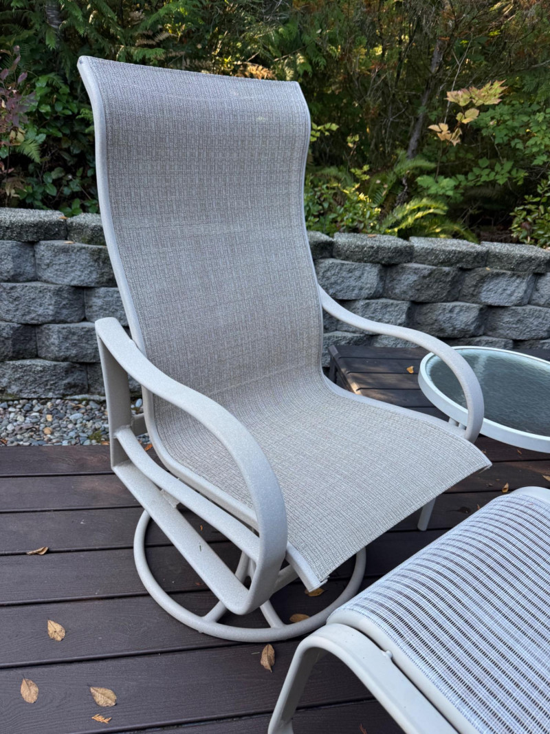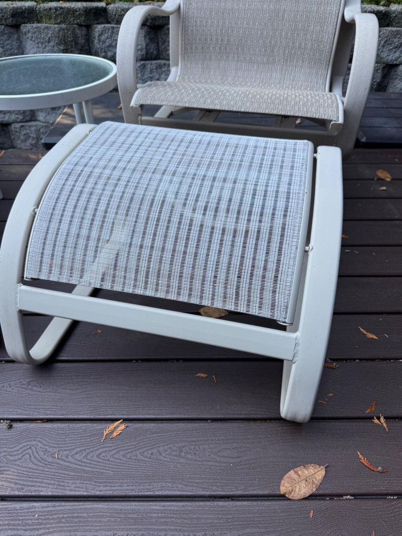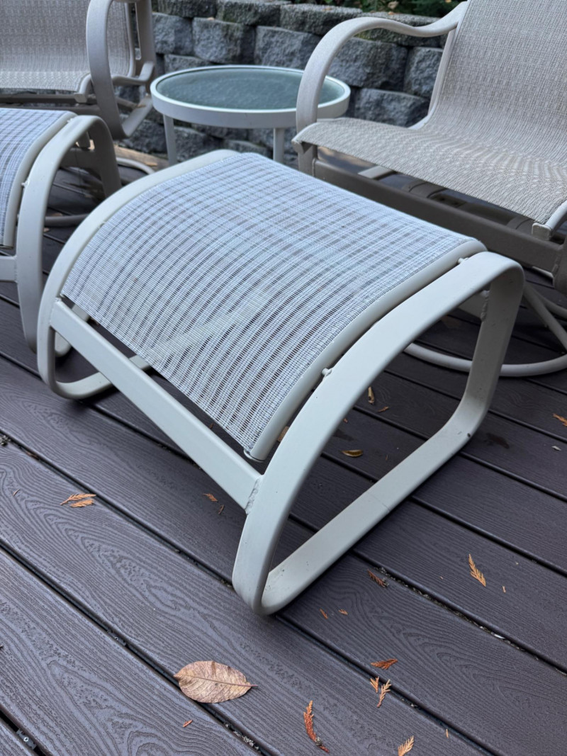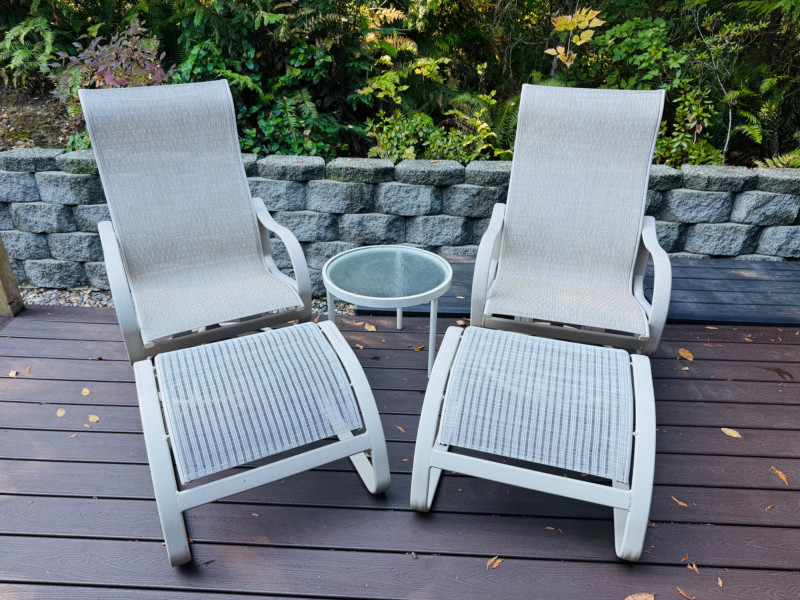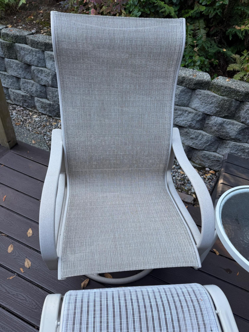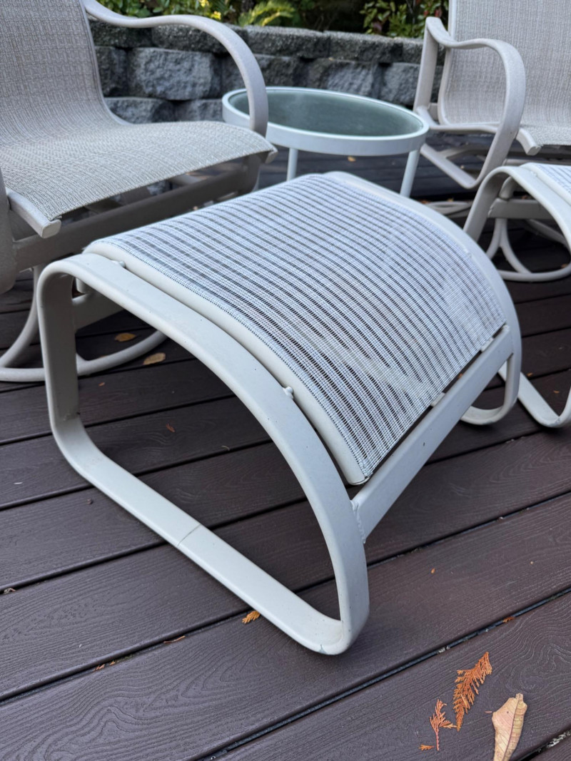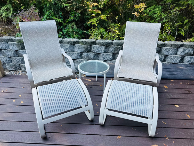 Outdoor Patio Set – 2 Sling Chairs w/ Ottomans & Round Glass Table.