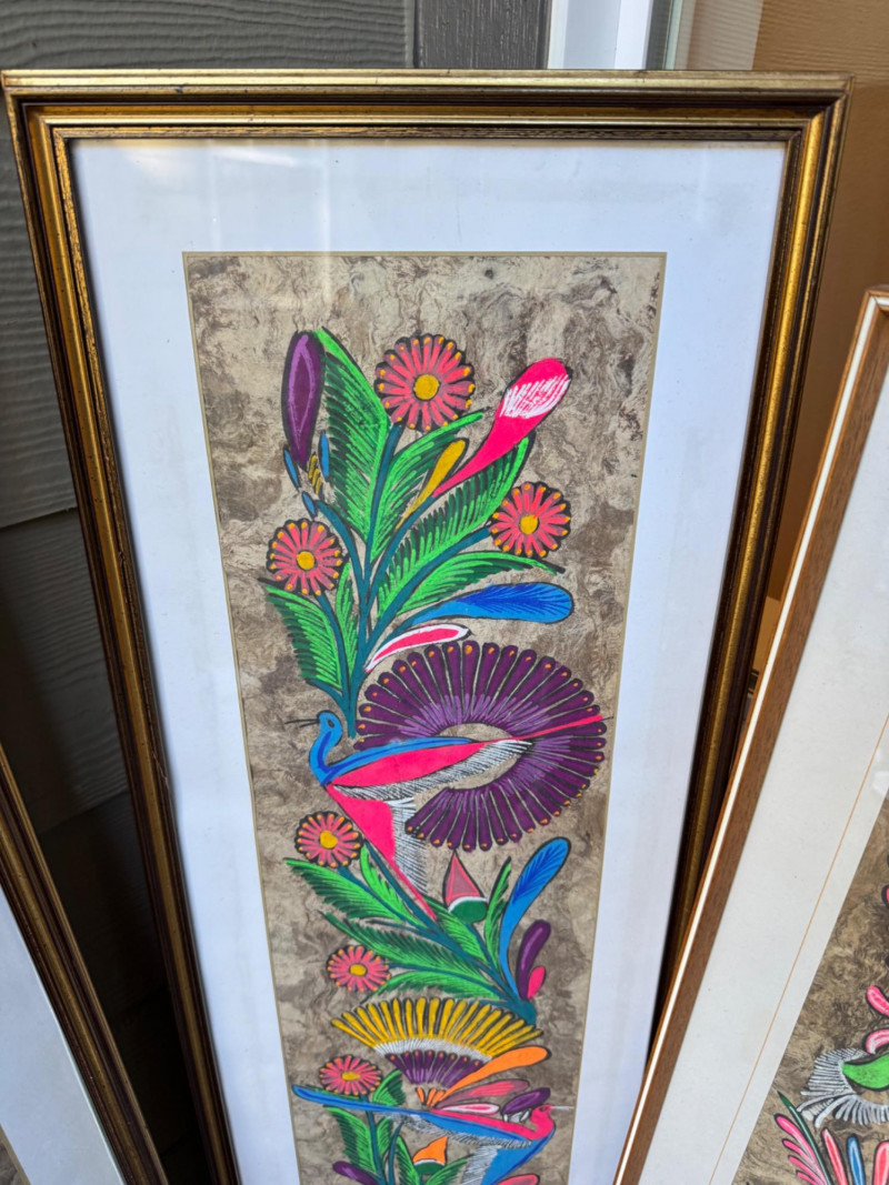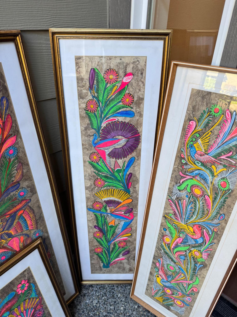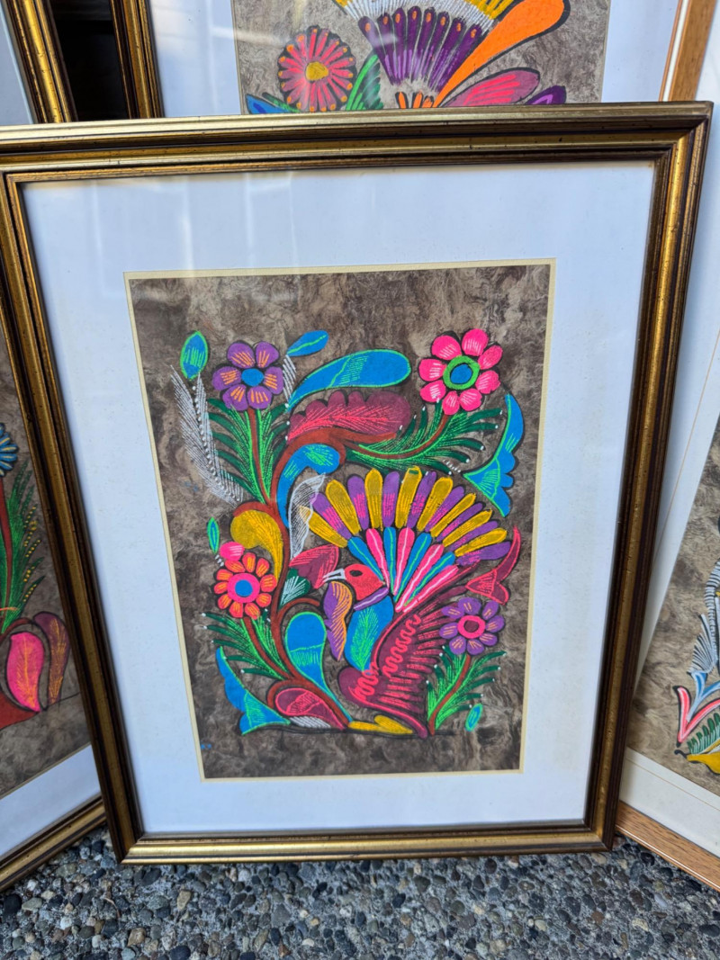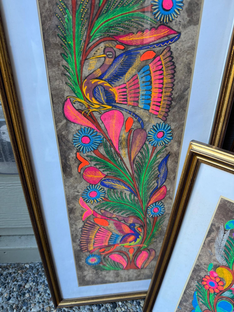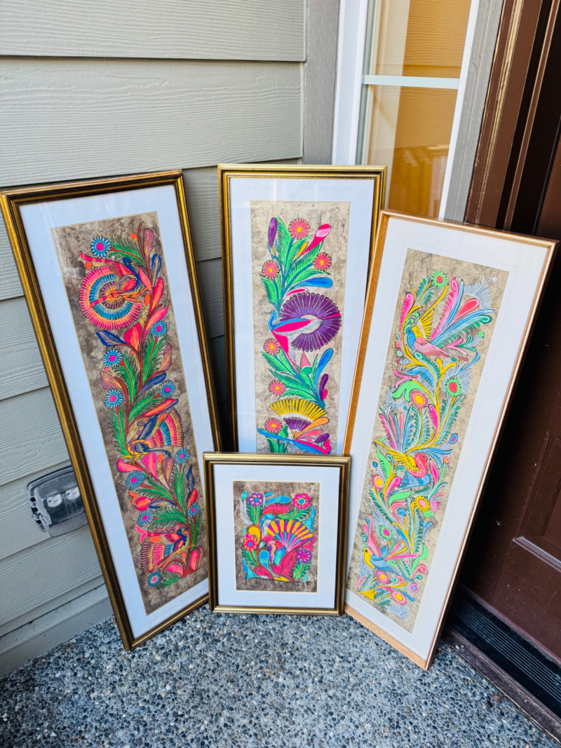 Set Of 4 Vibrant Hand-Painted Neon Mexican Folk Art Paintings.