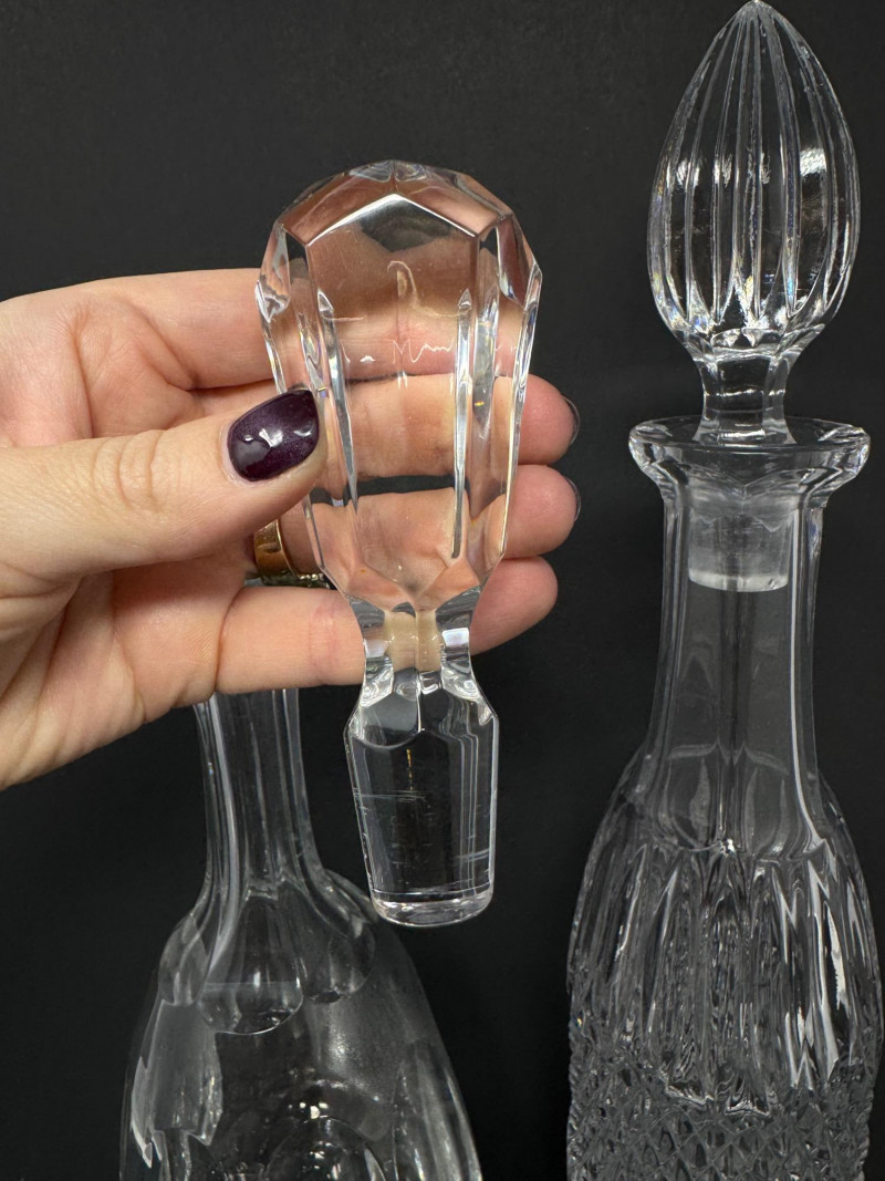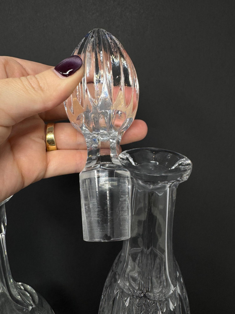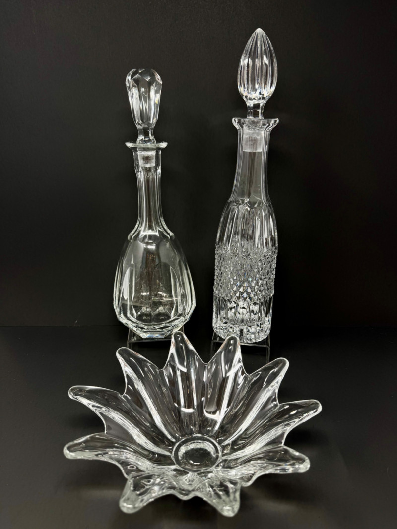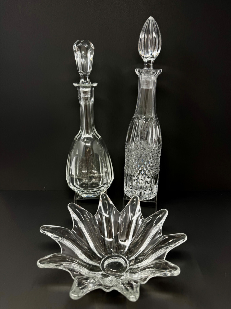 Crystal Decanters, Tall & Teardrop Shapes, w/ Starburst Bowl.