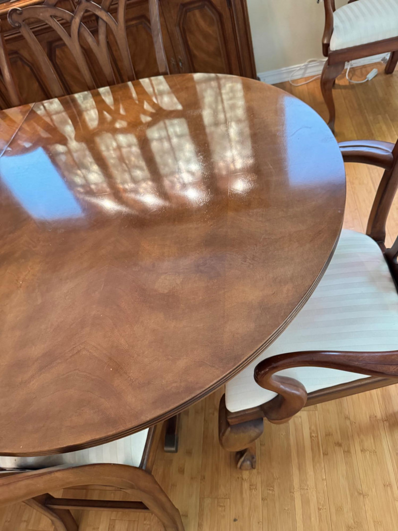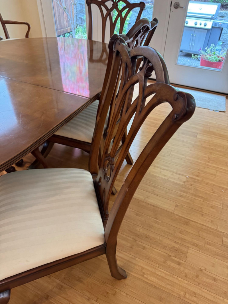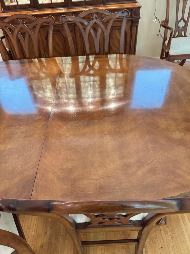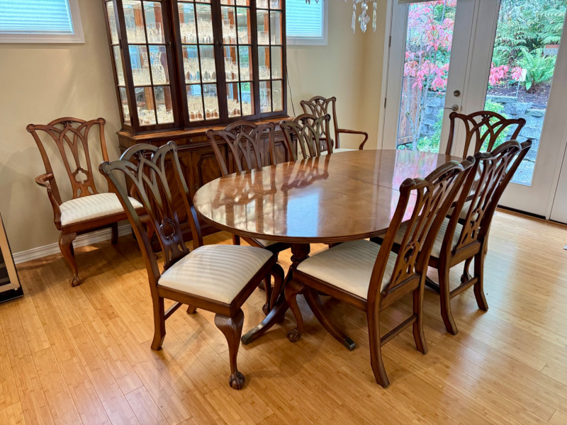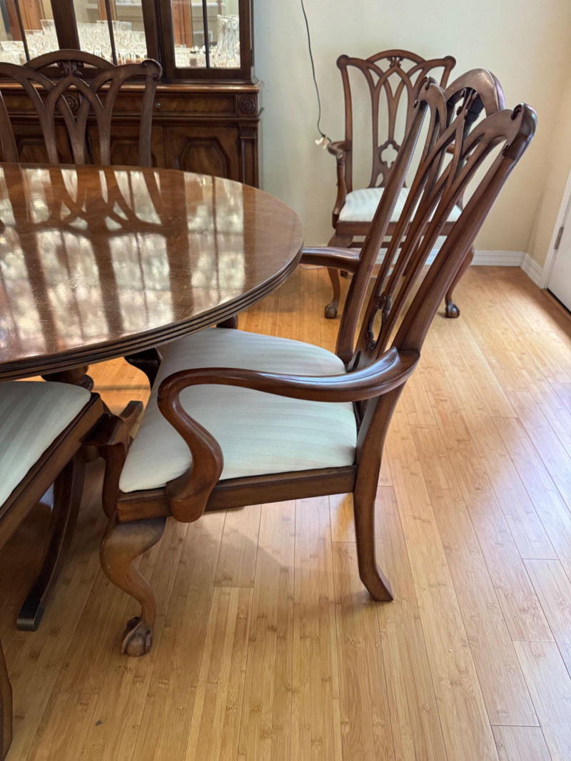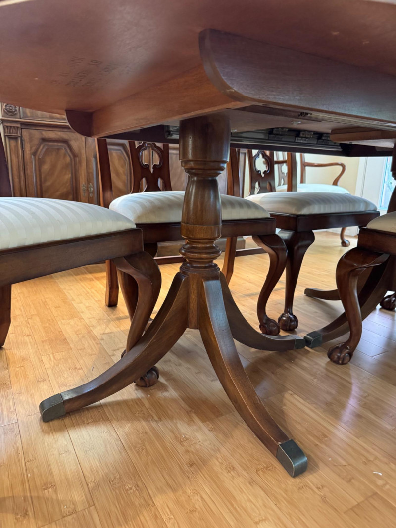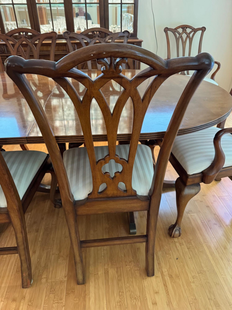 Heritage Dining Set – Extendable Table & 8 Chairs – Est. $4,000+ Bidding on this lot is an agreement that: (1.) You will have at least 2 capable, able bodied persons to lift and load at a minimum. (2.) You will bring a hand truck and/or any other tools needed to remove this item. If these steps are not followed your item will be forfeit and no refund given.