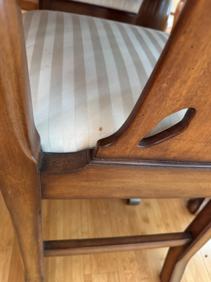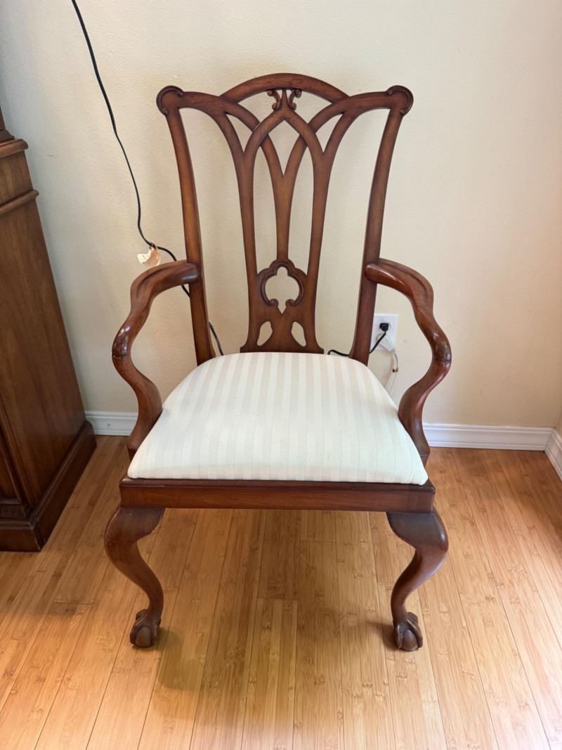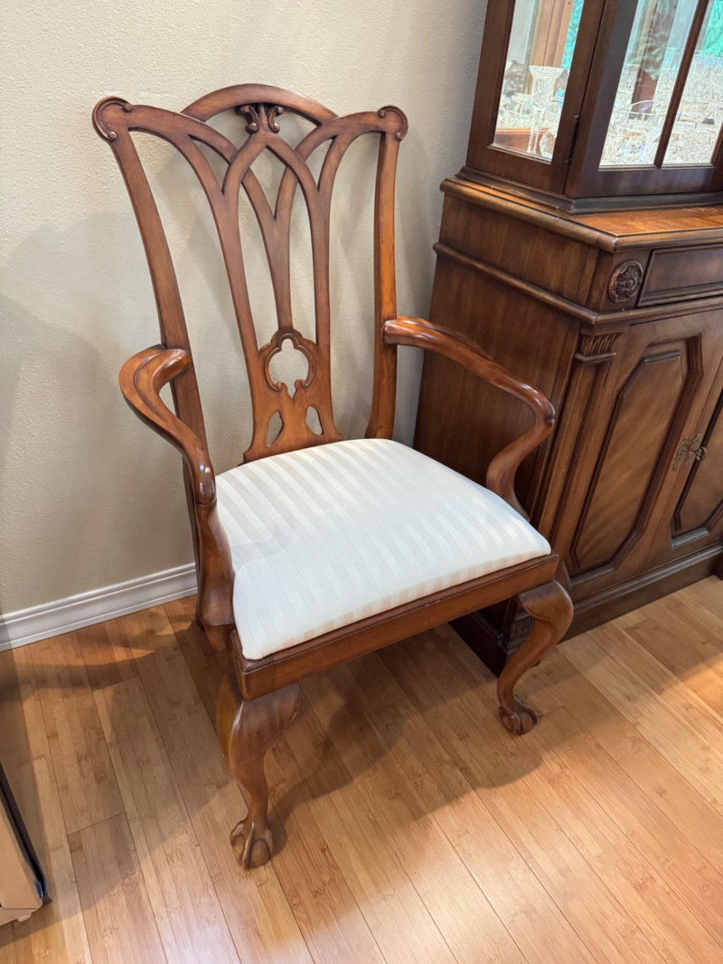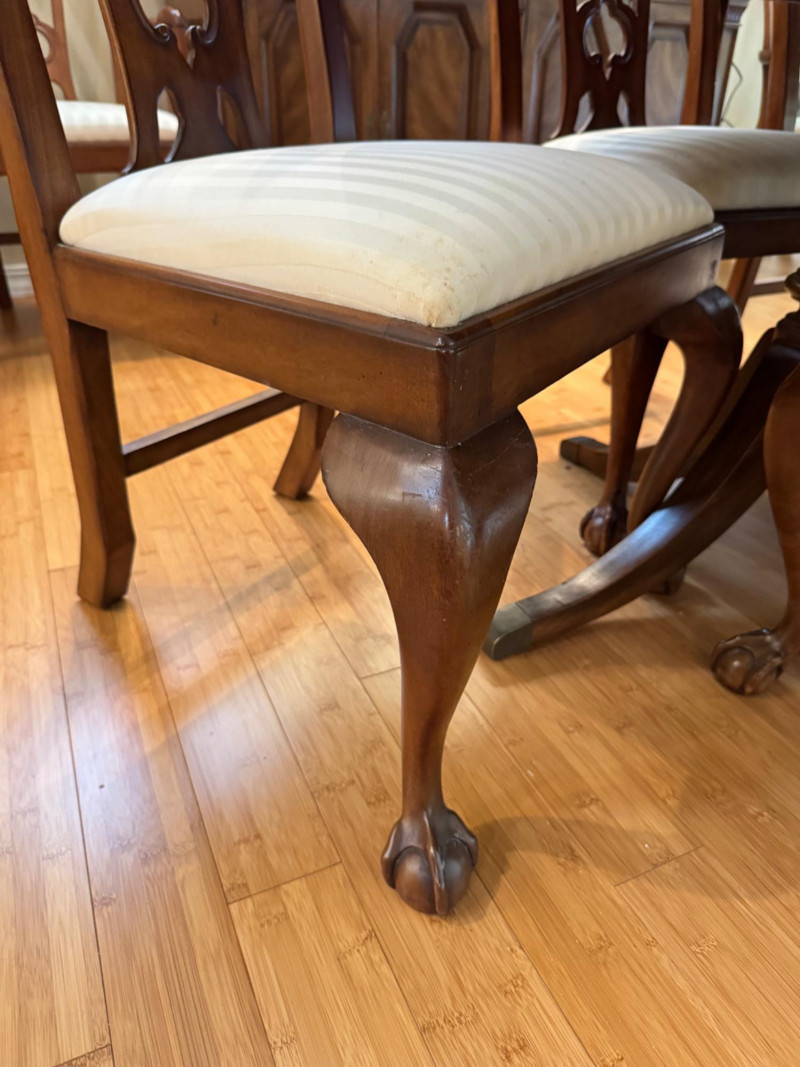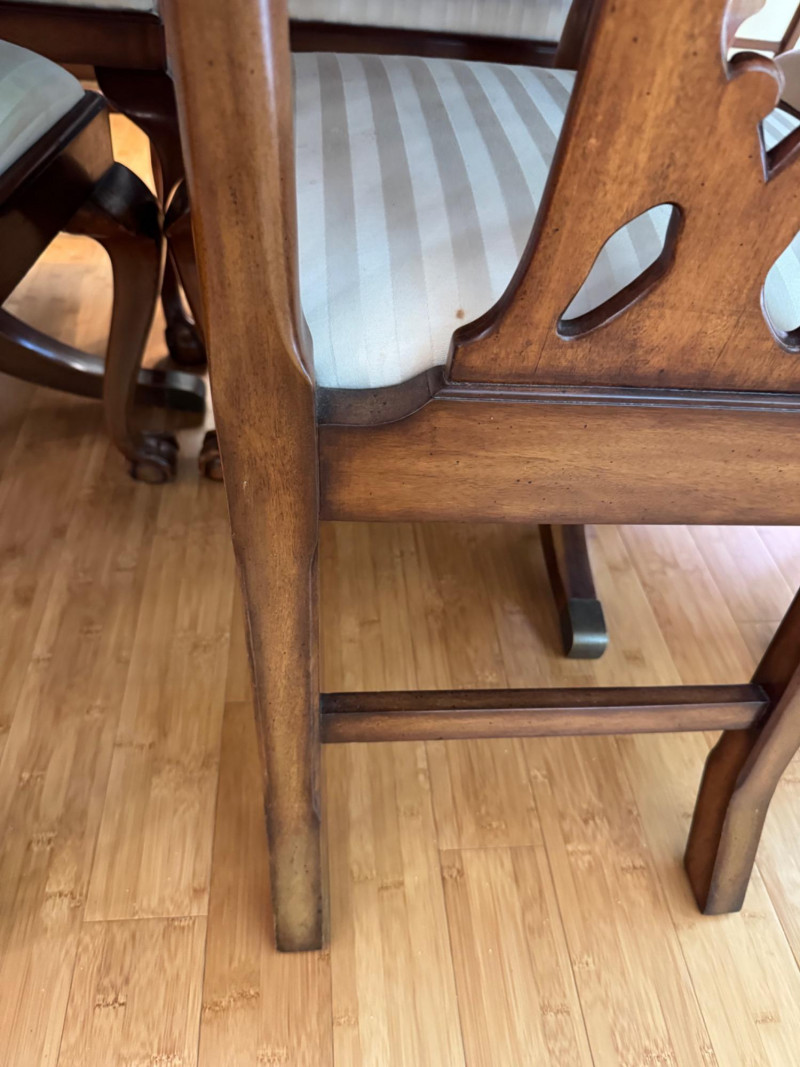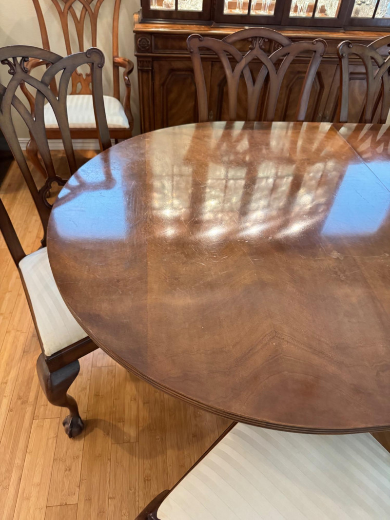 Heritage Dining Set – Extendable Table & 8 Chairs – Est. $4,000+ Bidding on this lot is an agreement that: (1.) You will have at least 2 capable, able bodied persons to lift and load at a minimum. (2.) You will bring a hand truck and/or any other tools needed to remove this item. If these steps are not followed your item will be forfeit and no refund given.