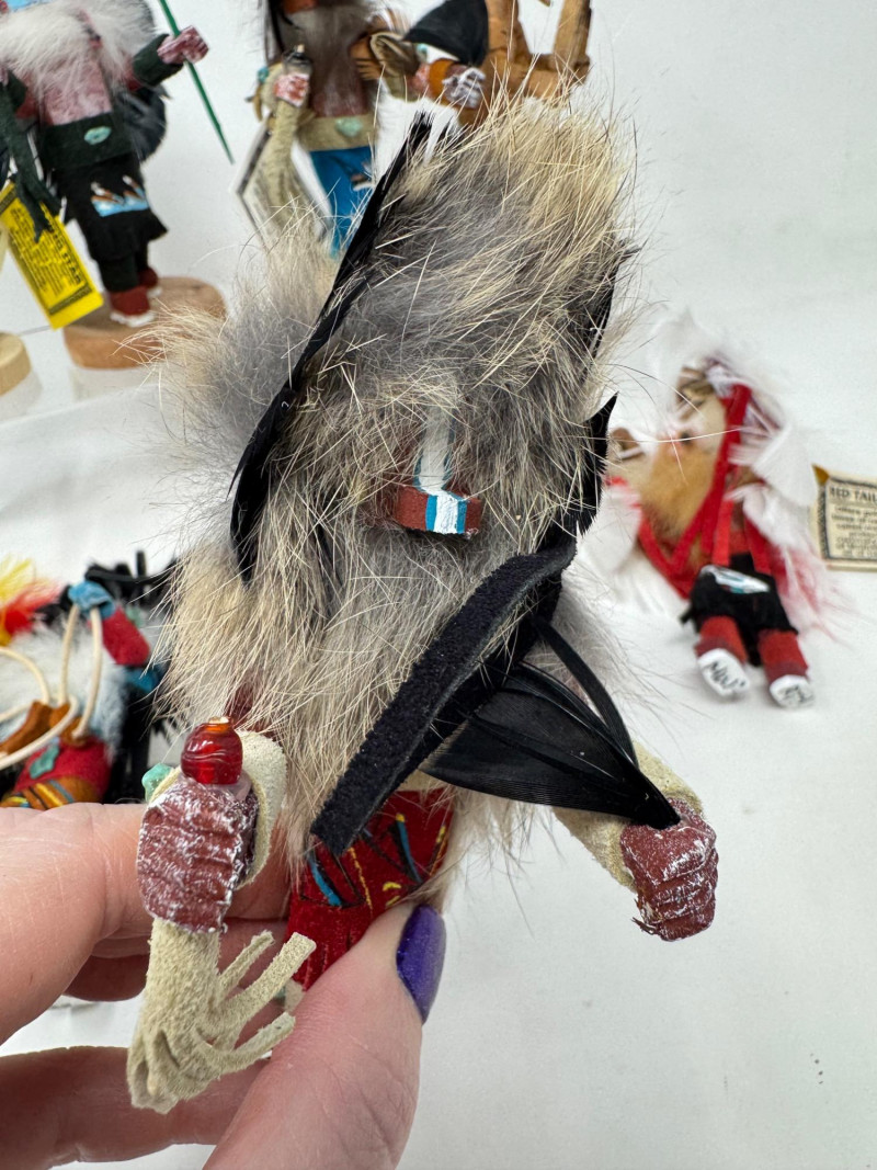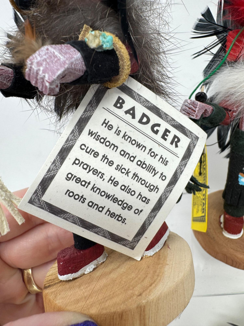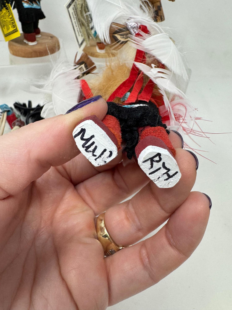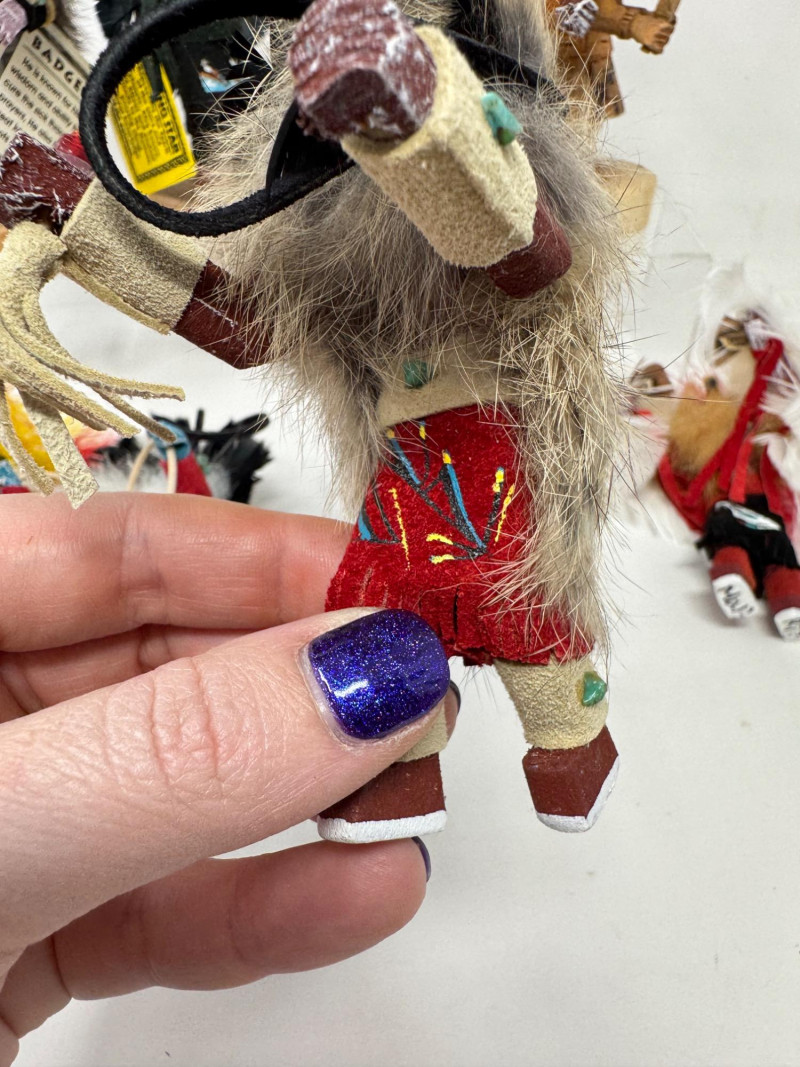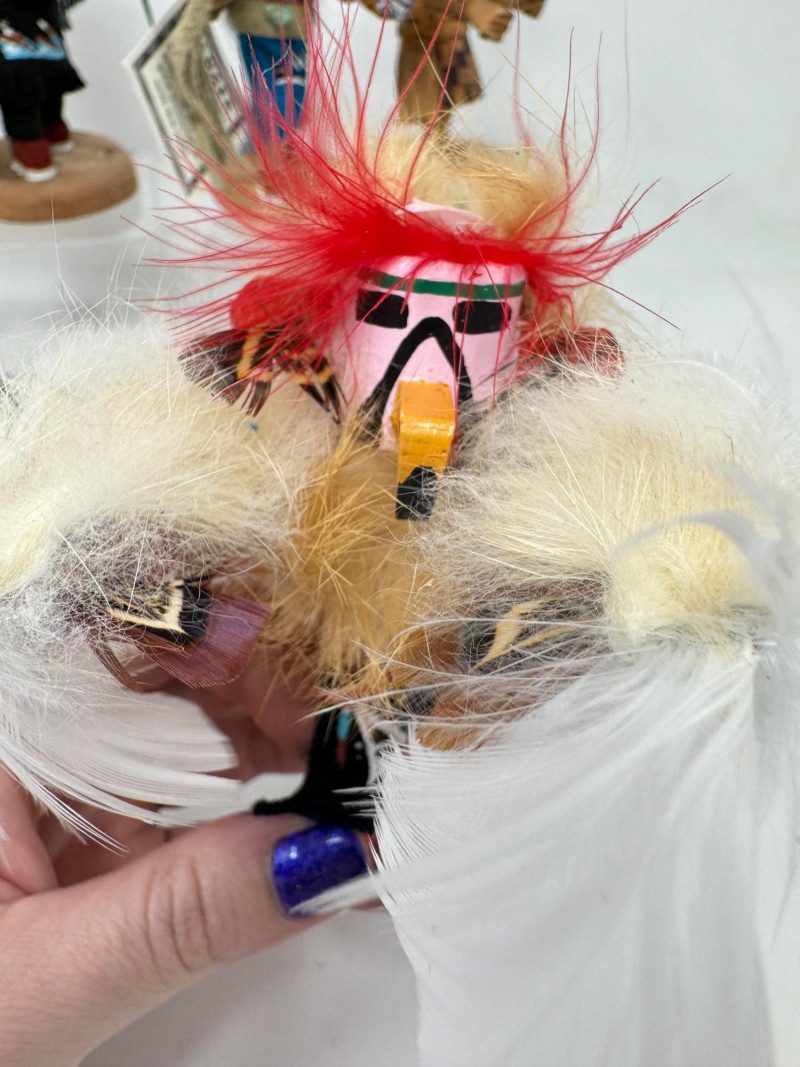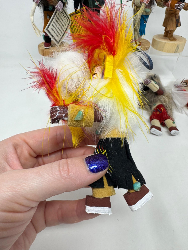 Set of 8 Small Native American Kachina Dolls & Ornaments. Lot of 8 handcrafted Kachina figures and ornaments, approx. 5" tall Includes signed pieces such as Chasing Star, Badger, Morning Singer (Platero), Red Tail Hawk, and Rainbow Made with mixed materials: wood, fur, feathers, and painted details One figure with yellow and red feathers needs arm repair Signed bases and tag descriptions included on several pieces