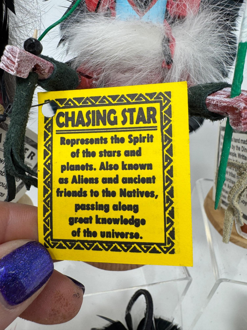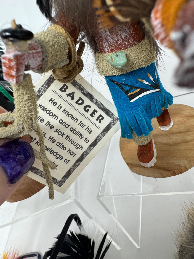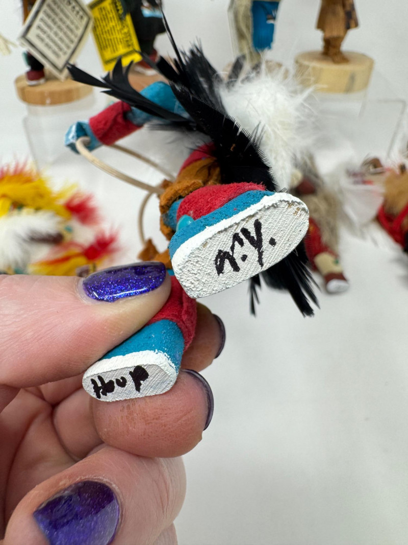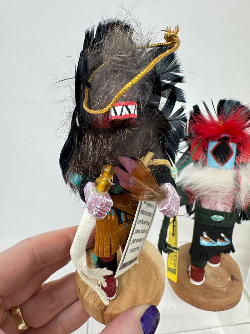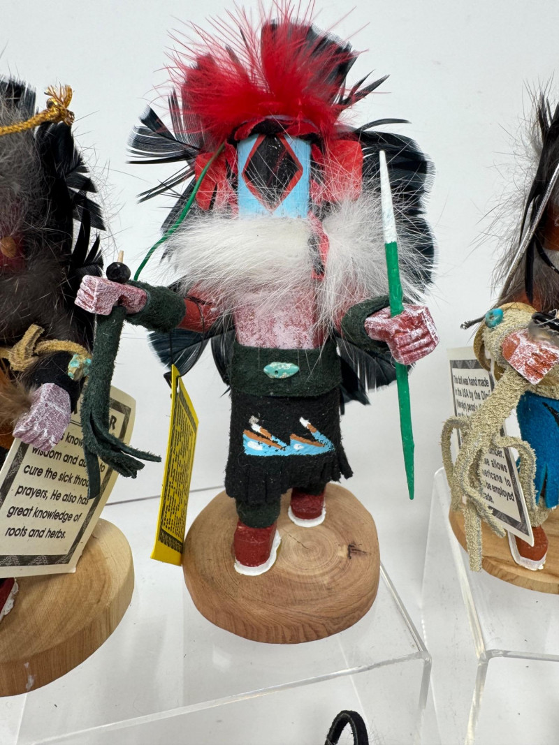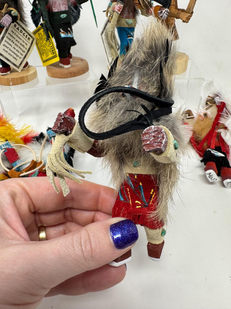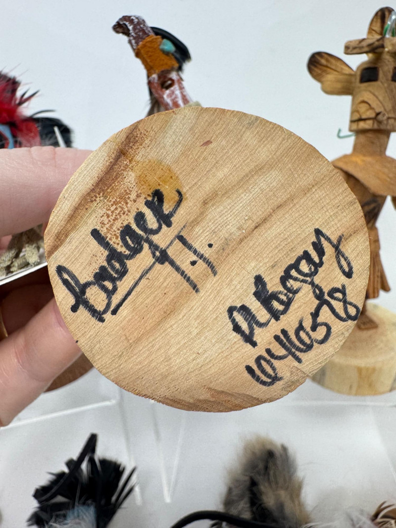 Set of 8 Small Native American Kachina Dolls & Ornaments. Lot of 8 handcrafted Kachina figures and ornaments, approx. 5" tall Includes signed pieces such as Chasing Star, Badger, Morning Singer (Platero), Red Tail Hawk, and Rainbow Made with mixed materials: wood, fur, feathers, and painted details One figure with yellow and red feathers needs arm repair Signed bases and tag descriptions included on several pieces