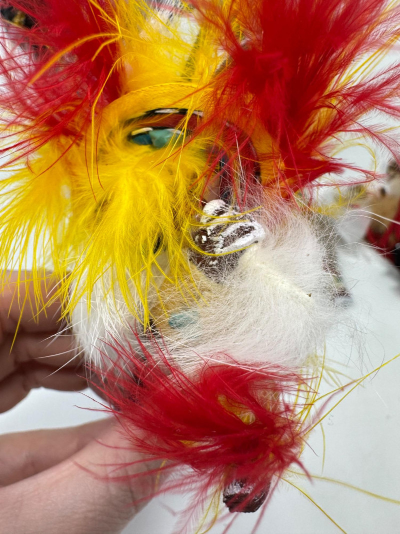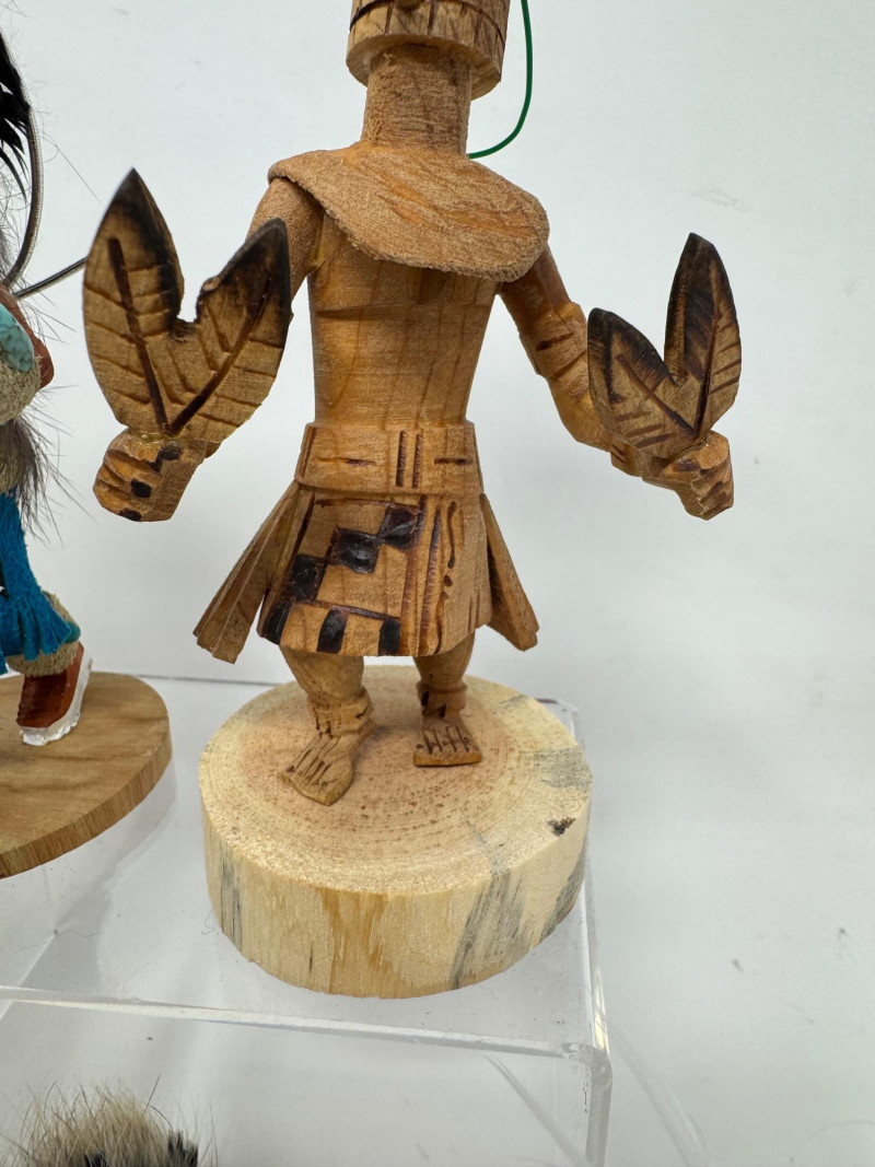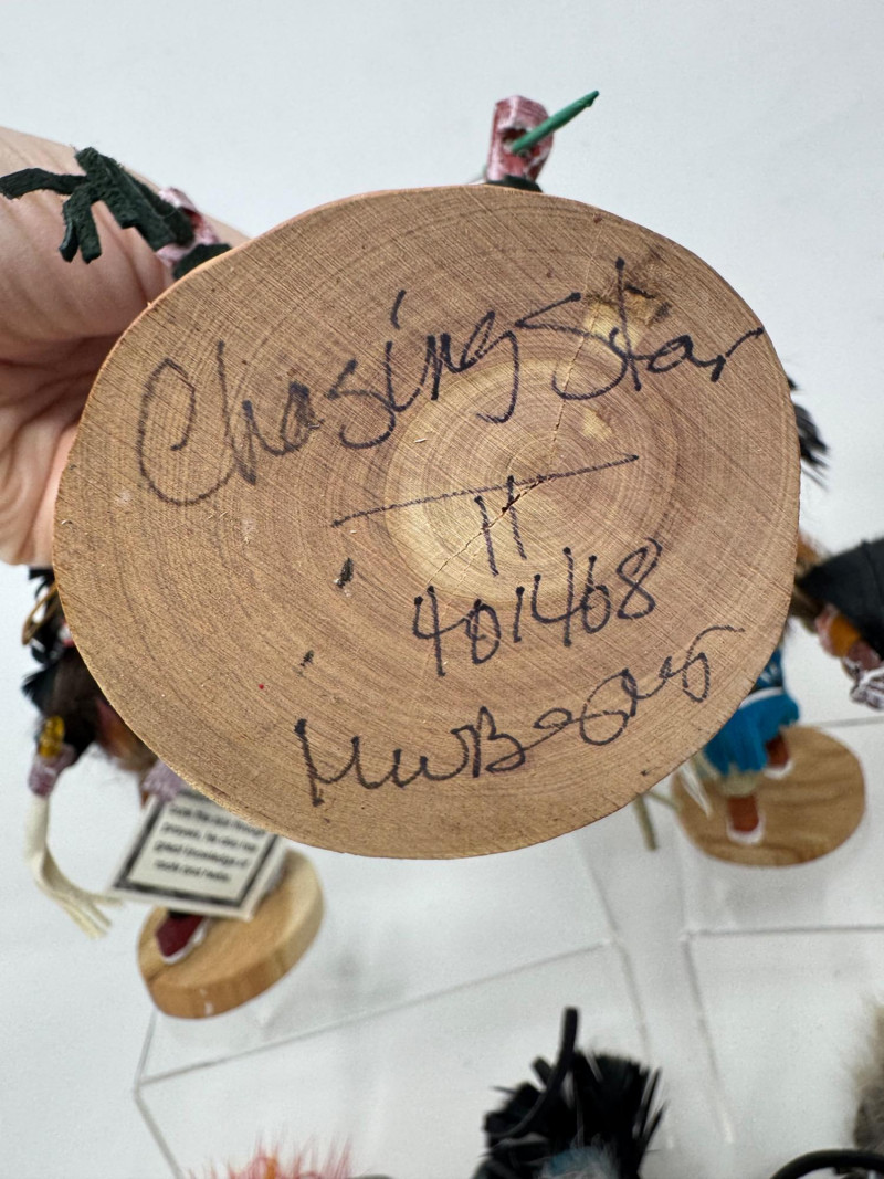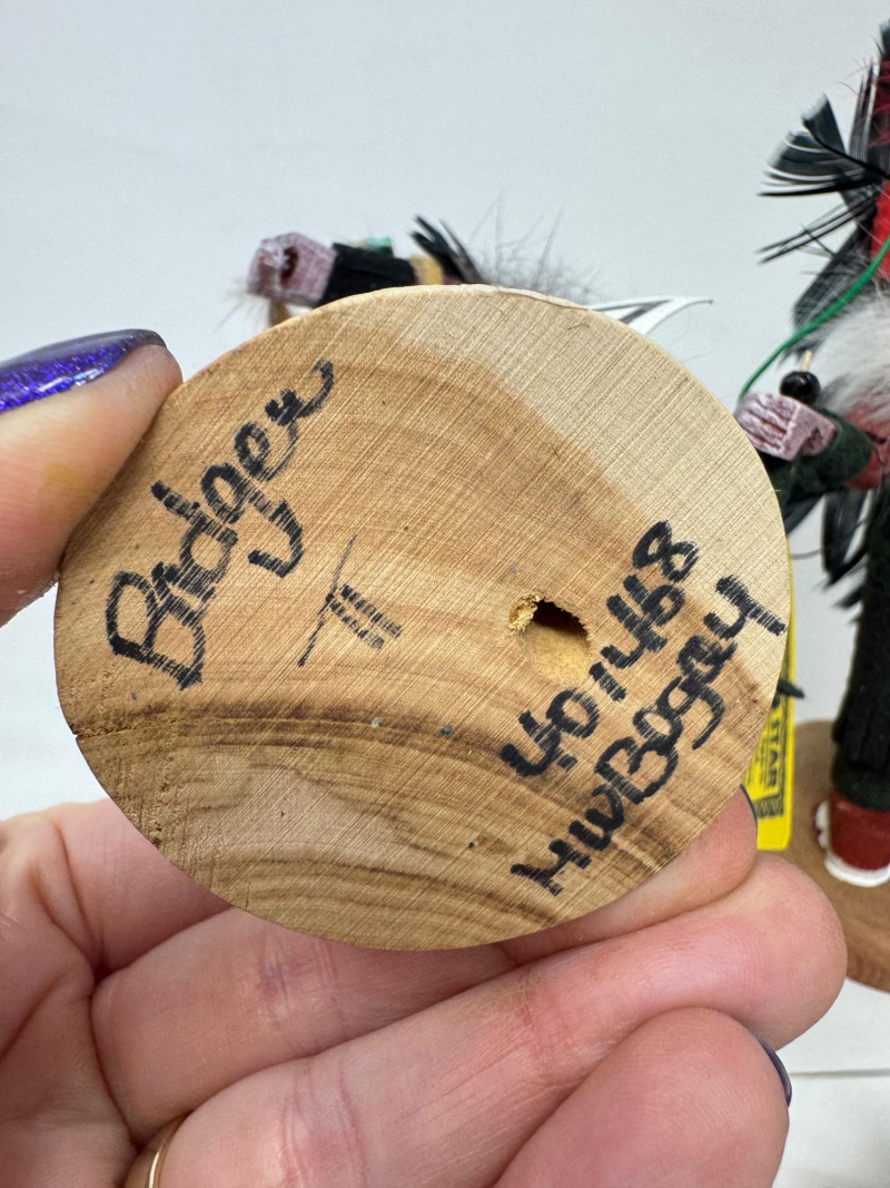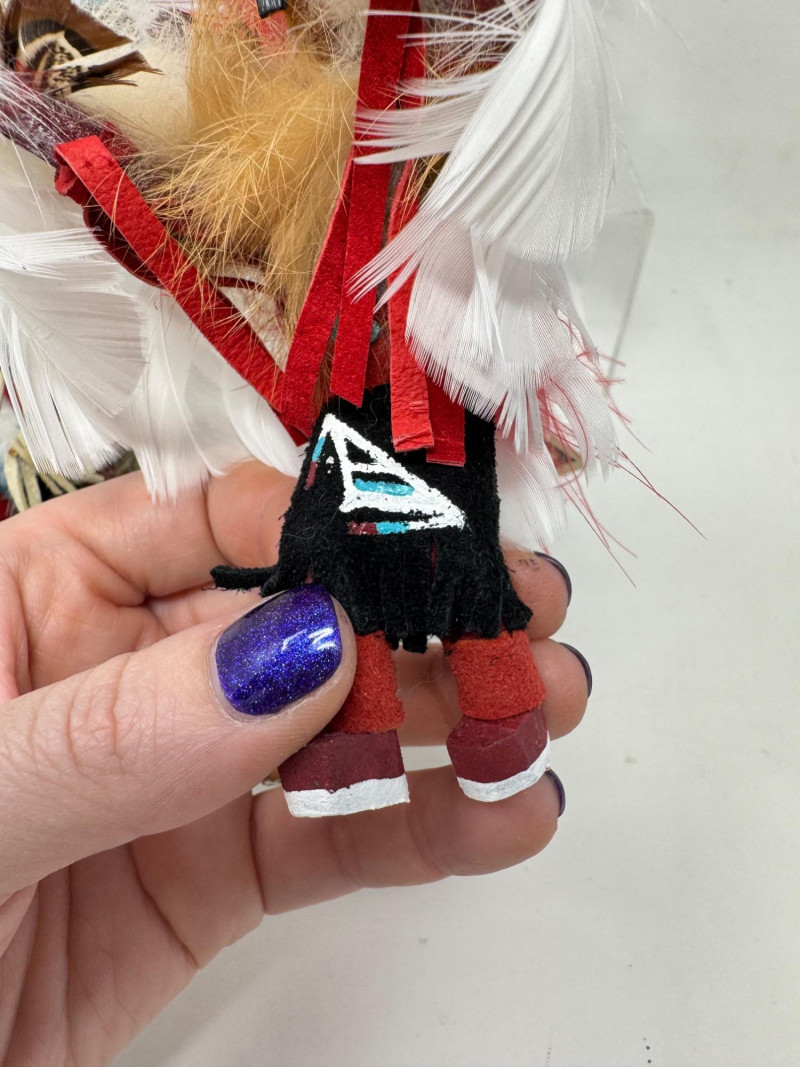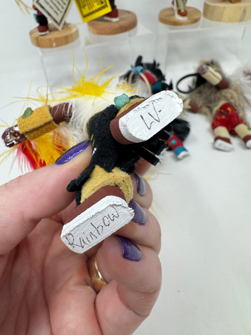 Set of 8 Small Native American Kachina Dolls & Ornaments. Lot of 8 handcrafted Kachina figures and ornaments, approx. 5" tall Includes signed pieces such as Chasing Star, Badger, Morning Singer (Platero), Red Tail Hawk, and Rainbow Made with mixed materials: wood, fur, feathers, and painted details One figure with yellow and red feathers needs arm repair Signed bases and tag descriptions included on several pieces