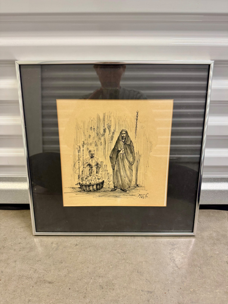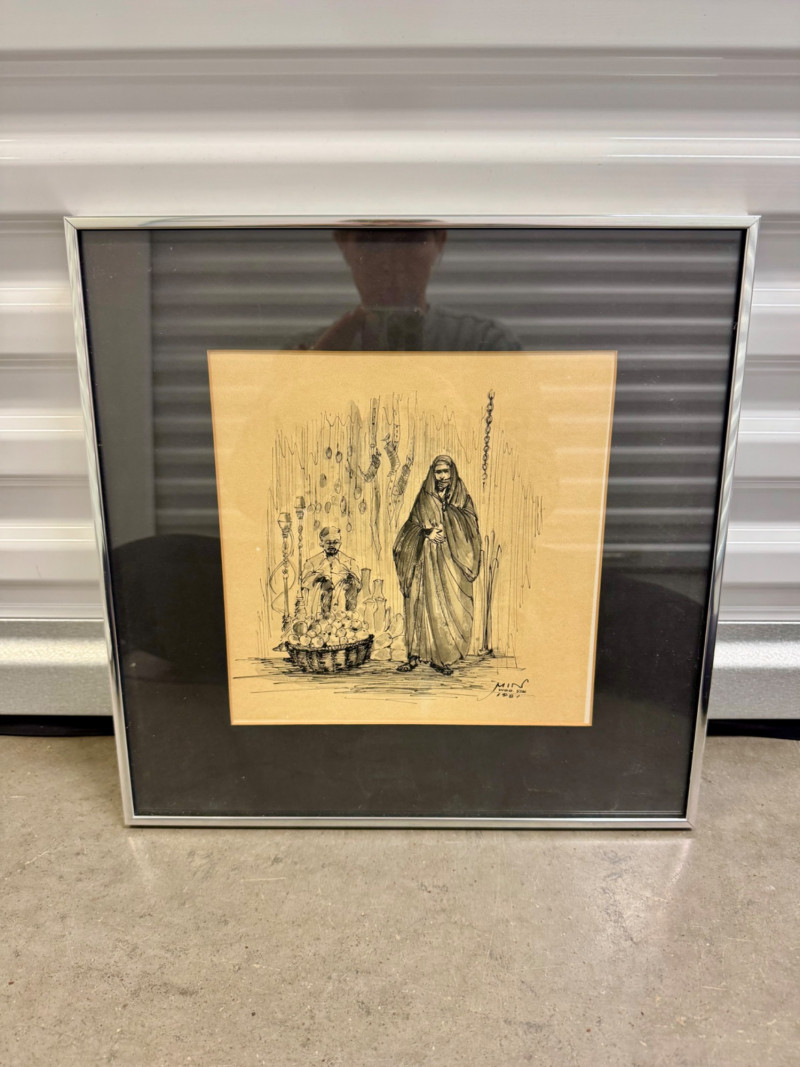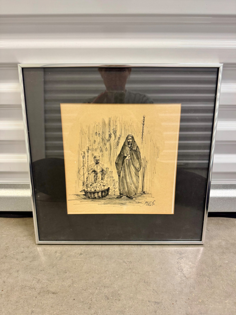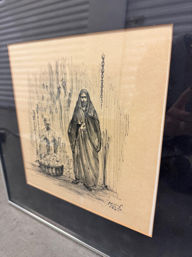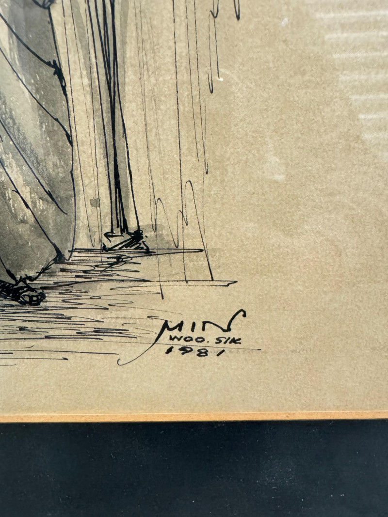 1981 Ink Drawing By Min Woo Sik – Framed Market Scene.