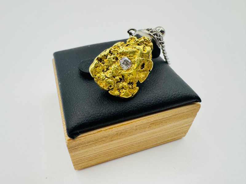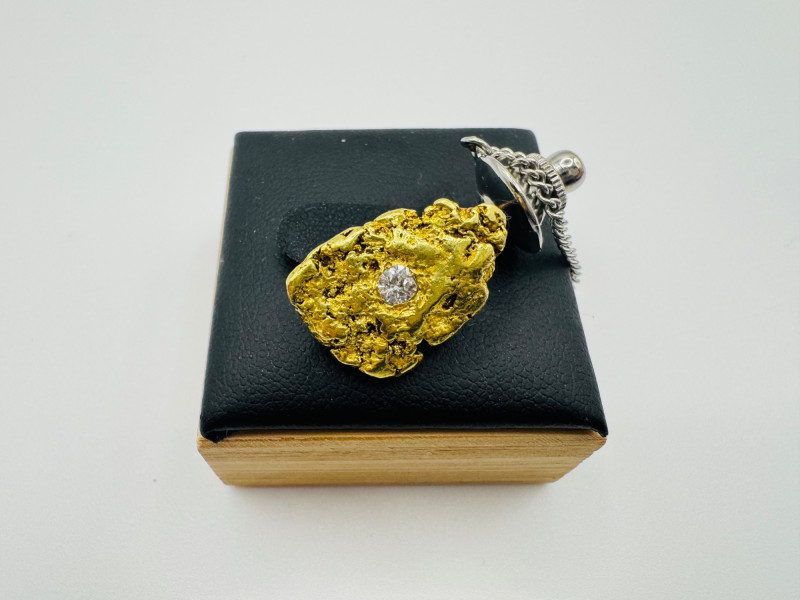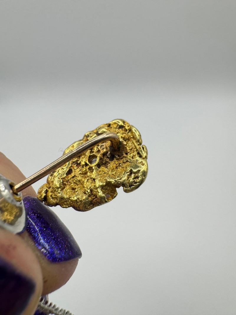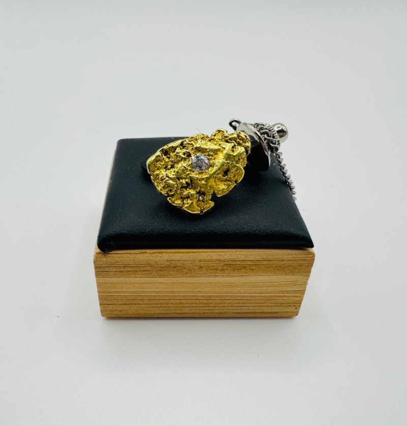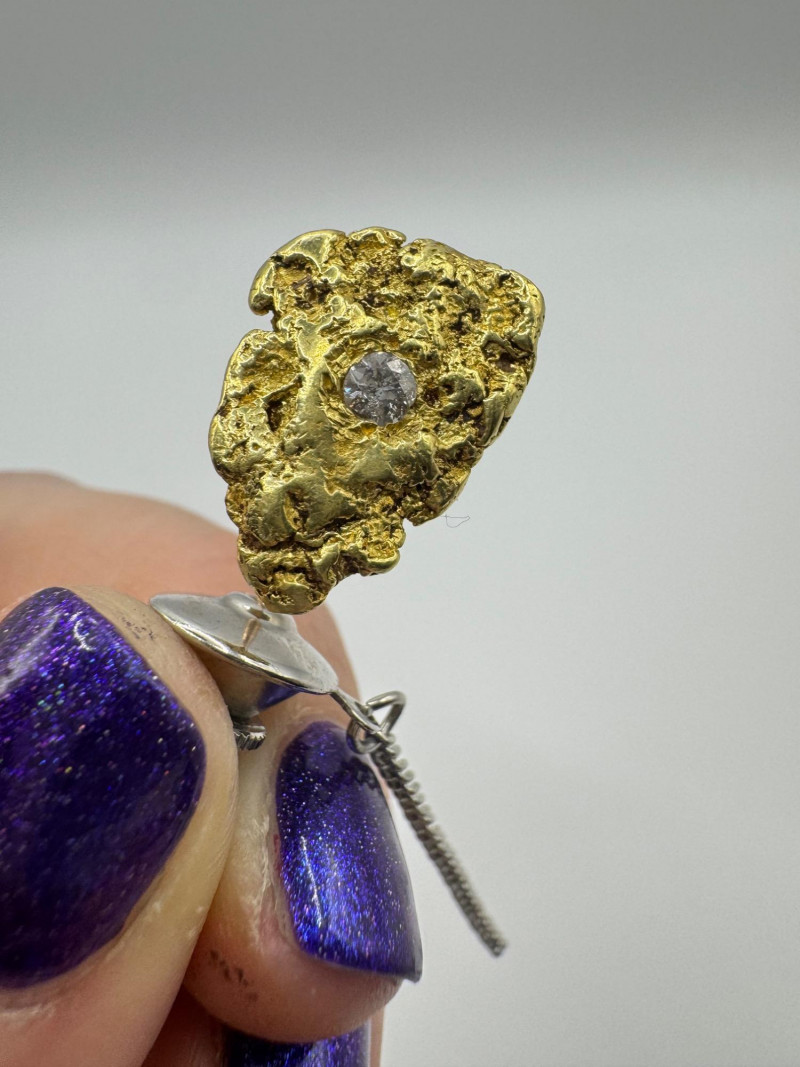 18K Gold Nugget Pin w/ Diamond Accent – 4.82g. 18K gold nugget-style pin, acid tested and help up to 18K Weight: approx. 4.82 grams (pin only, backing not included) Diamond accent set in natural gold nugget design Includes metal backing (not part of gold weight)