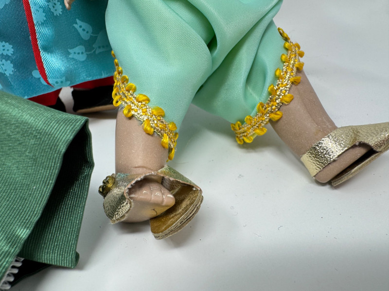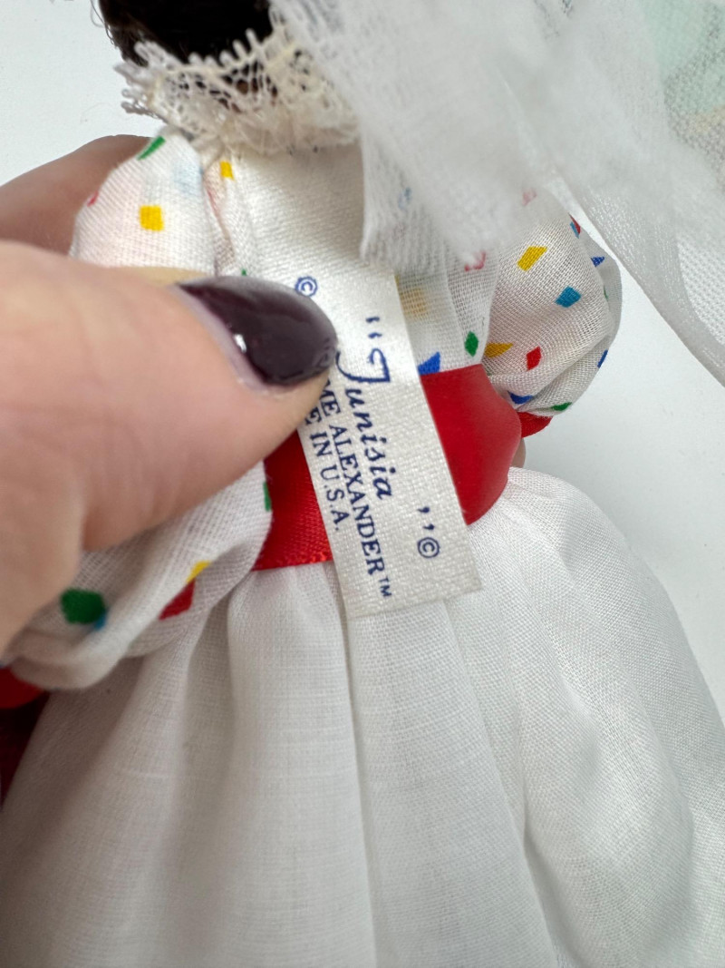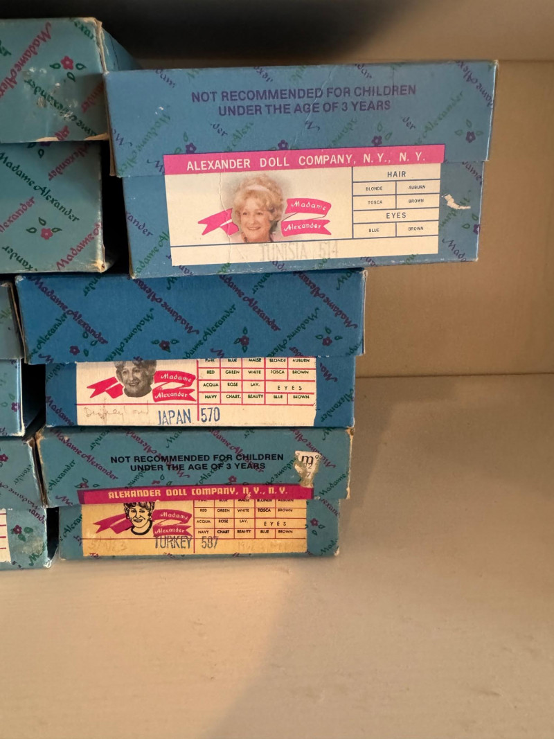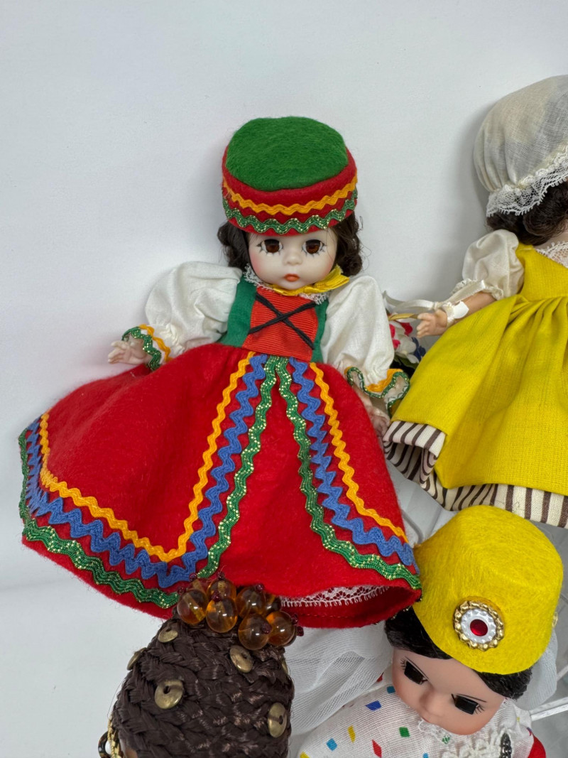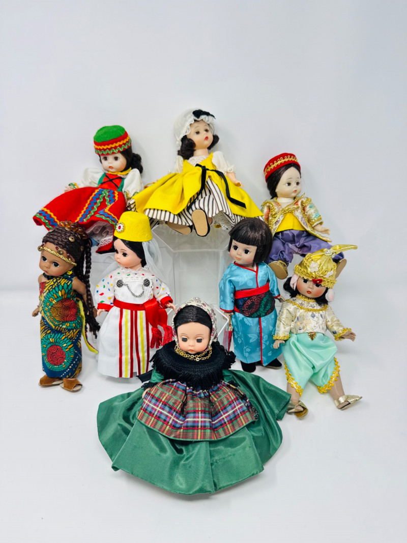 Madame Alexander “Around the World” Dolls w/ Boxes – Set #4. Collection of 8 Madame Alexander dolls from the Around the World series. Includes dolls representing France (1020), Tunisia (514), Japan (570), Turkey (587), Thailand (567), Czechoslovakia, Ibiza, and French. Each doll stands approximately 7.5 inches tall. All come with their original boxes, which show minor shelf or age wear. Condition notes: Thailand doll has a shoe that needs repair. Light general wear consistent with age; clothing and hair remain vibrant and intact.