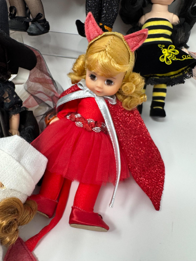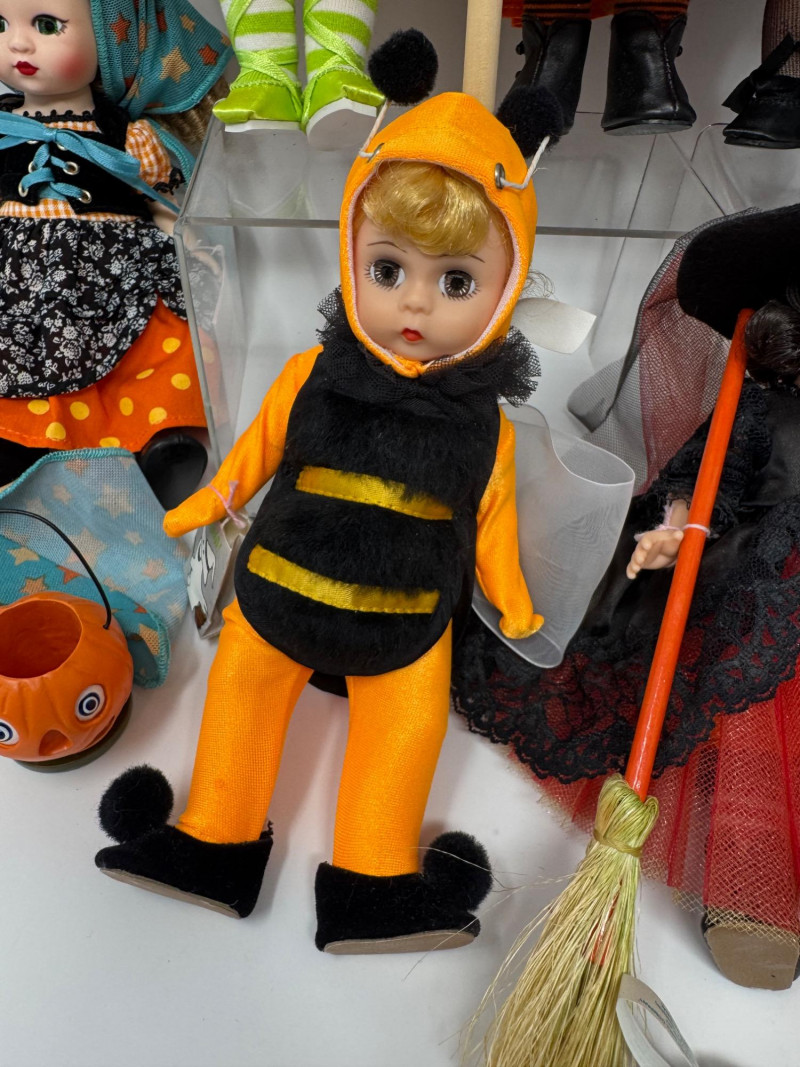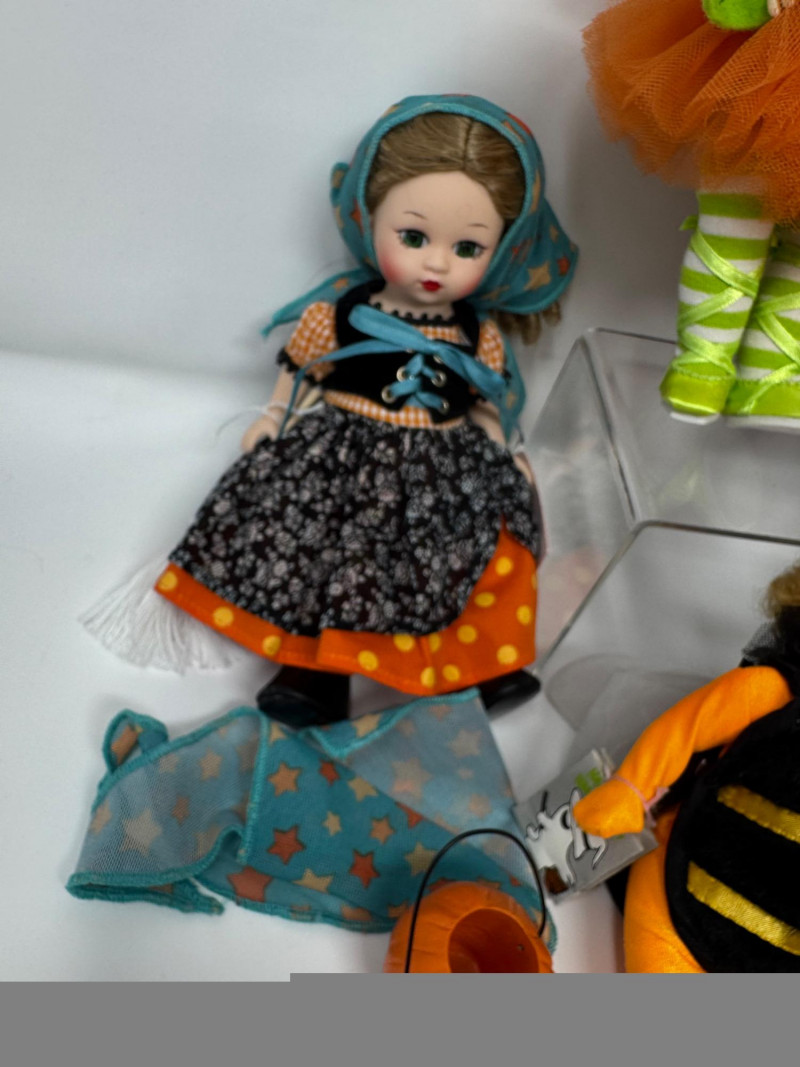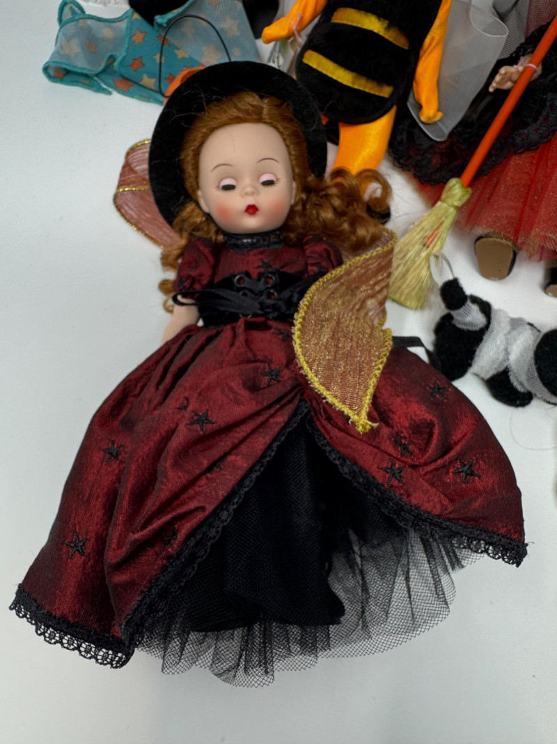 Trick or Chic – Madame Alexander Halloween Doll Collection. Two dolls are without boxes. Adorable mix of witches, bees, owls, and fairytale characters, perfect for a festive Halloween display.