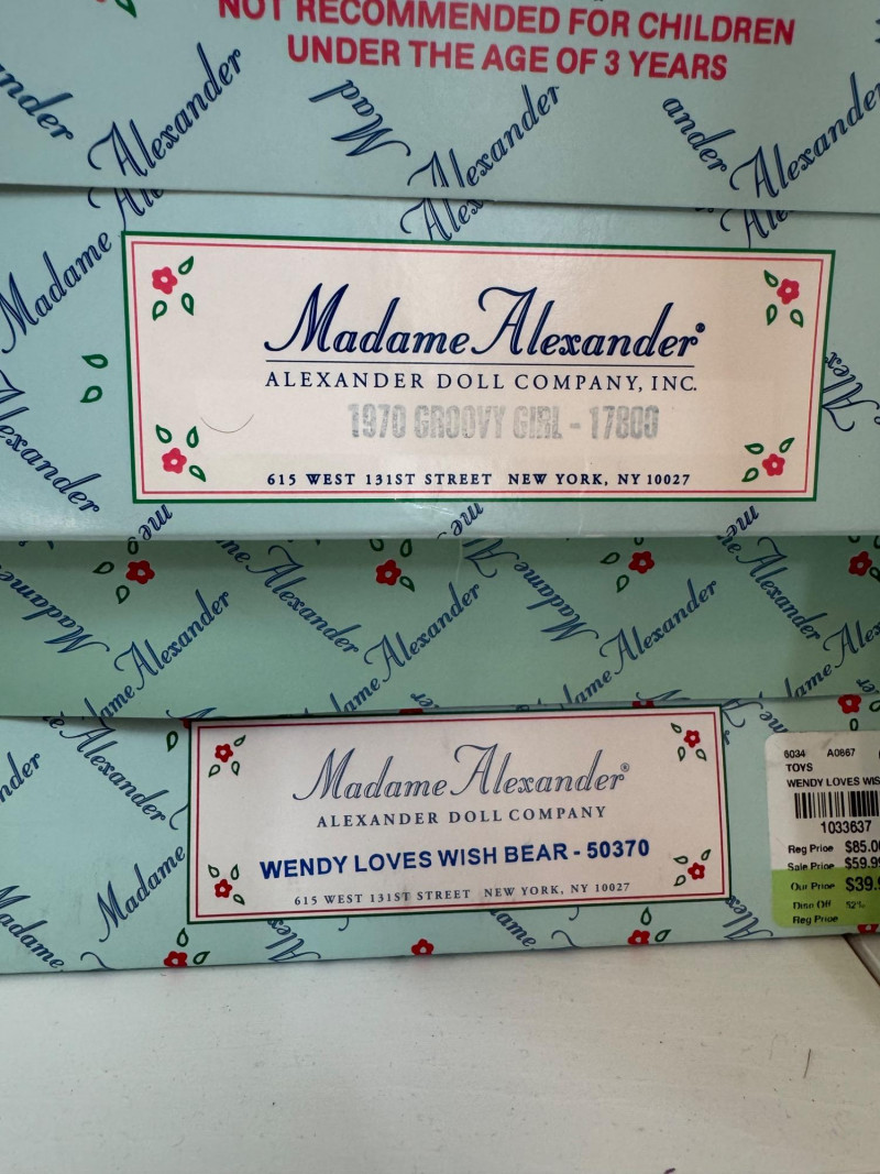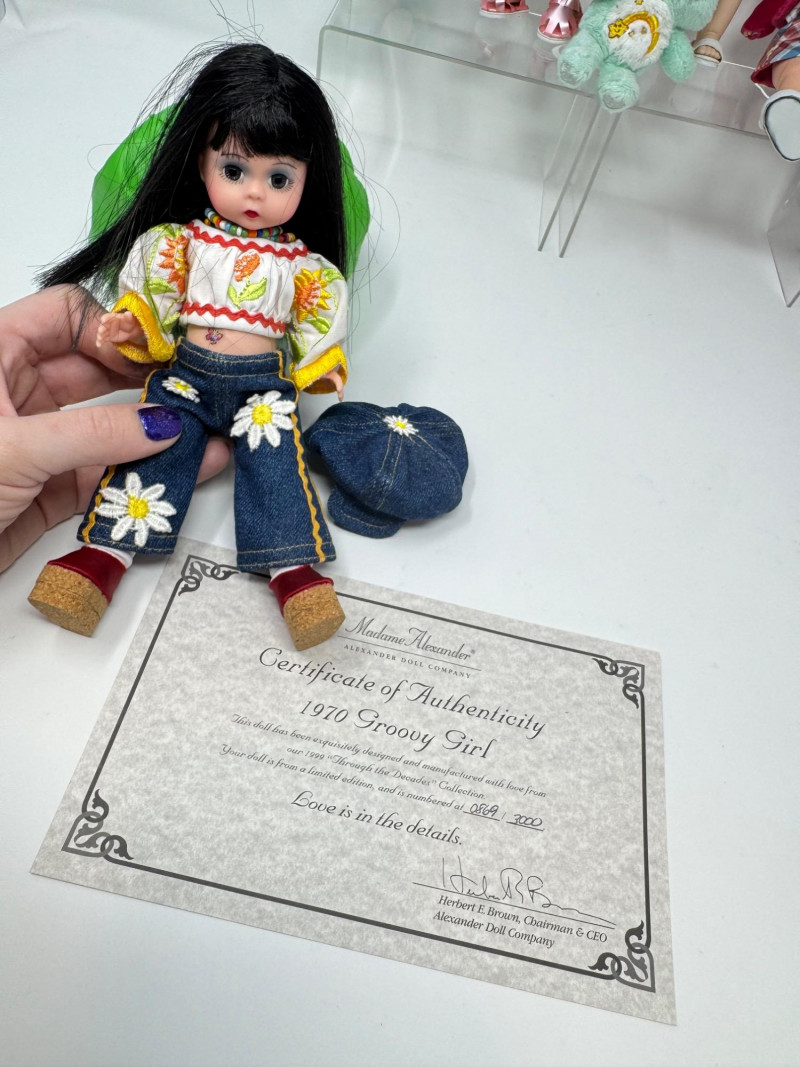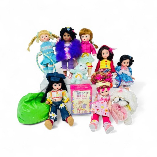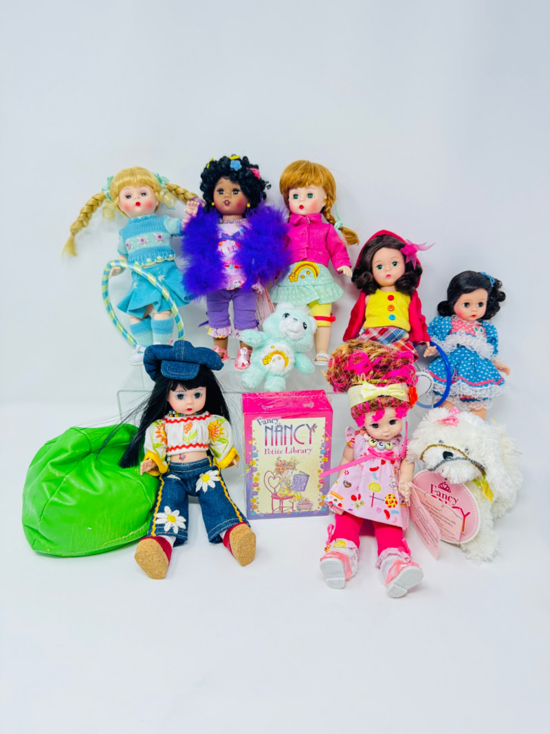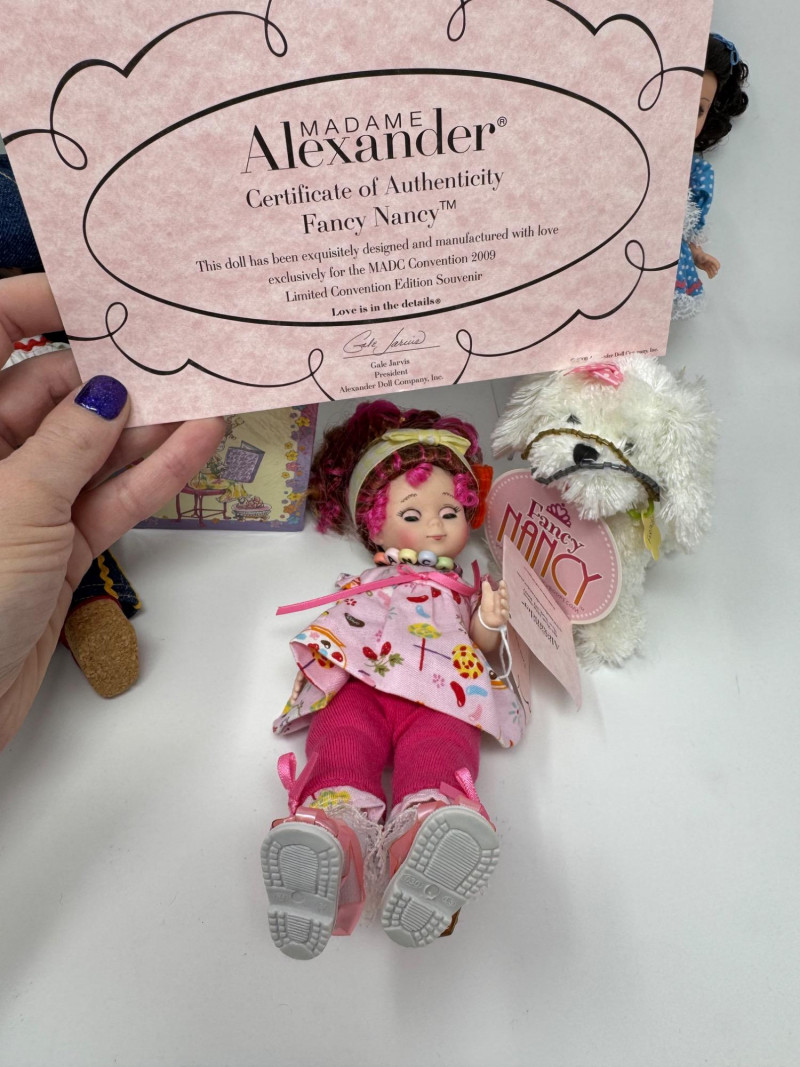 Lot of 7 Madame Alexander Dolls w/ Fancy Nancy & COAs. Dolls identified include: Fancy Nancy, 1970 Groovy Girl, Wendy Loves Wish Bear, Hula Hoop Cutie, Bree, Wendy Goes Sightseeing, and others Two dolls include Certificates of Authenticity: Fancy Nancy – 2009 MADC Limited Convention Edition 1970 Groovy Girl – “Through the Decades” Collection, limited to 3000 pcs Includes Fancy Nancy Petite Library book set (sealed) All dolls have original boxes except Wendy Goes Sightseeing. Accessories include a plush dog and green bean bag (bean bag material starting to disintegrate).