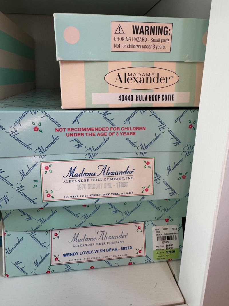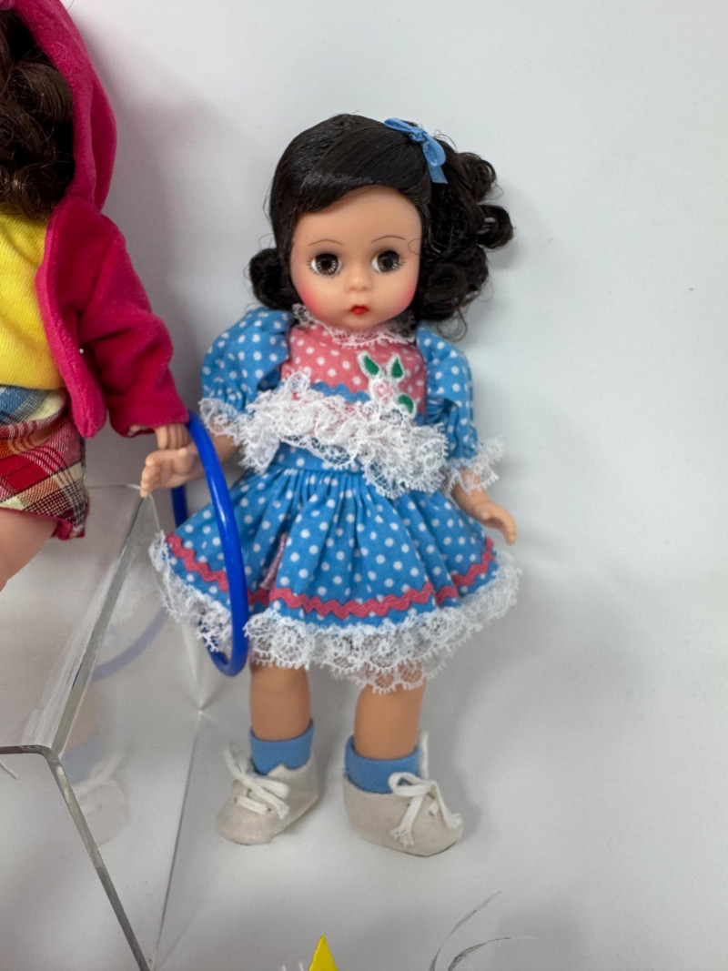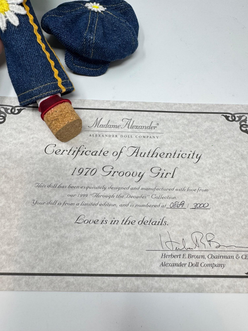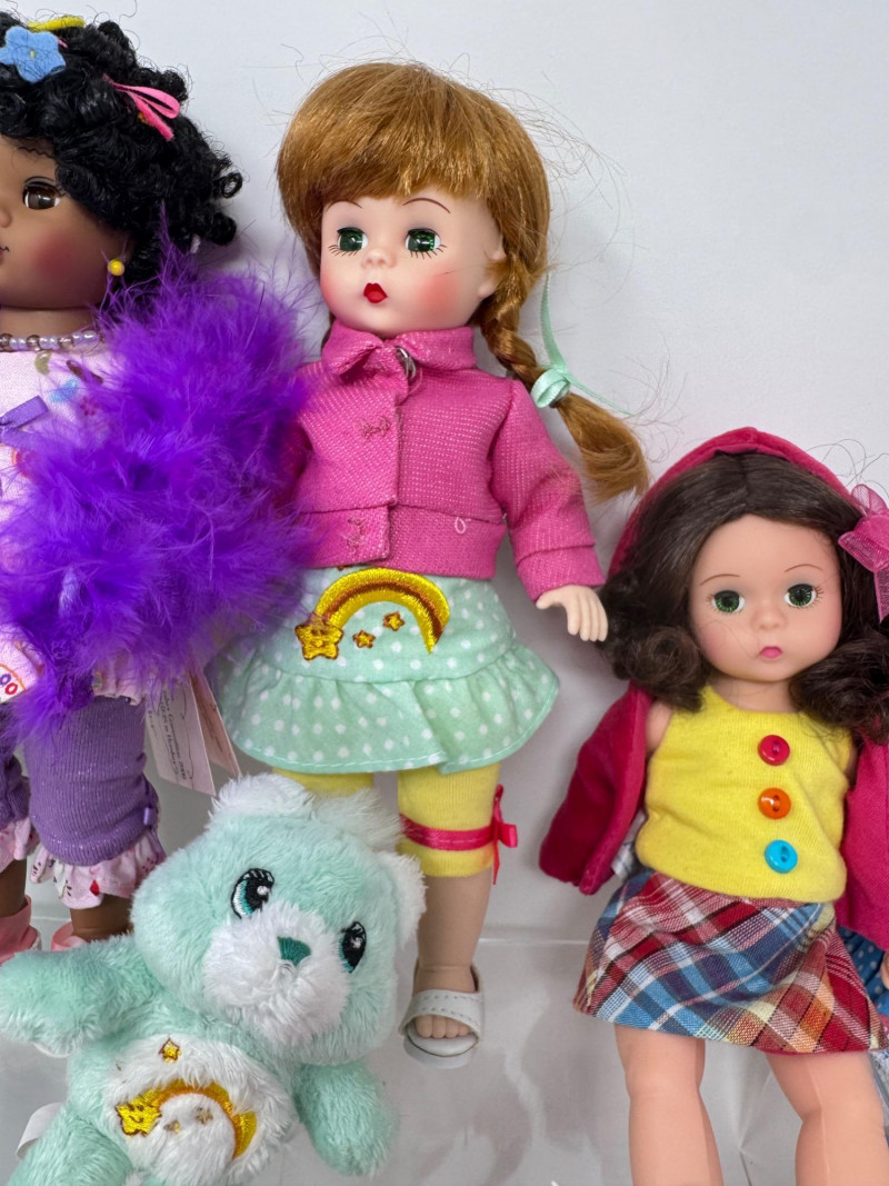 Lot of 7 Madame Alexander Dolls w/ Fancy Nancy & COAs. Dolls identified include: Fancy Nancy, 1970 Groovy Girl, Wendy Loves Wish Bear, Hula Hoop Cutie, Bree, Wendy Goes Sightseeing, and others Two dolls include Certificates of Authenticity: Fancy Nancy – 2009 MADC Limited Convention Edition 1970 Groovy Girl – “Through the Decades” Collection, limited to 3000 pcs Includes Fancy Nancy Petite Library book set (sealed) All dolls have original boxes except Wendy Goes Sightseeing. Accessories include a plush dog and green bean bag (bean bag material starting to disintegrate).