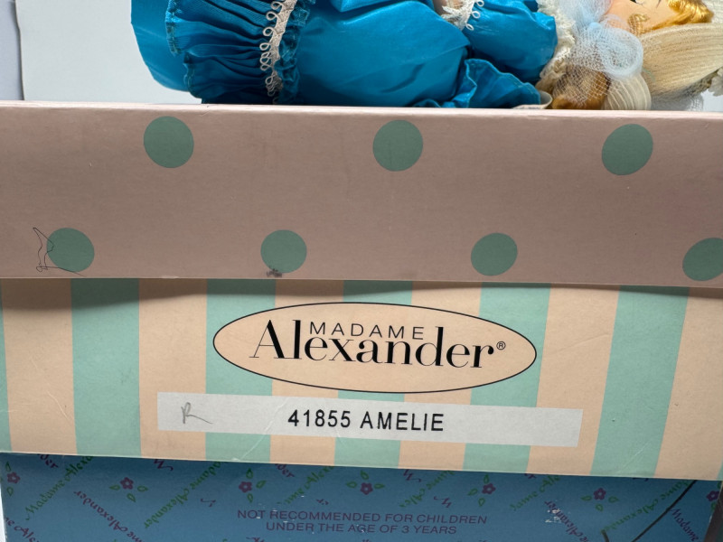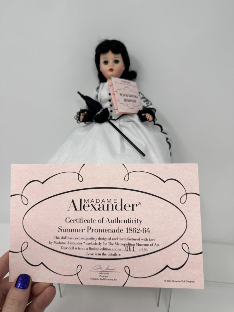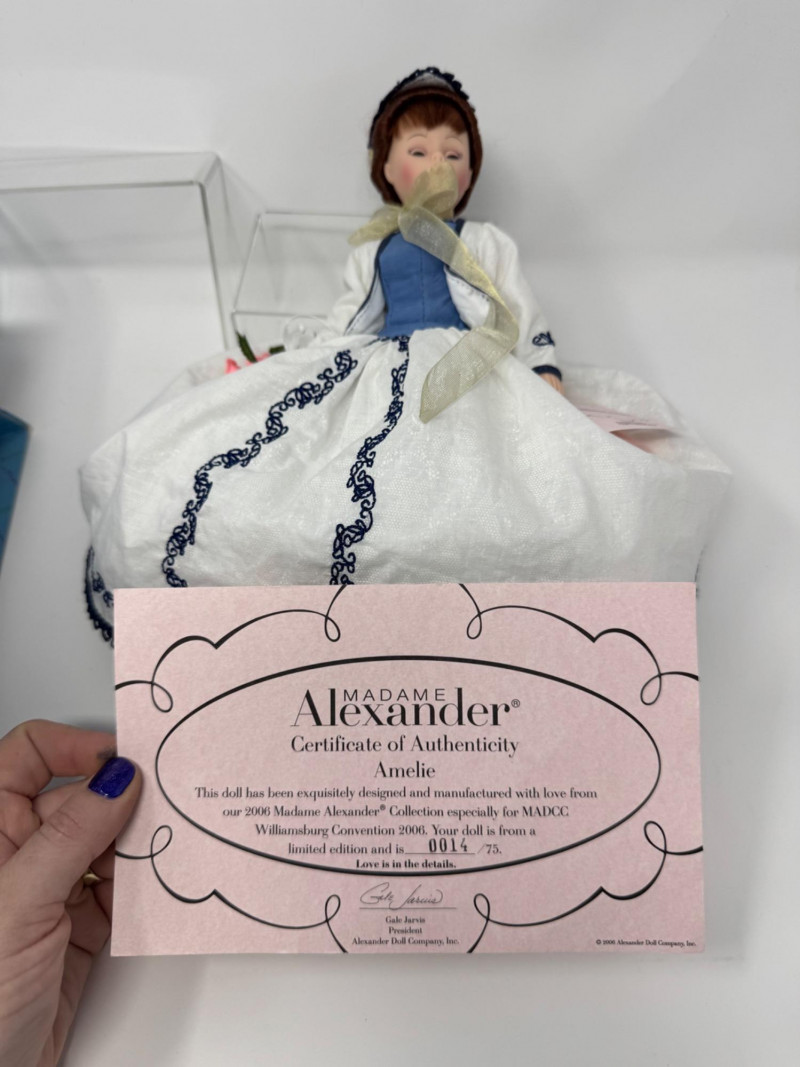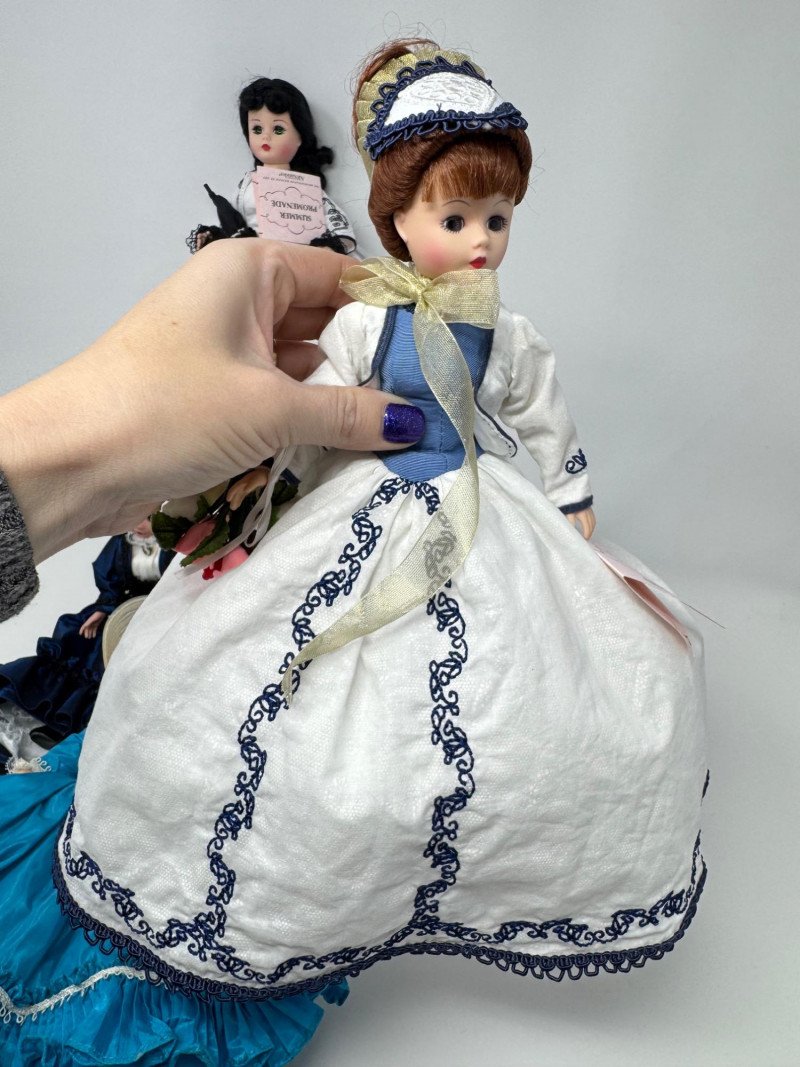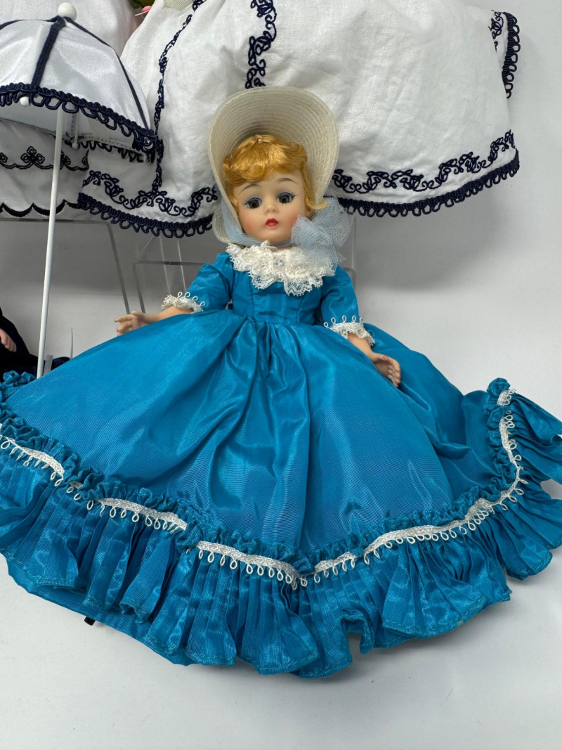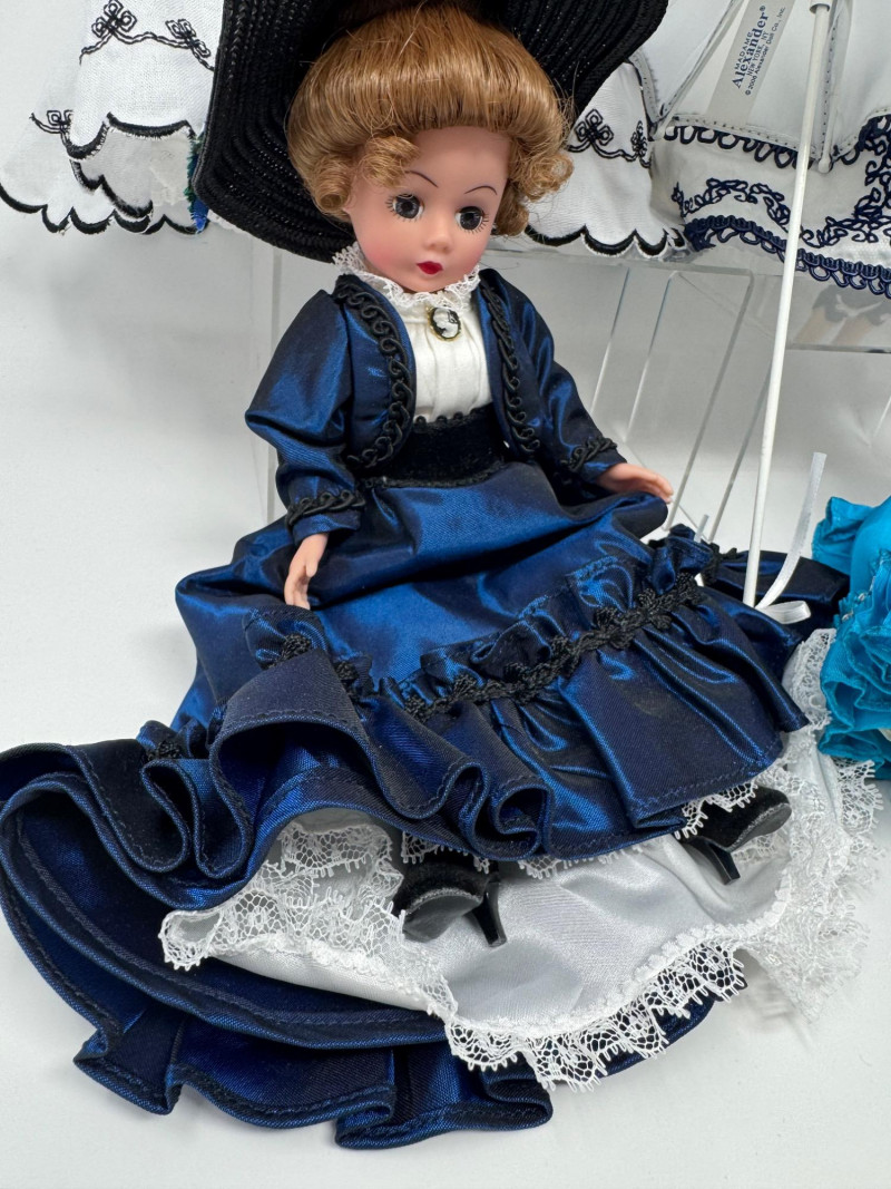 Madame Alexander Victorian Gown Dolls – Summer Promenade & More. Collection of 4 Madame Alexander dolls dressed in detailed Victorian and 19th-century gowns Includes: Summer Promenade 1862–64 – Limited Edition (2013, for The Met Museum of Art) Amelie – Limited Edition (2006 MADCC Williamsburg Convention) Gibson Girl – Classic turn-of-the-century navy gown with hat and lace trim Melinda – Early Madame Alexander design in bright blue gown, tag present (no box)