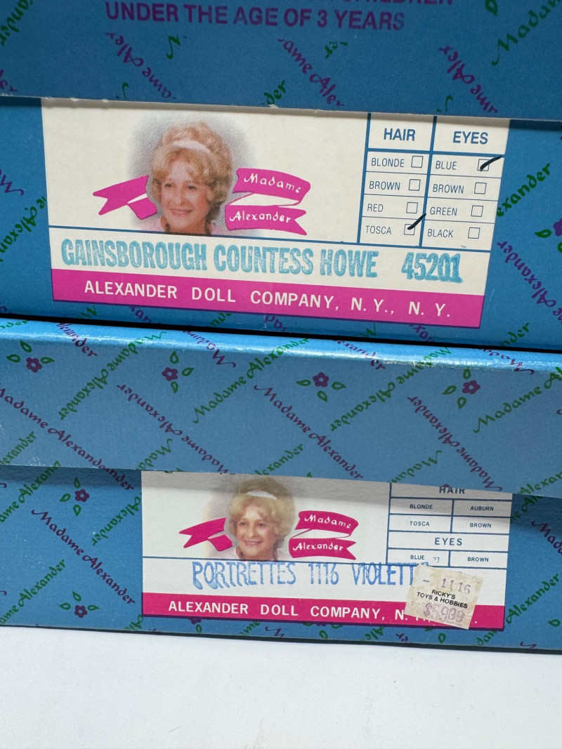 Madame Alexander Gown Dolls – Camille, Nicole, Violet & Gainsborough. Includes: Camille (41850) – 2006 Limited Edition Nicole (1129) Portraits 1116 Violet Gainsborough Countess Howe (45201) Original boxes and tags, all marked Made in U.S.A.