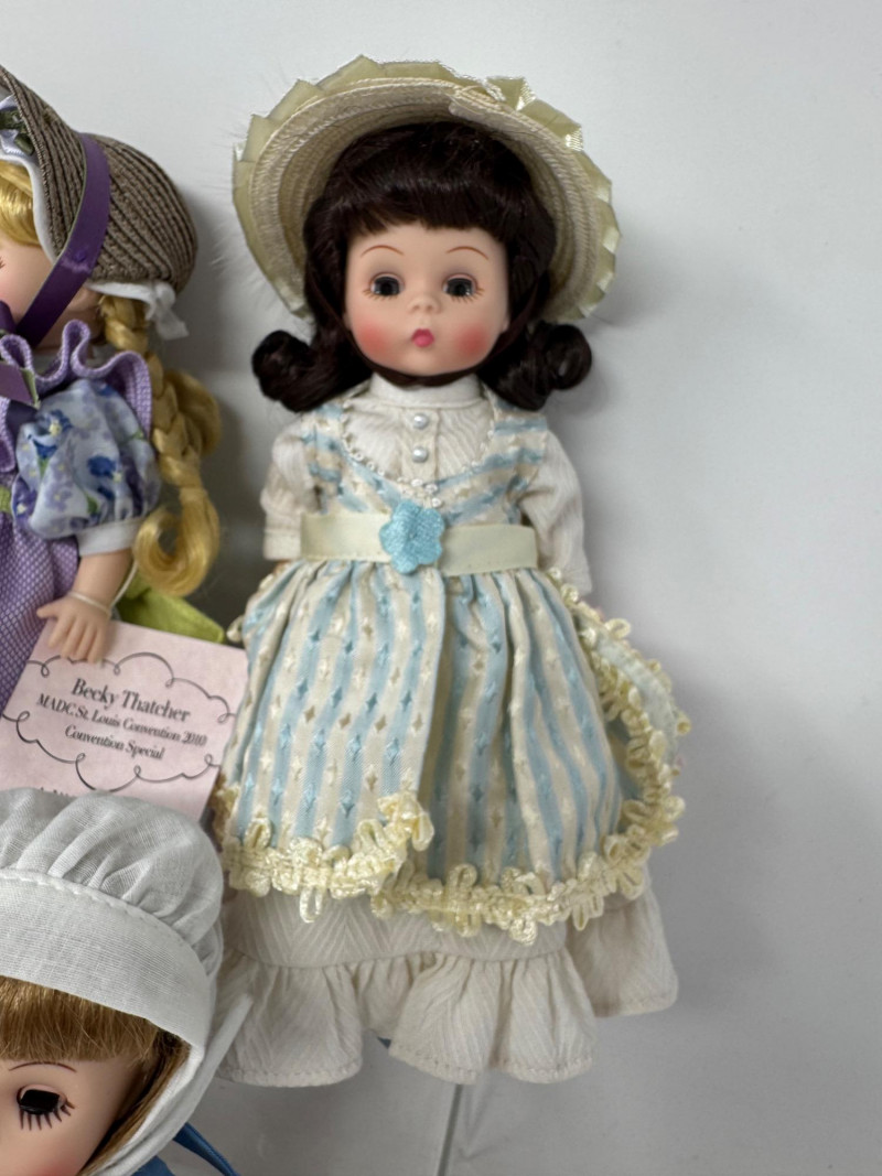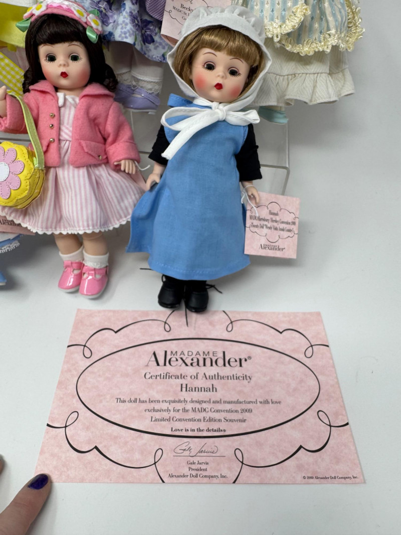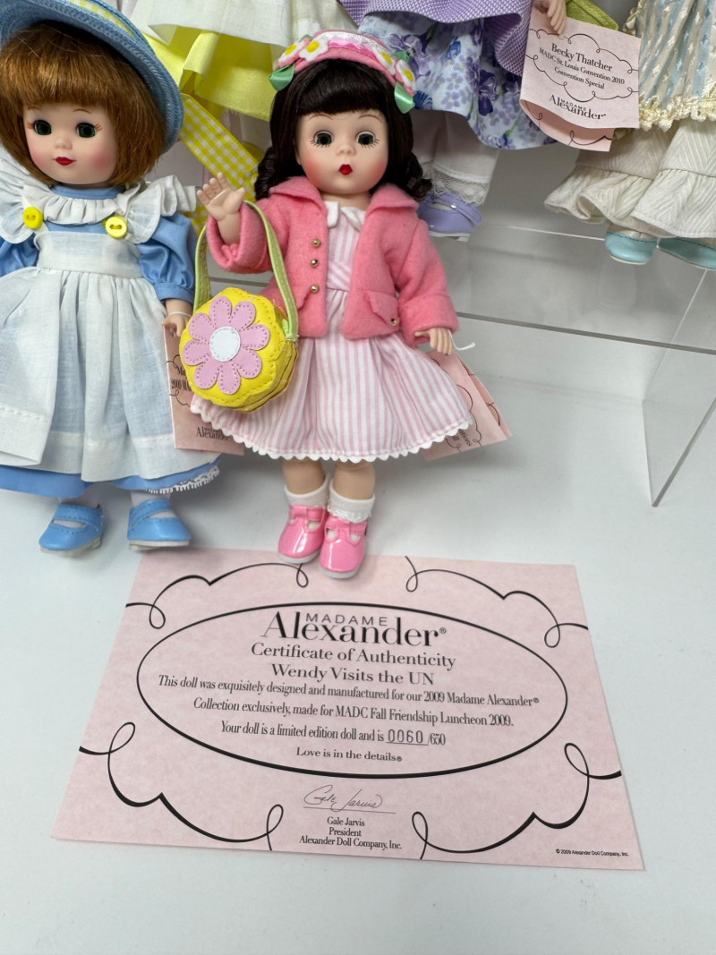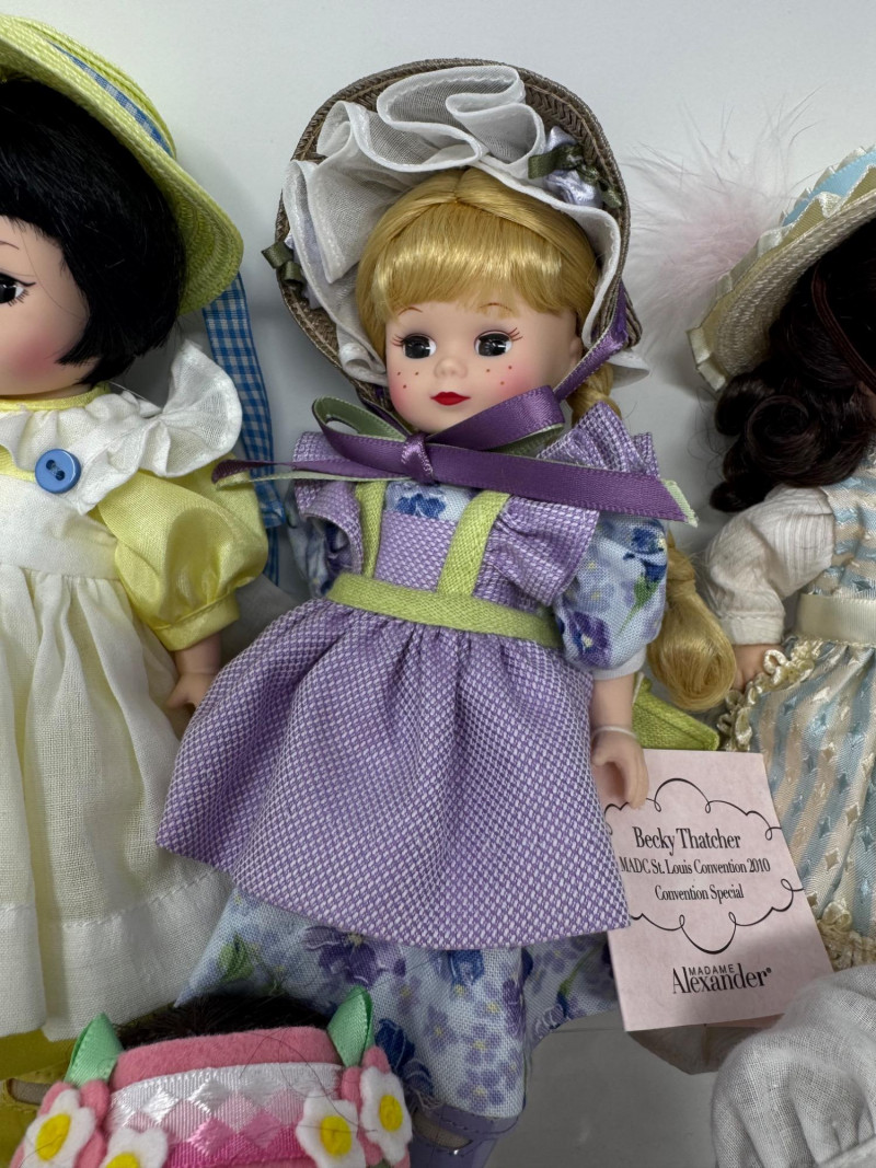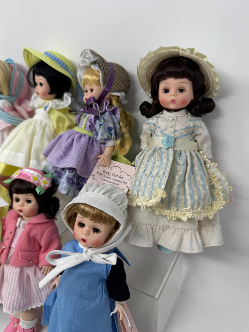 Madame Alexander 8” Dolls – Maypole Merriment, Becky & More Est. $500+ Limited-edition and convention exclusives from 2008–2010 MADC events Includes: Maypole Merriment Courtney – 2008 MADC Premiere Banquet Centerpiece – valued $200+ Maypole Merriment Caitlin – 2008 MADC Premiere Banquet Souvenir – valued $100+ Becky Thatcher – 2010 MADC St. Louis Convention Special – valued $140+ Wendy Visits the UN – 2009 MADC Fall Friendship Luncheon Hannah – 2009 MADC Convention Souvenir Plus two additional early-style Wendy dolls in bonnets and lace dresses