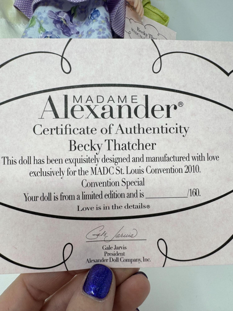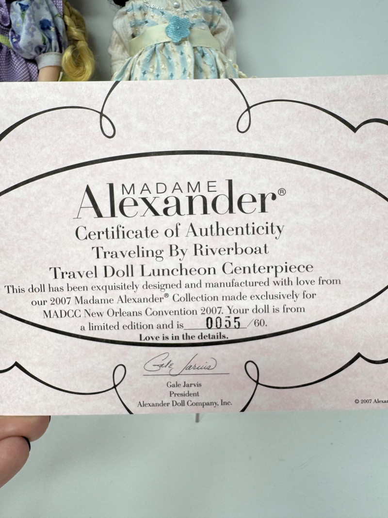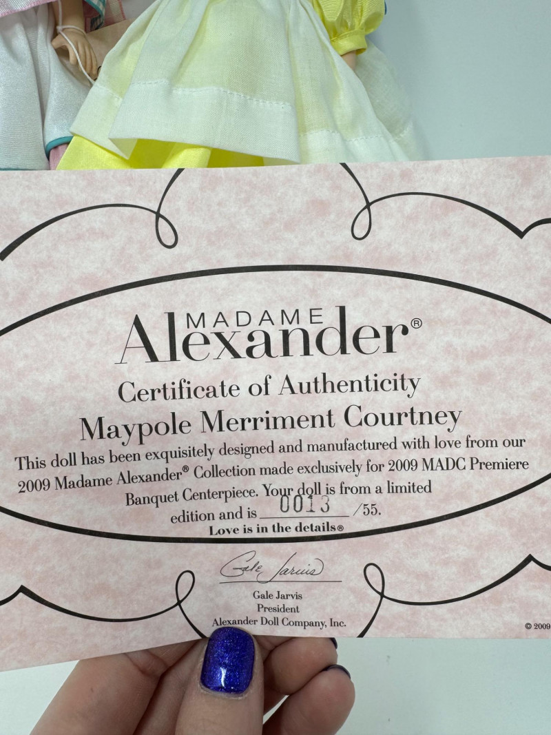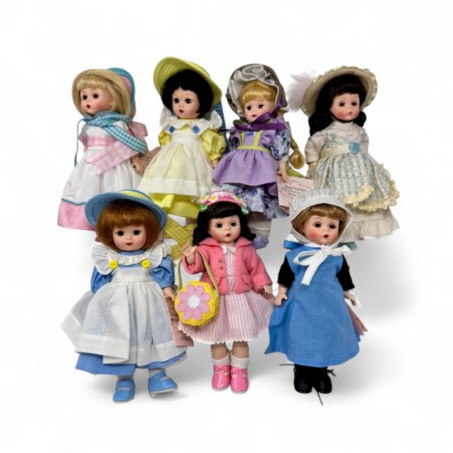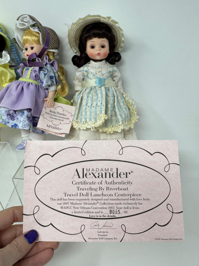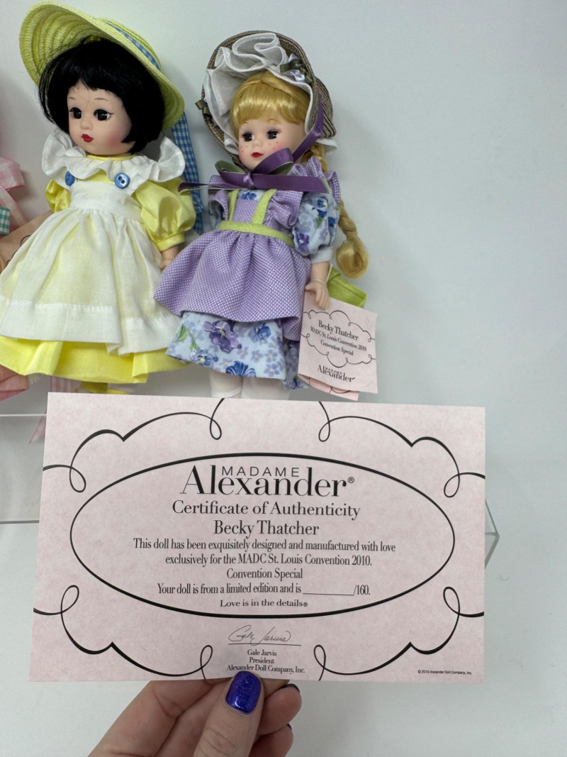 Madame Alexander 8” Dolls – Maypole Merriment, Becky & More Est. $500+ Limited-edition and convention exclusives from 2008–2010 MADC events Includes: Maypole Merriment Courtney – 2008 MADC Premiere Banquet Centerpiece – valued $200+ Maypole Merriment Caitlin – 2008 MADC Premiere Banquet Souvenir – valued $100+ Becky Thatcher – 2010 MADC St. Louis Convention Special – valued $140+ Wendy Visits the UN – 2009 MADC Fall Friendship Luncheon Hannah – 2009 MADC Convention Souvenir Plus two additional early-style Wendy dolls in bonnets and lace dresses