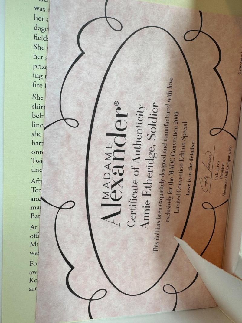 Madame Alexander 10” Dolls – Lily Langtry, Belle Boyd, Lydia Smith + Dolls included - each with original boxes and Certificates of Authenticity Lily Langtry – 2009 MADC Convention Centerpiece, limited edition Belle Boyd, Spy – 2009 MADC Convention, limited edition Annie Etheridge, Soldier – 2009 MADC Convention, limited edition Lydia Smith, Solace – 2009 MADC Convention, limited edition At the Old Clubhouse – 2012 MADC Premier Collection
