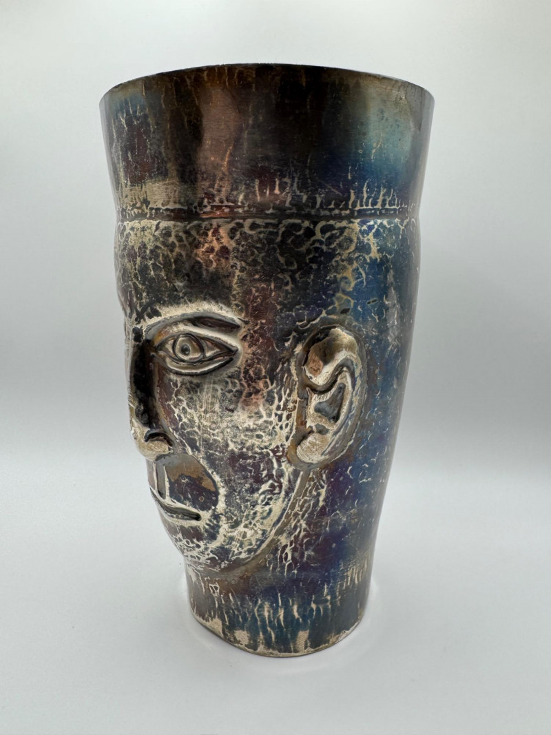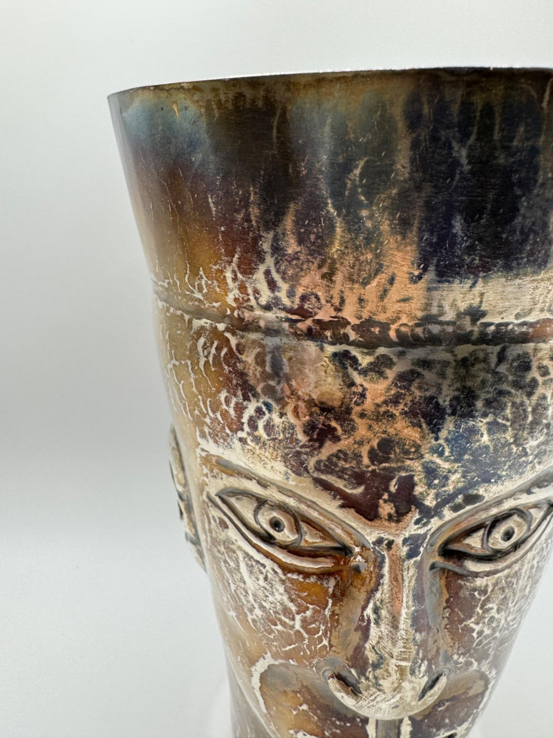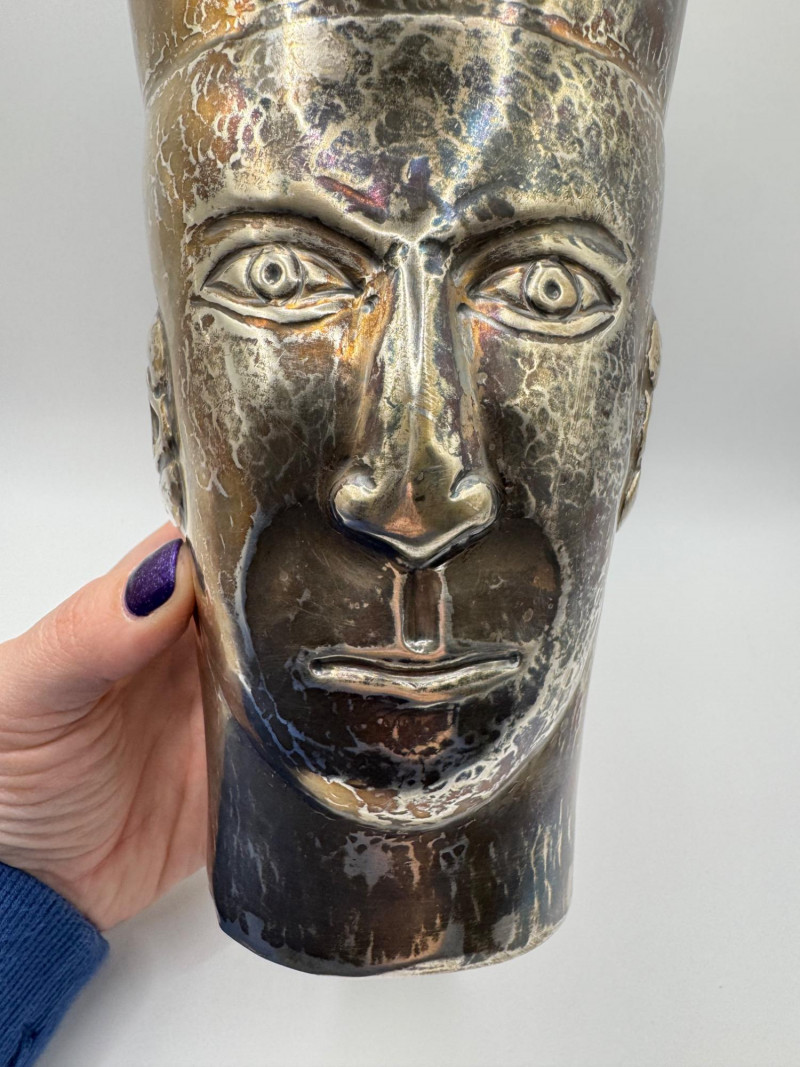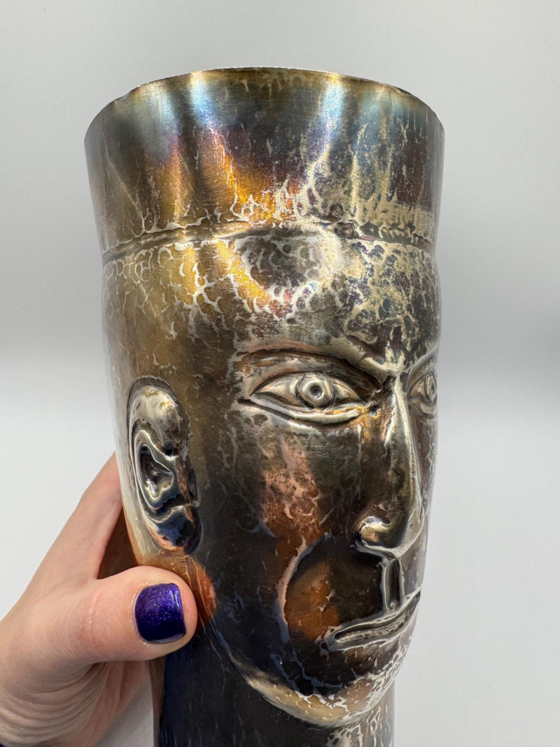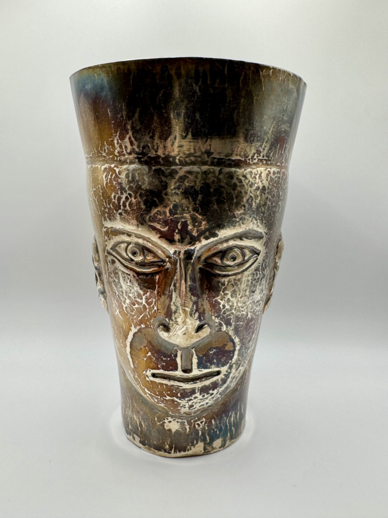 Peruvian .925 Sterling Silver Face Vase – 264g. Disclaimer: Sterling and other metals are not tested. Items are sold as is with no guarantees on metal content or purity. No refunds based on metal quality.