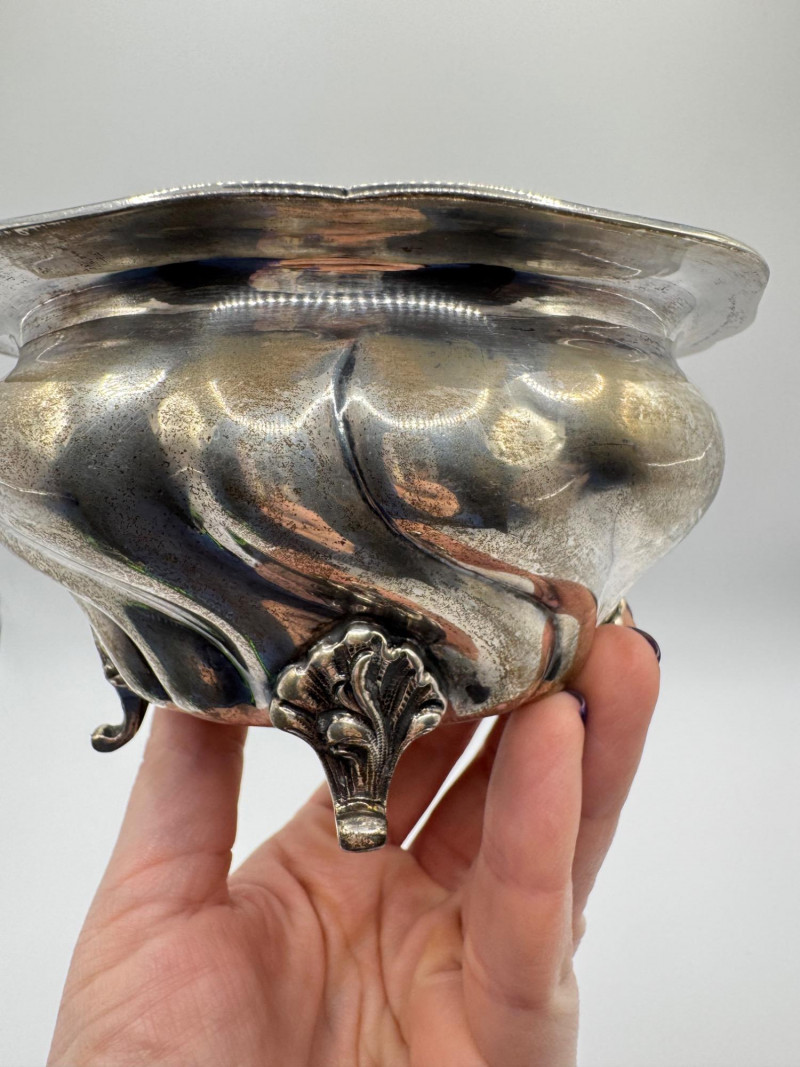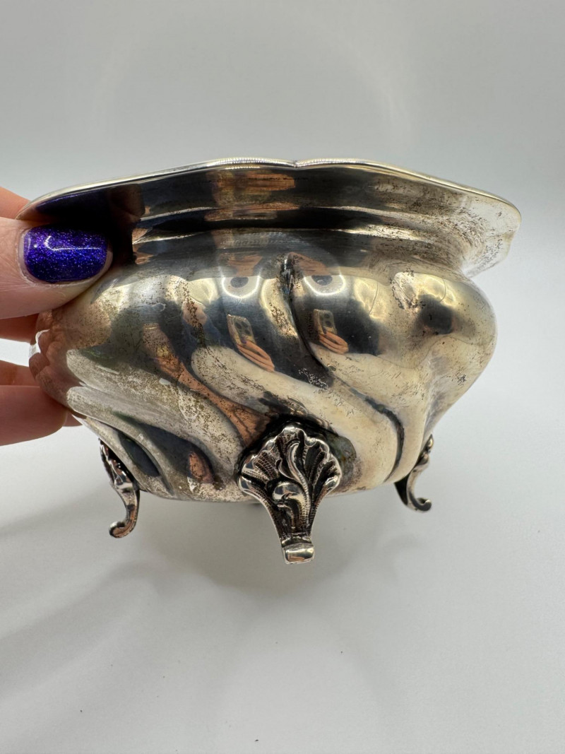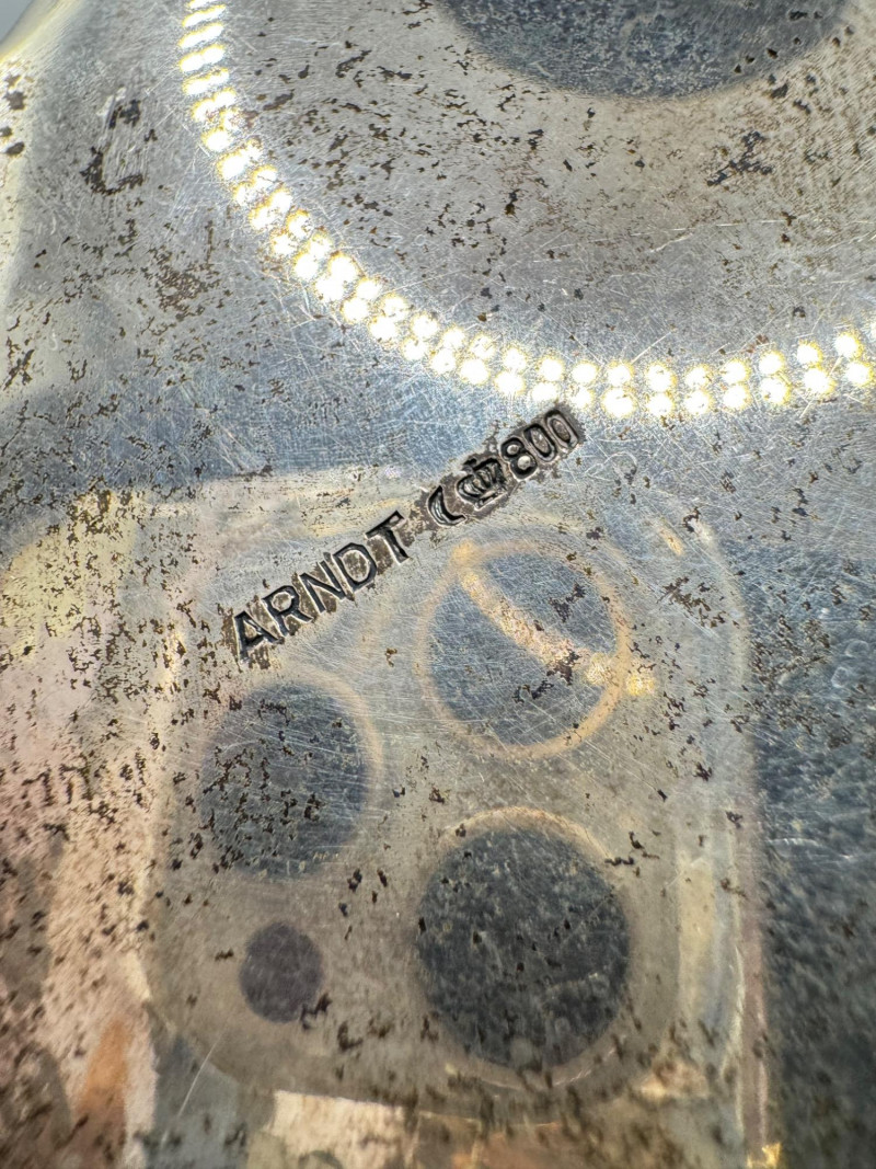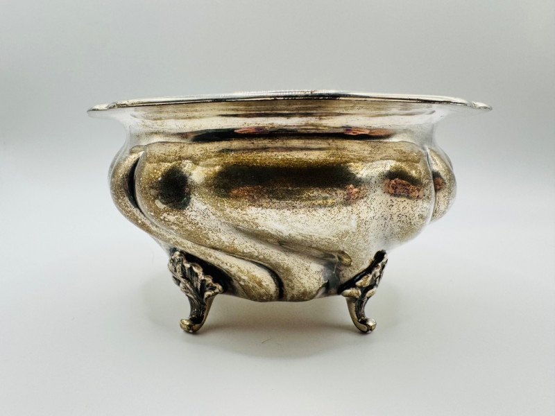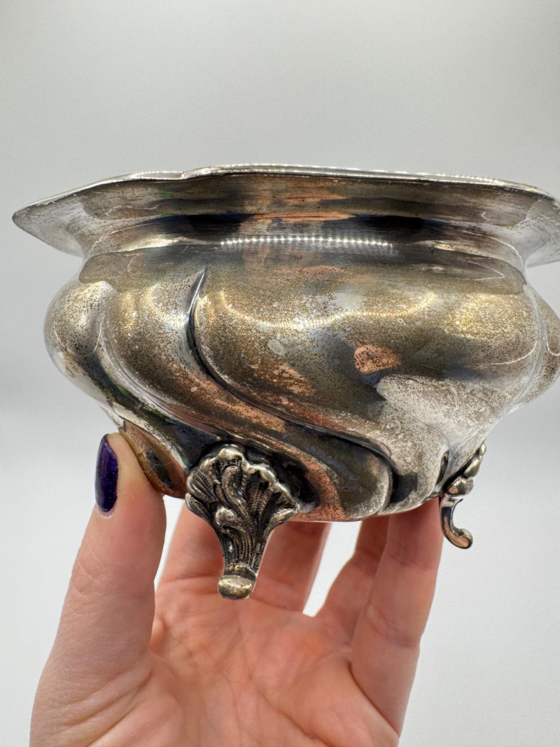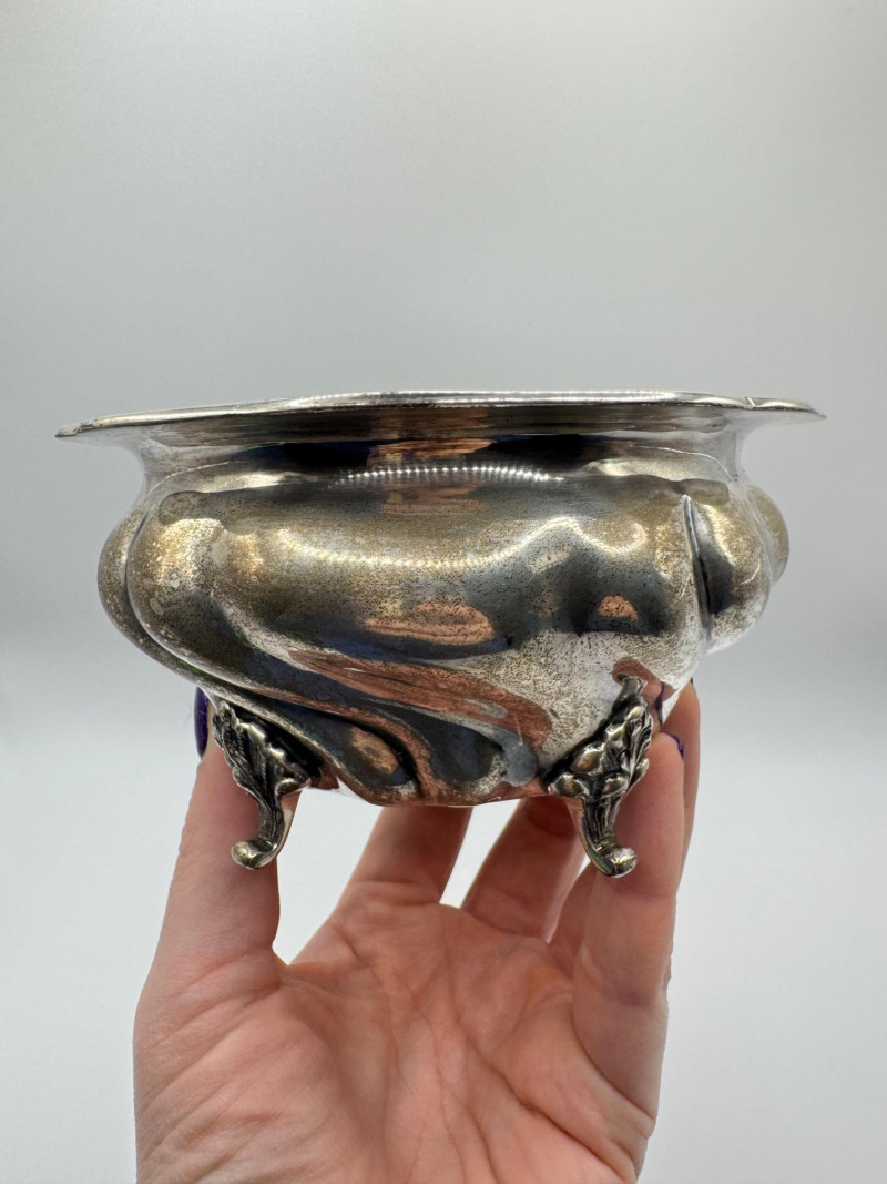 Antique Arndt 800 Silver Footed Bowl – Ornate Tripod Design, 190g. Disclaimer: Sterling and other metals are not tested. Items are sold as is with no guarantees on metal content or purity. No refunds based on metal quality.
