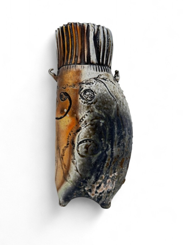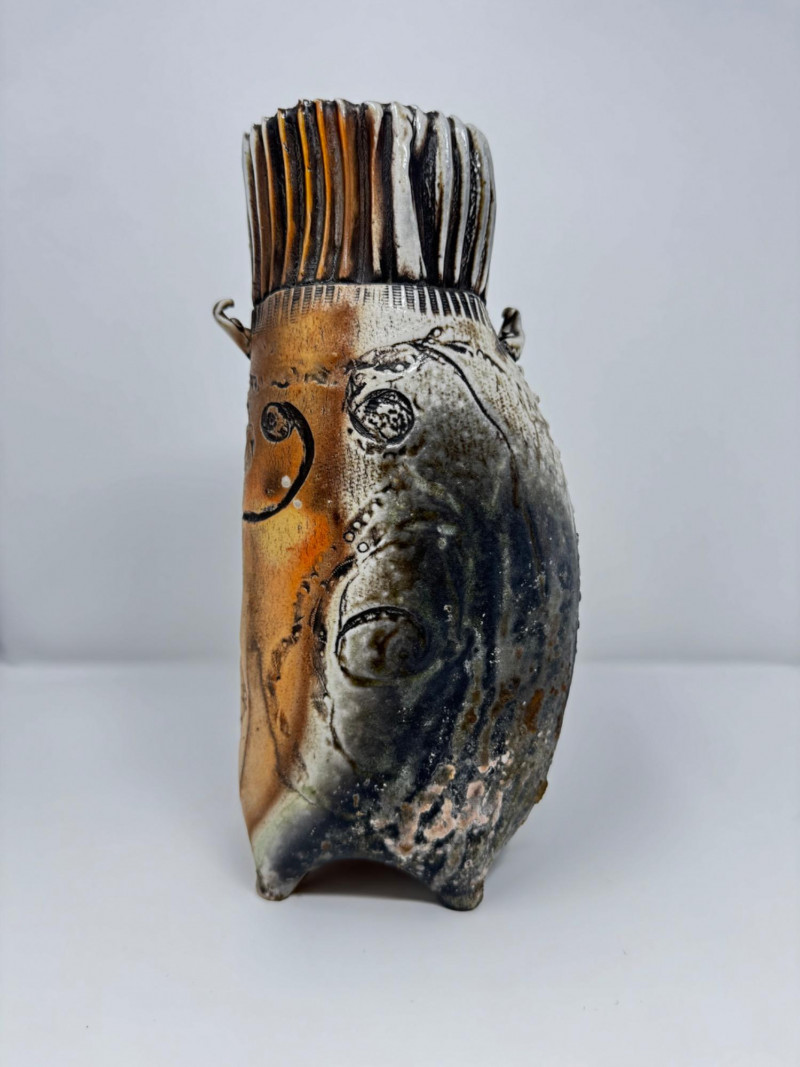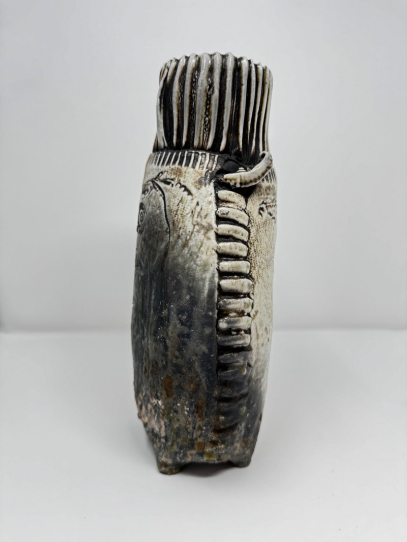 Textured Studio Pottery Vase with Ribbed Top & Abstract Design.