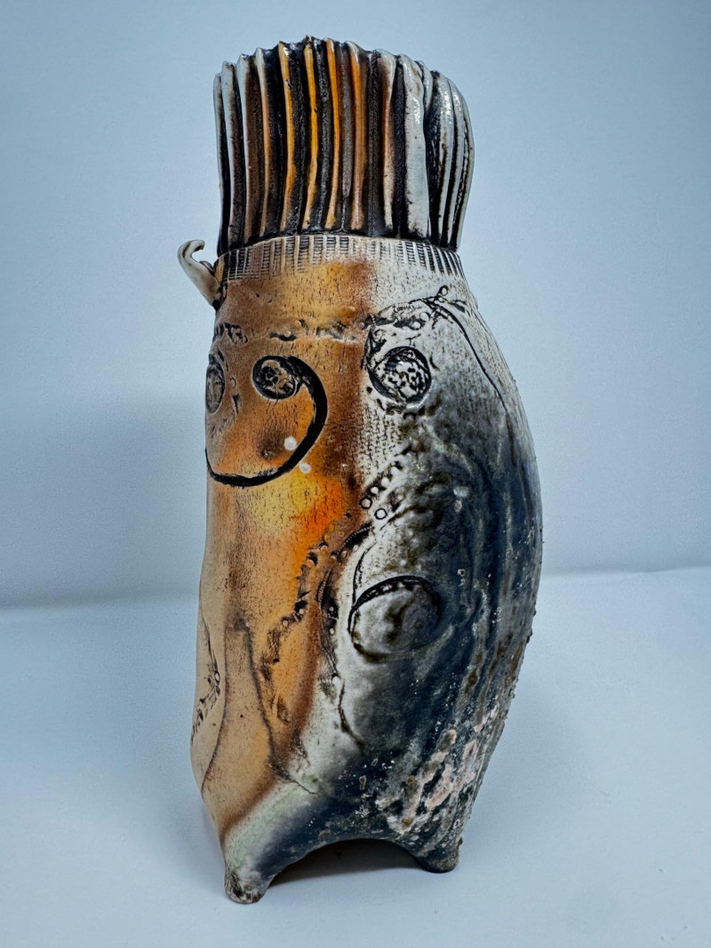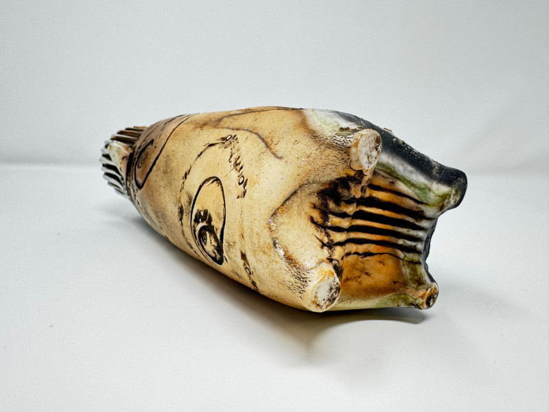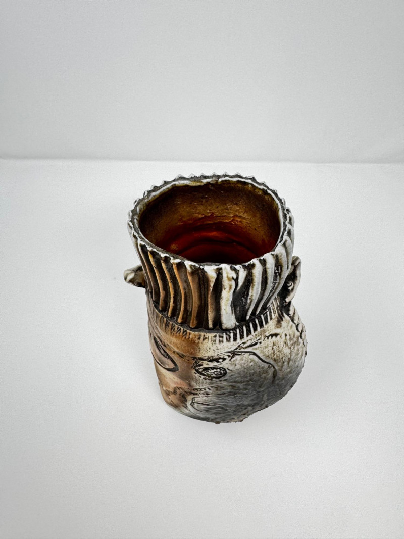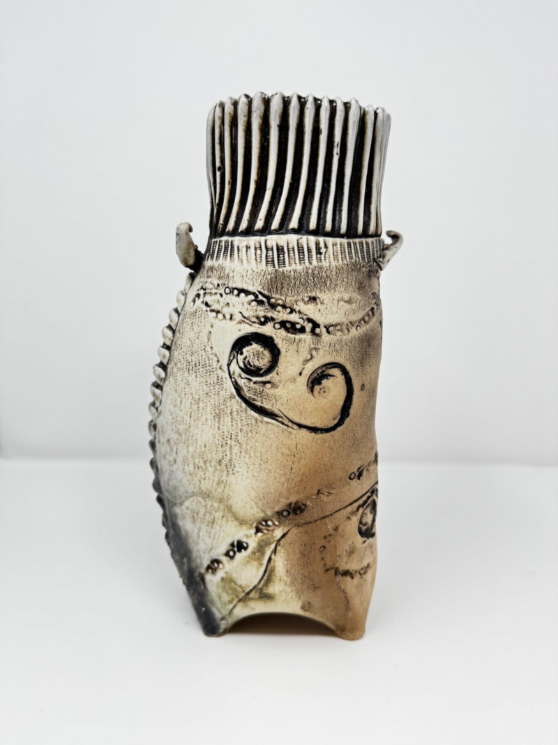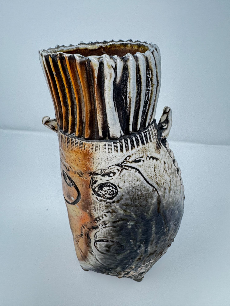 Lot # 50 - Textured Studio Pottery Vase with Ribbed Top & Abstract Design