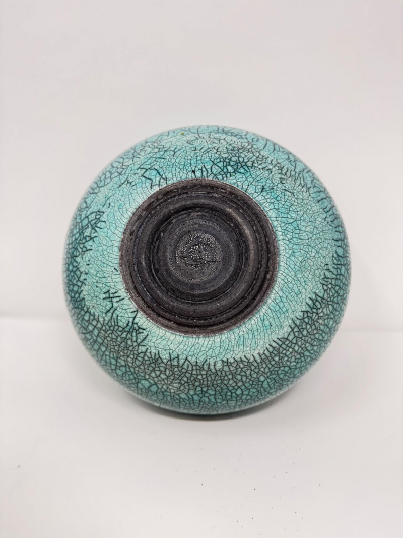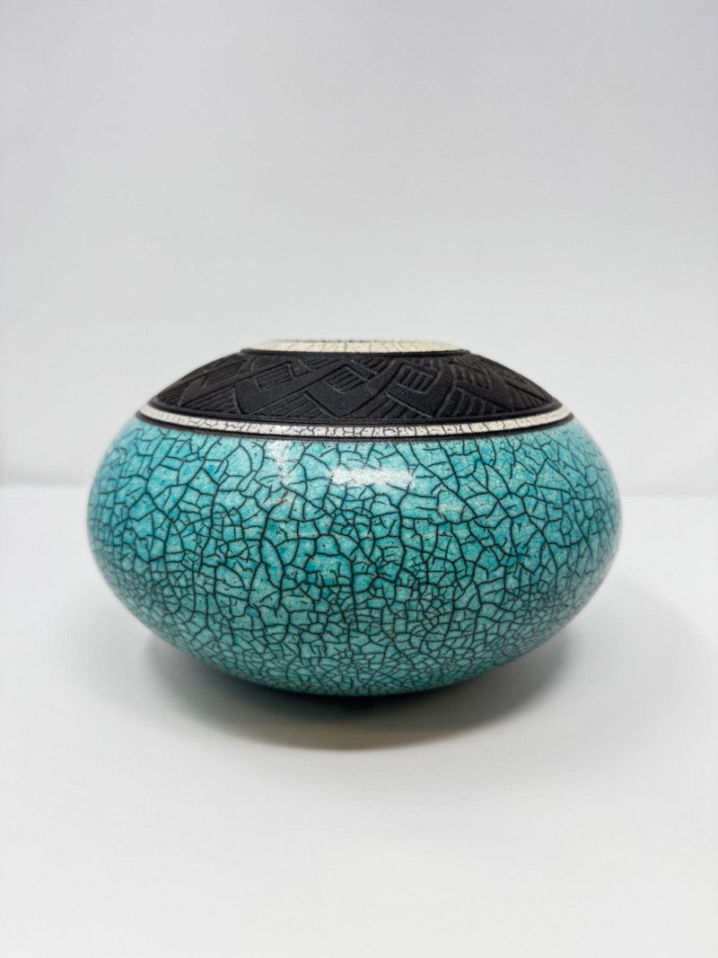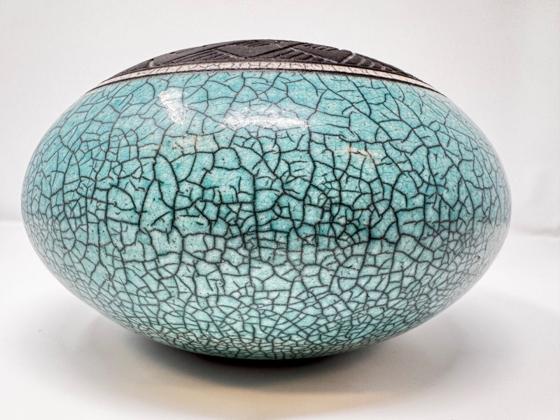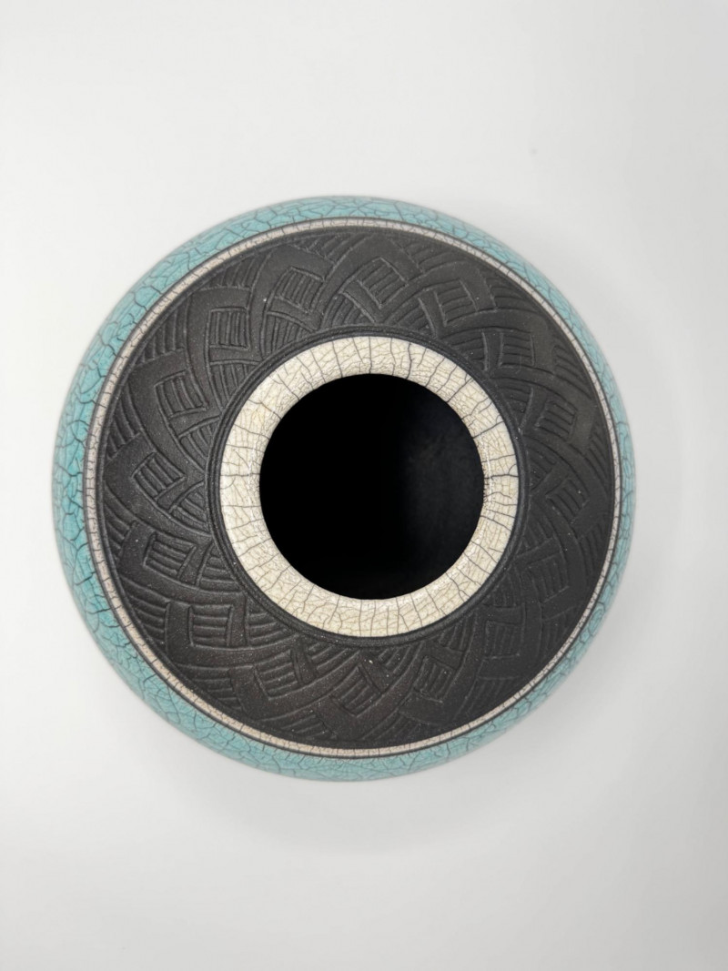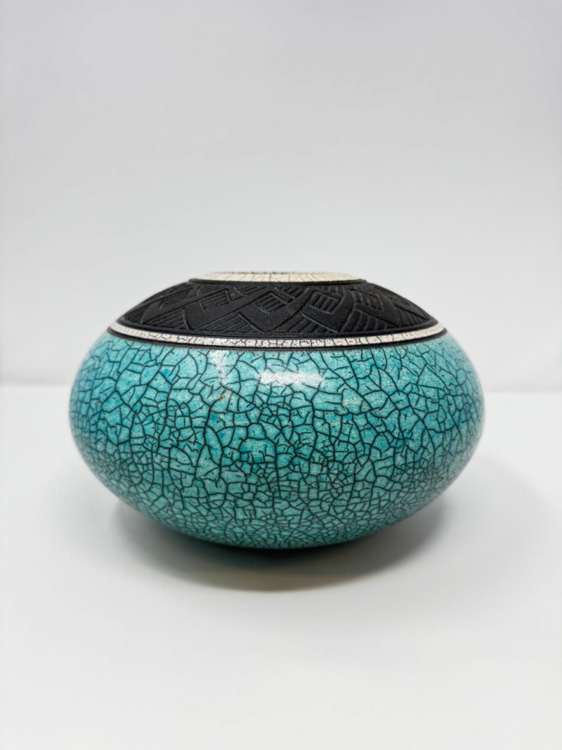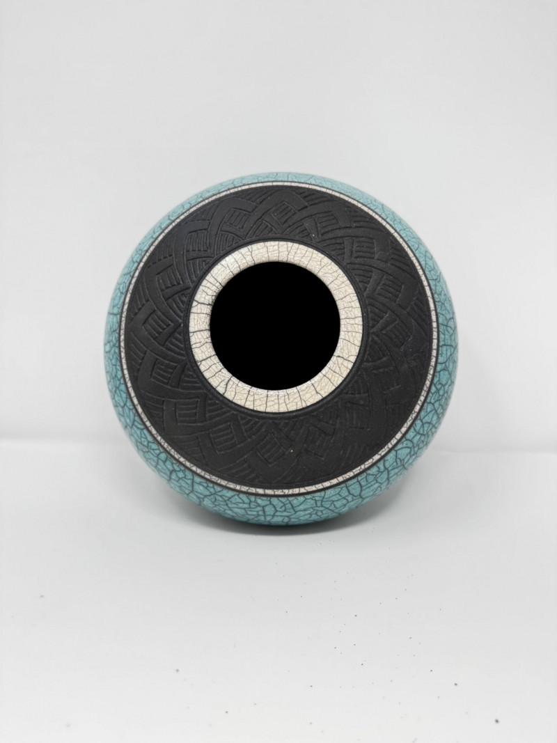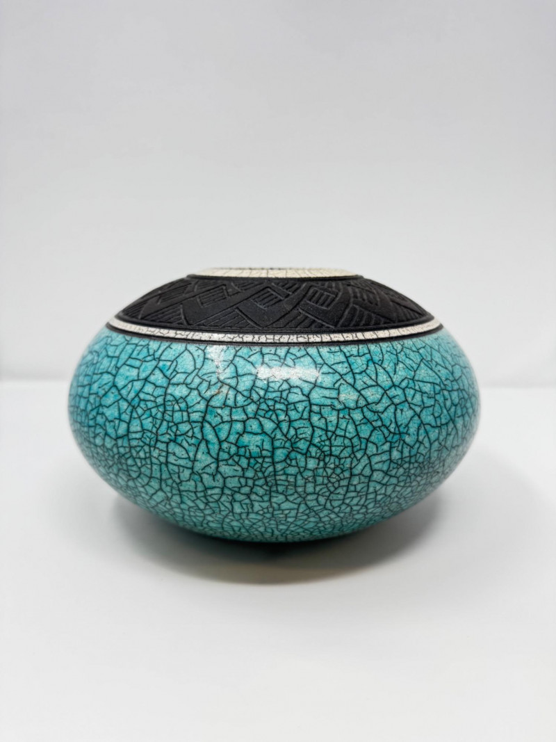 Turquoise Crackle Glaze Pottery Vase w/ Carved Geometric Rim.