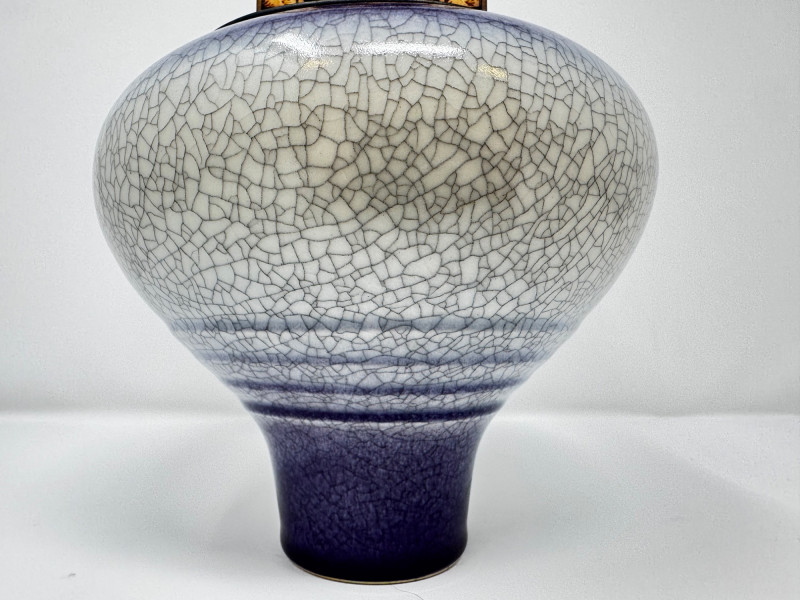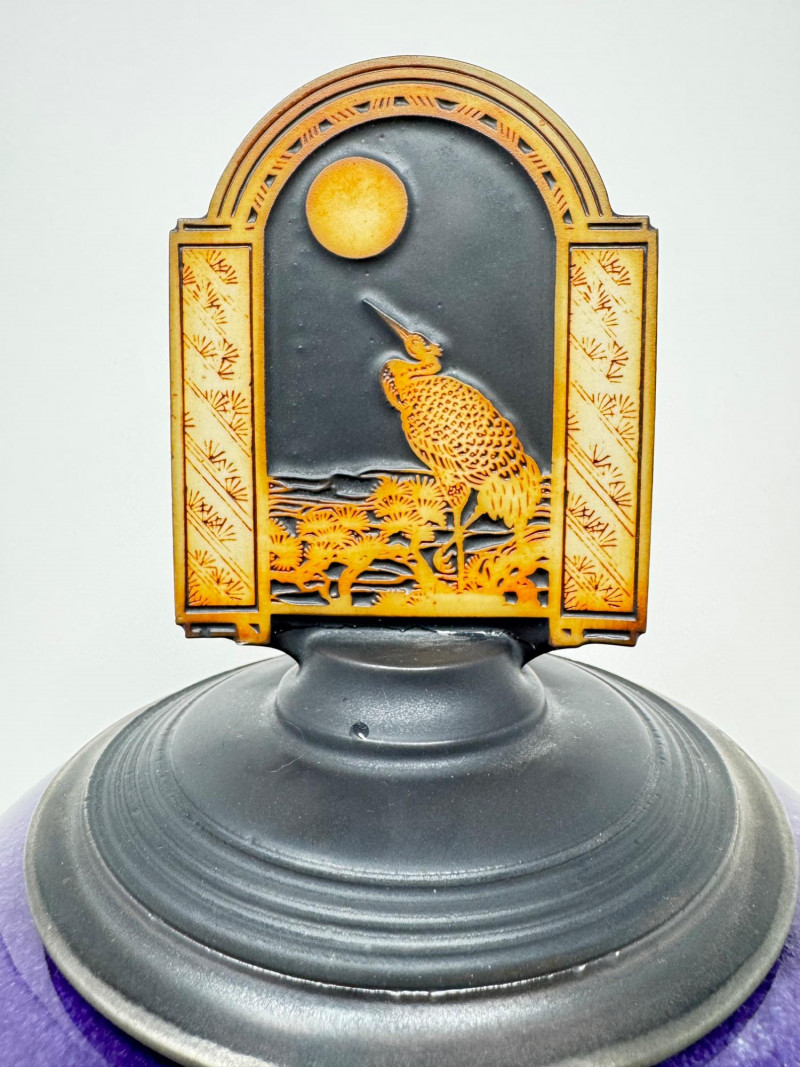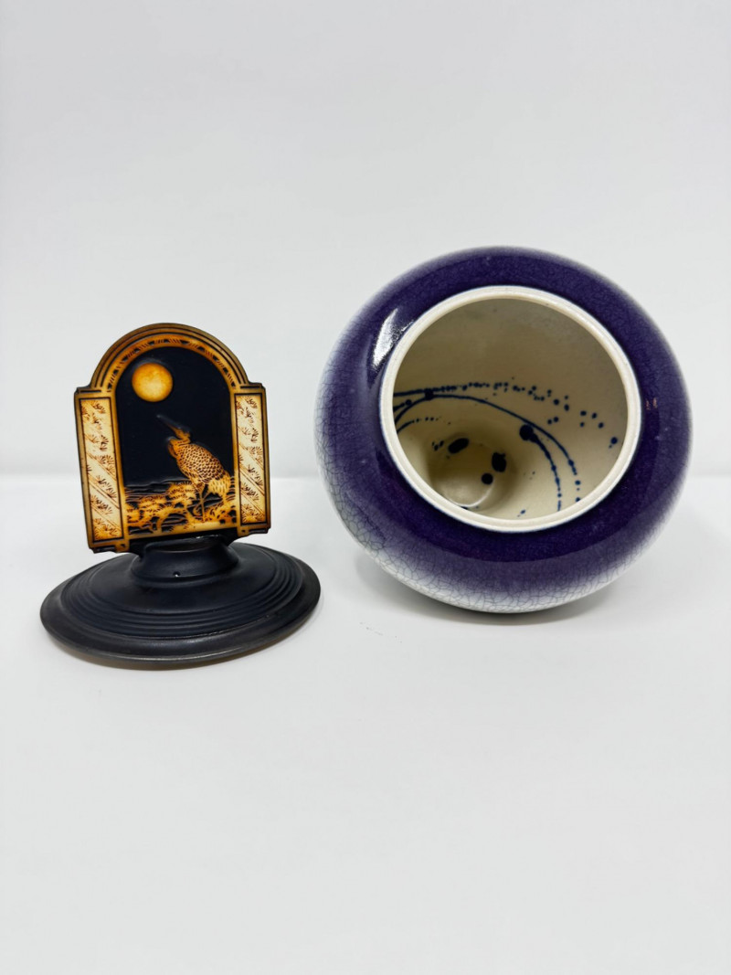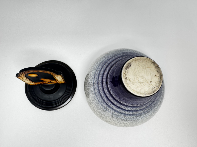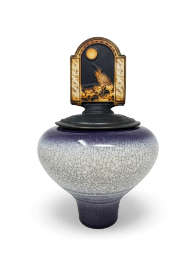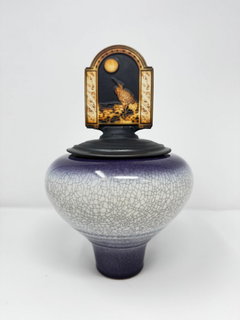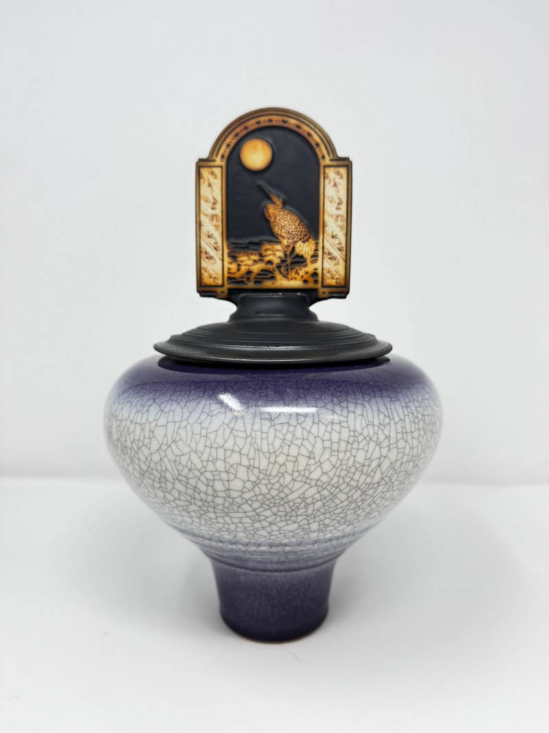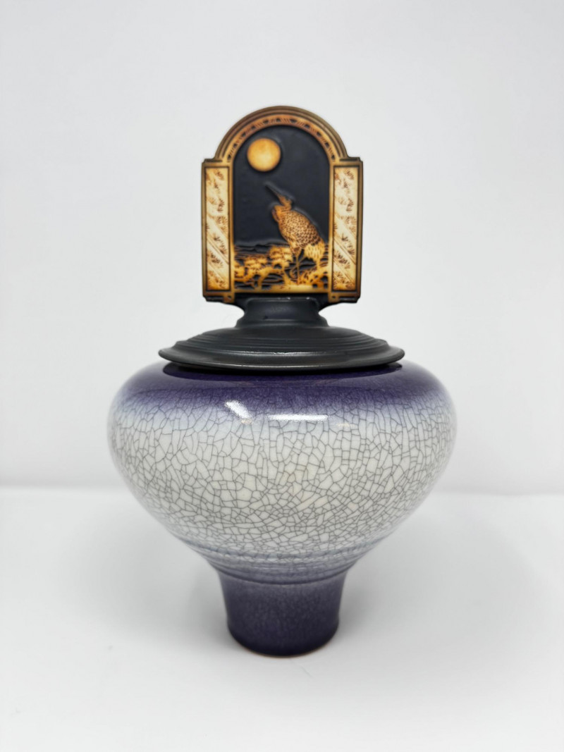 Handmade Crackle Glaze Pottery Vessel w/ Heron Lid.