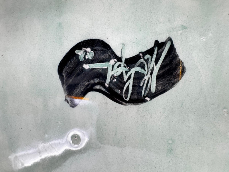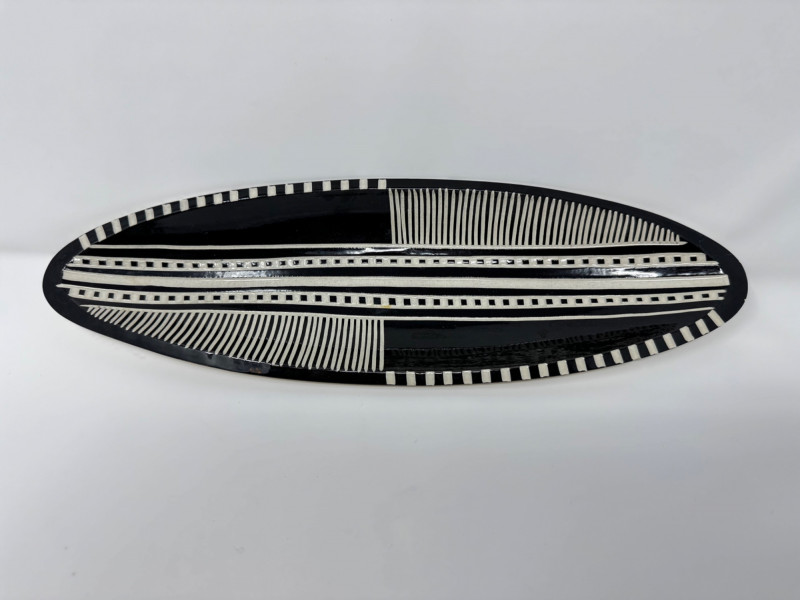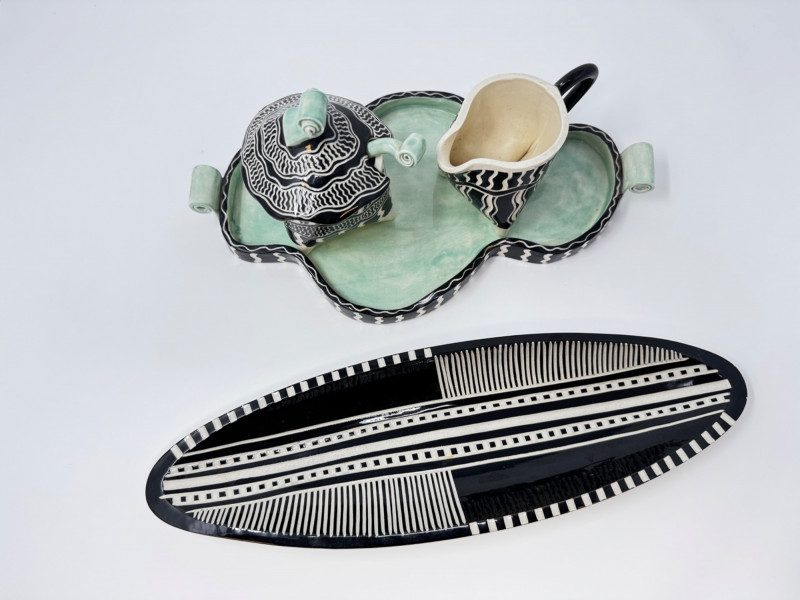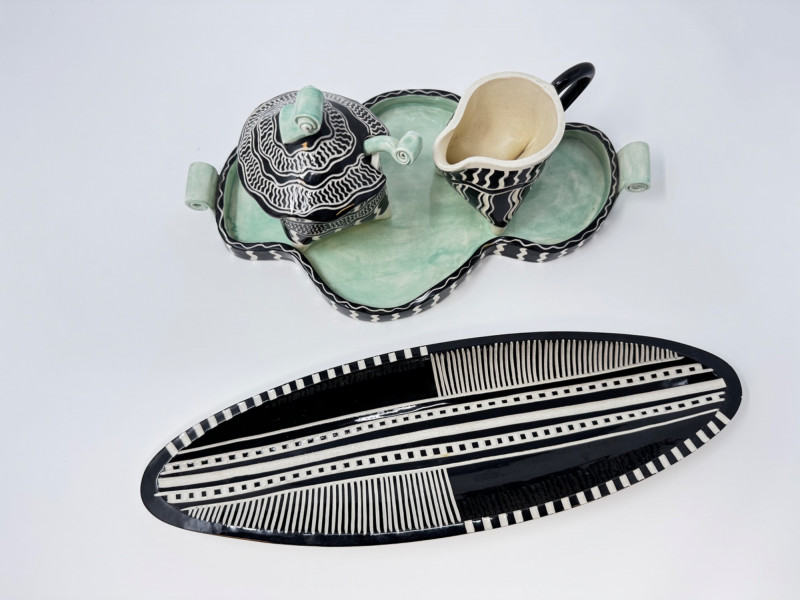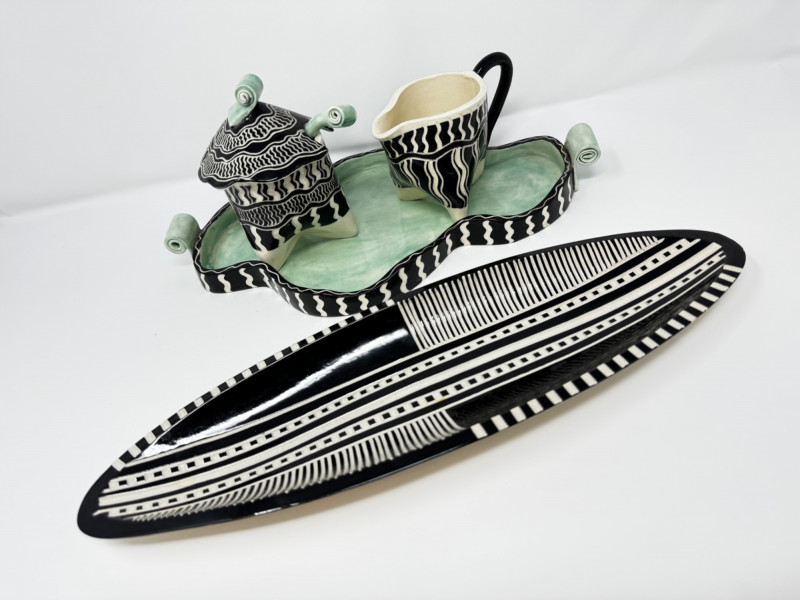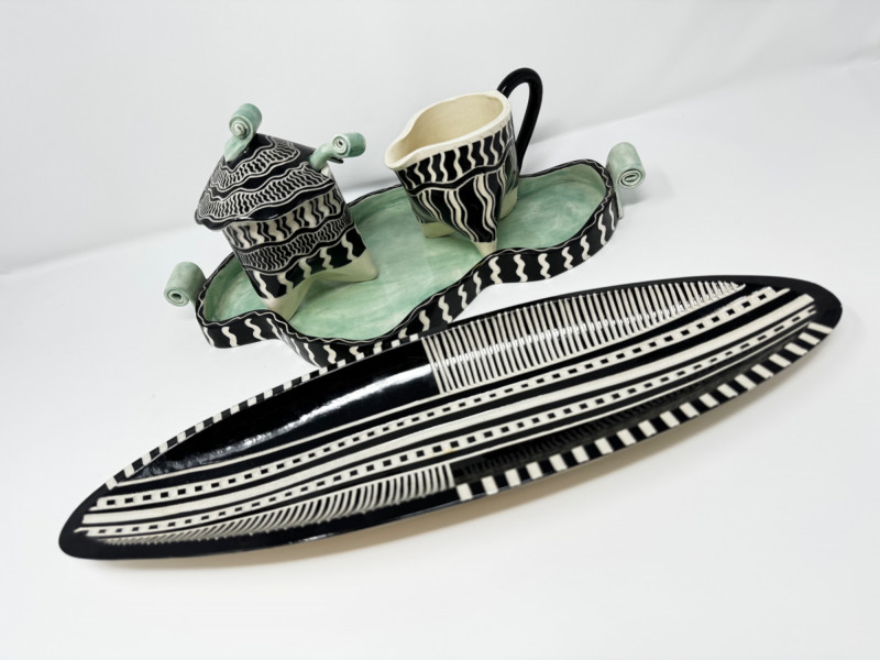 Lot # 62 - Signed Whimsical Black & White Pottery Tea Set & Platter