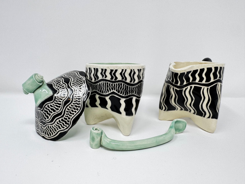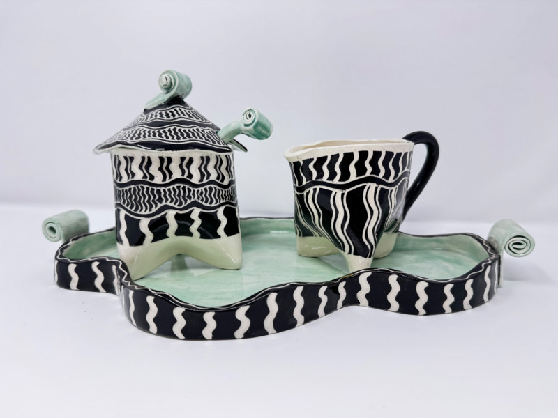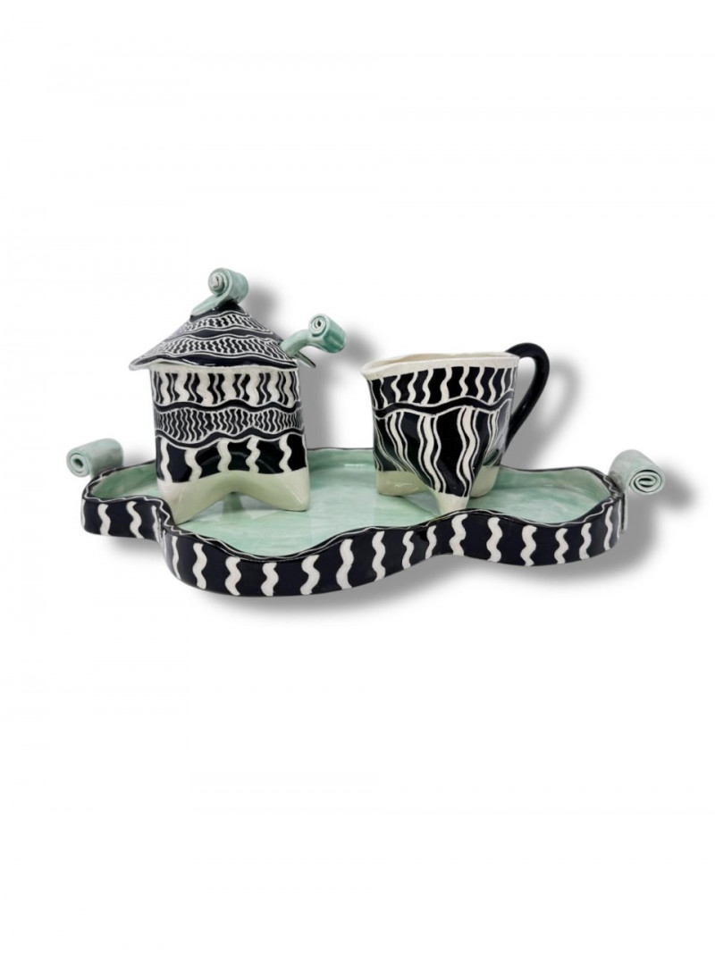 Signed Whimsical Black & White Pottery Tea Set & Platter