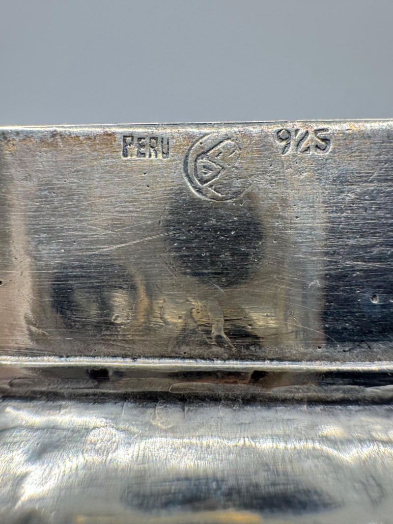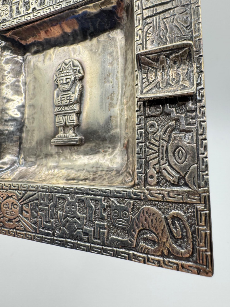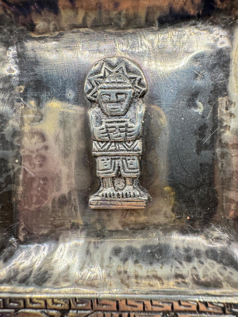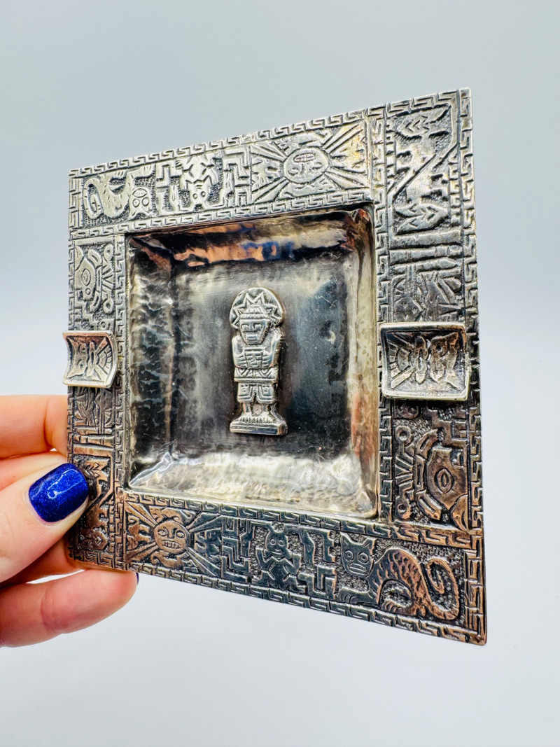 Peruvian 925 Silver Ashtray w/ Inca Motifs – 153g. Disclaimer: Sterling and other metals are not tested. Items are sold as is with no guarantees on metal content or purity. No refunds based on metal quality.
