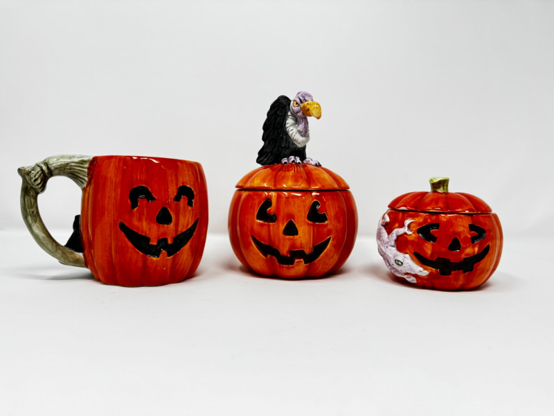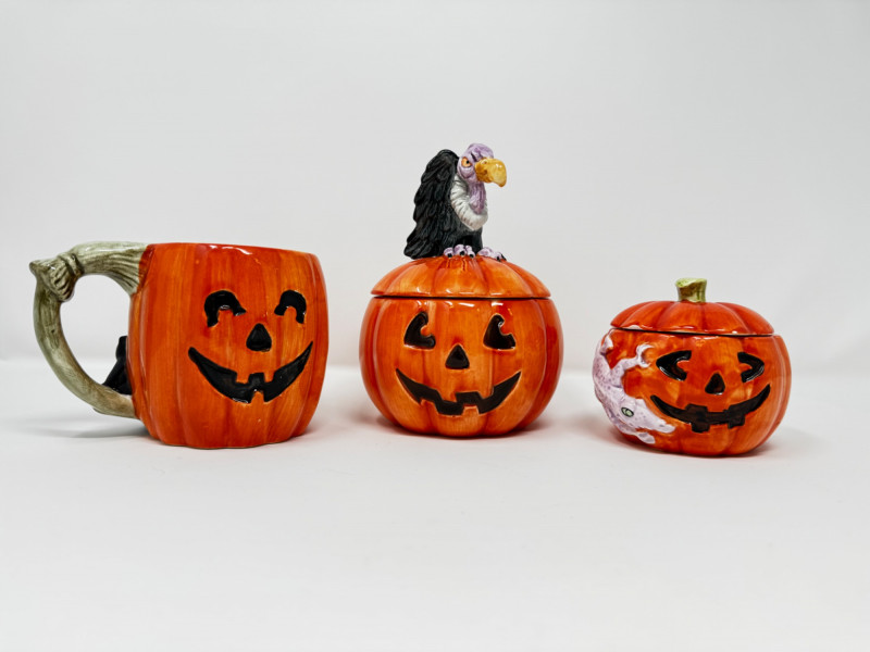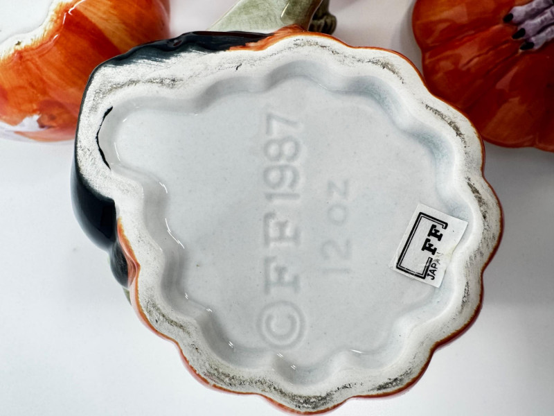 Fitz & Floyd Halloween Pumpkin Mug & Candy Dish Set Japan 1987–88. Includes: All pieces come in their original boxes