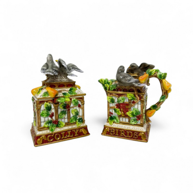 Fitz & Floyd 12 Days of Christmas “4 Colly Birds” Sugar & Creamer Set.