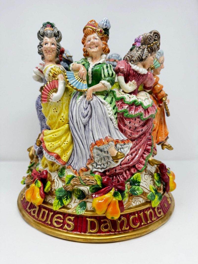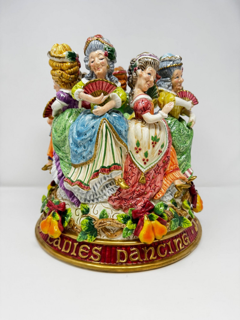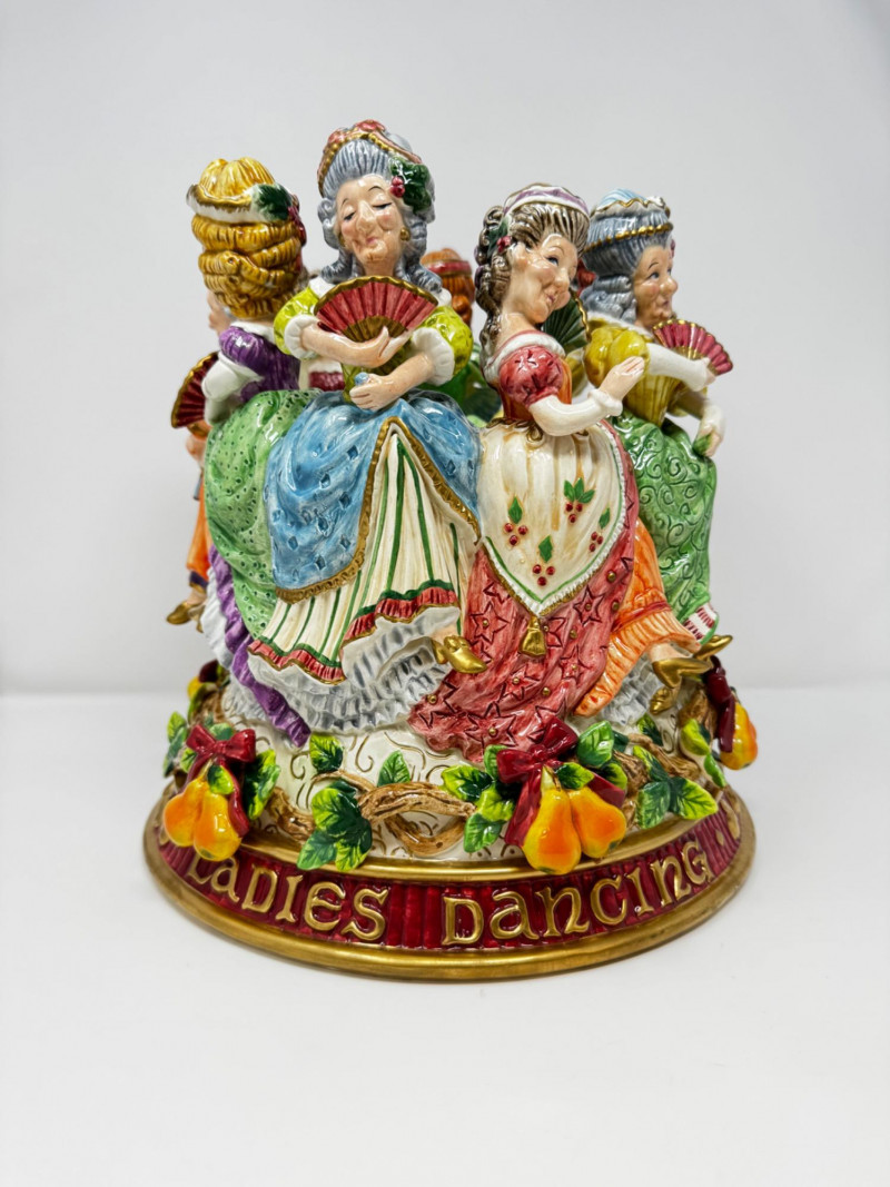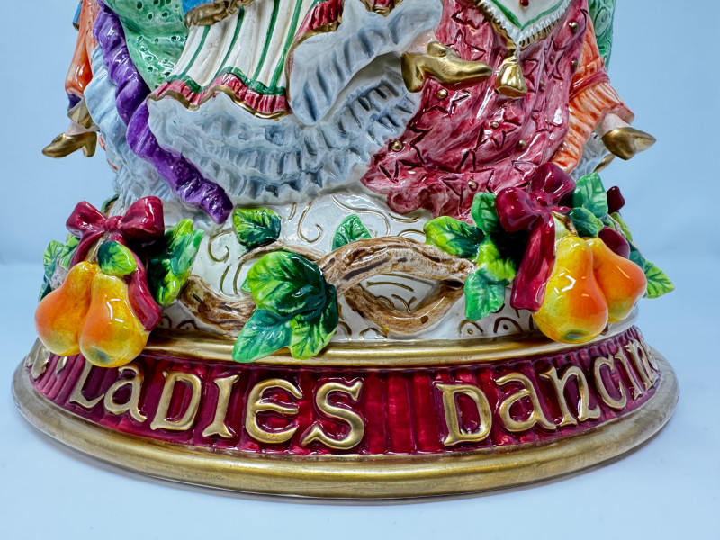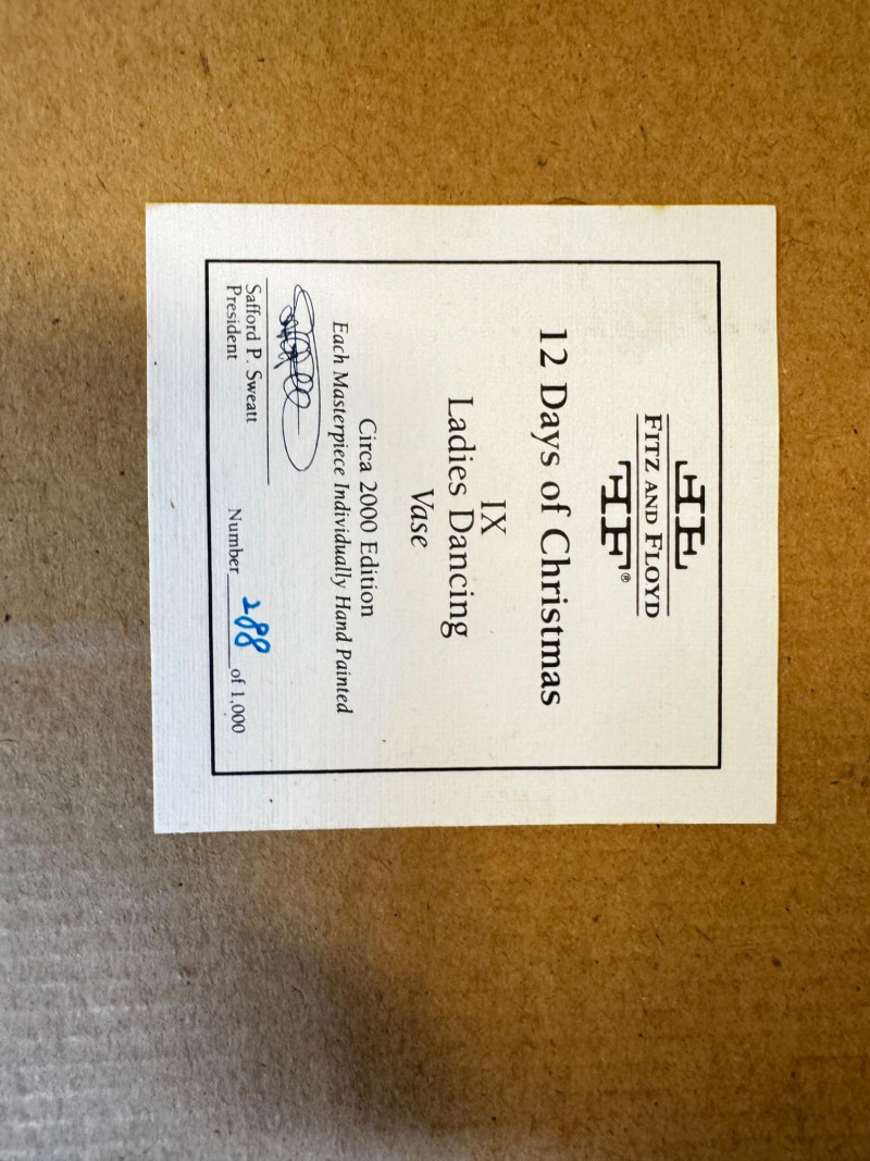Fitz & Floyd 12 Days of Christmas “Ladies Dancing” Vase. Fitz & Floyd Twelve Days of Christmas Collection, Circa 2000 Limited Edition #288 of 1,000, with certificate of authenticity Measures 11” x 11” x 11” Has a tiny chip (see photo for detail) Comes in original box