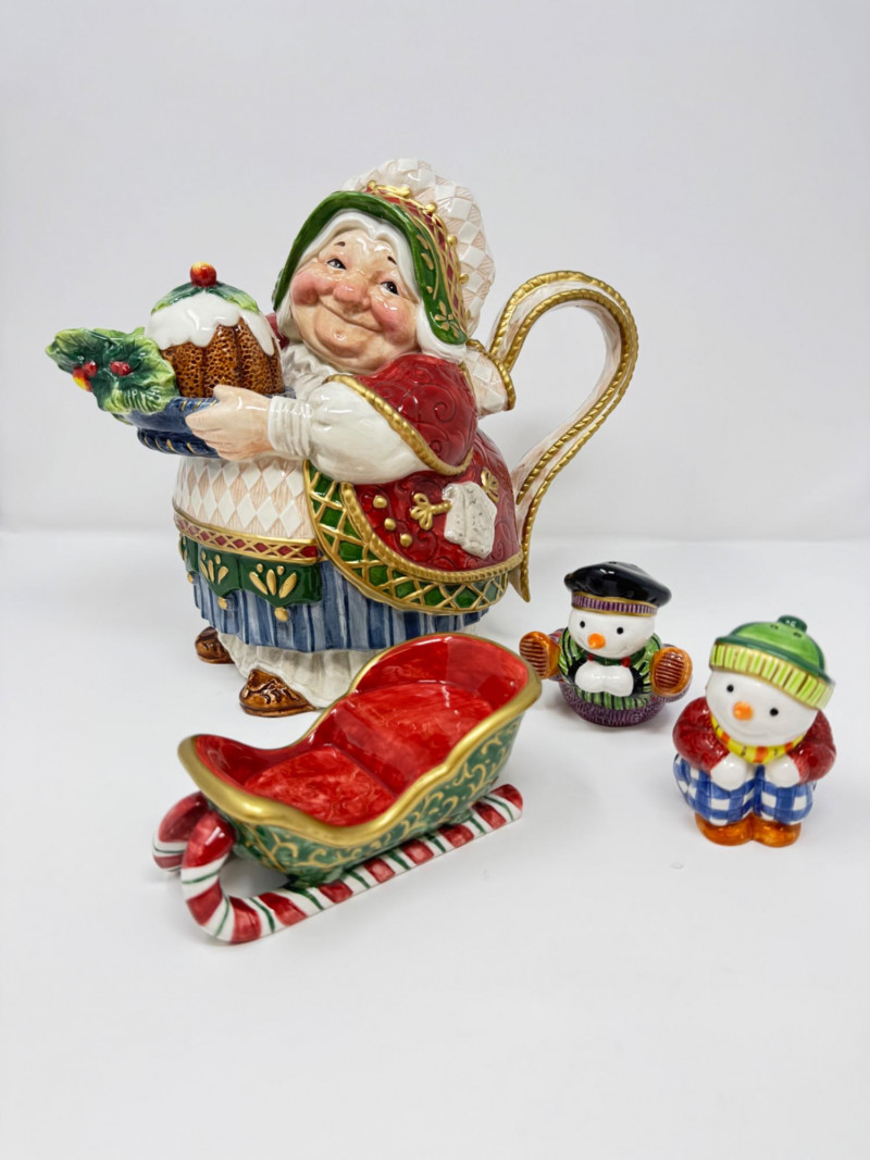 Fitz & Floyd Mrs. Claus Pitcher w/ Snowman Shakers & Sleigh. Includes: Comes in original boxes