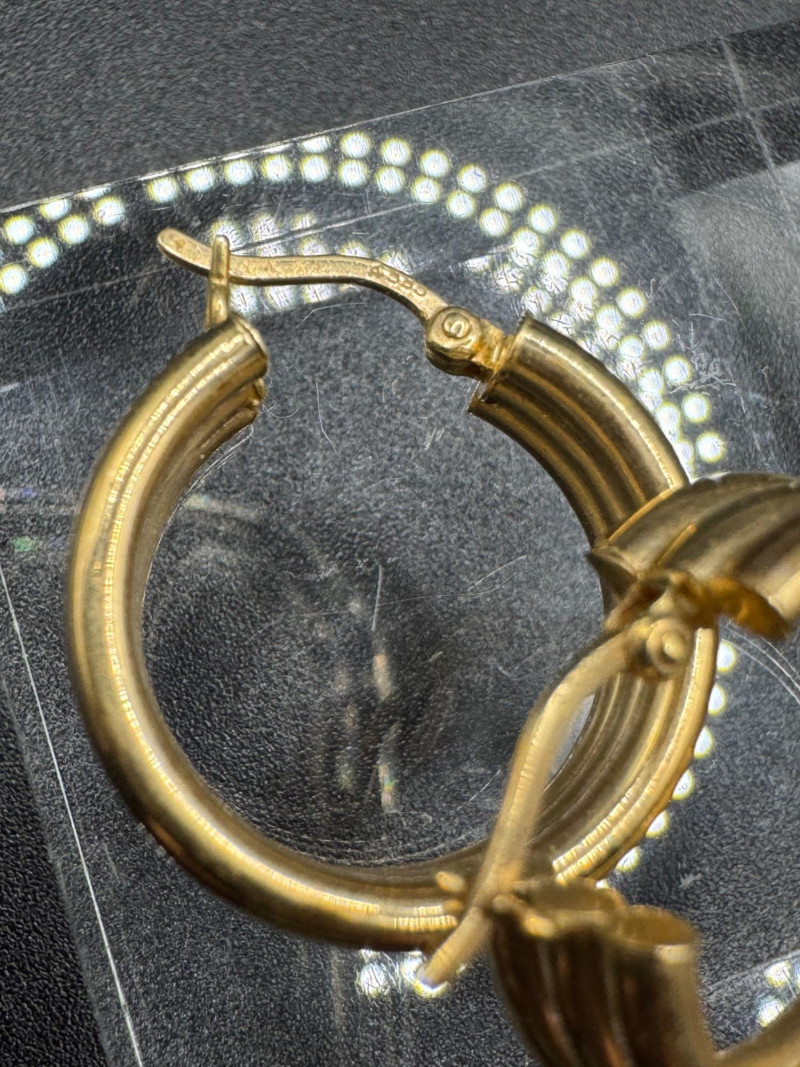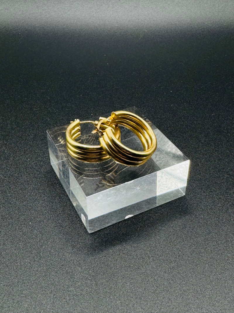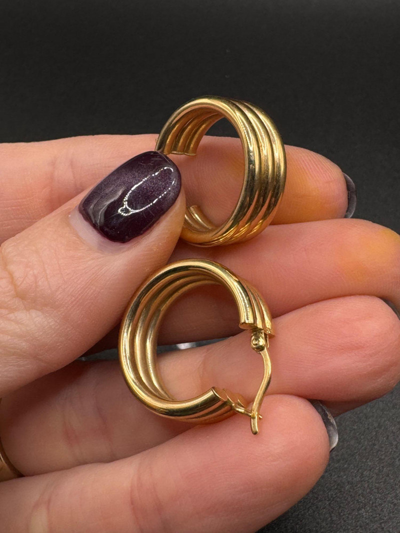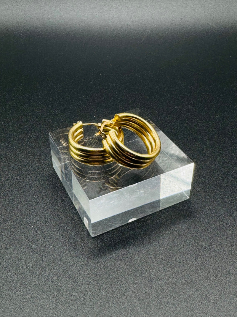 14K Gold Chunky Triple Hoop Earrings – 4.16g. Important Disclaimer: Jewelry in this lot has not been tested. By bidding, you agree to purchase as is, with no guarantees on metal purity, gemstone authenticity, or content. No refunds issued on these factors.