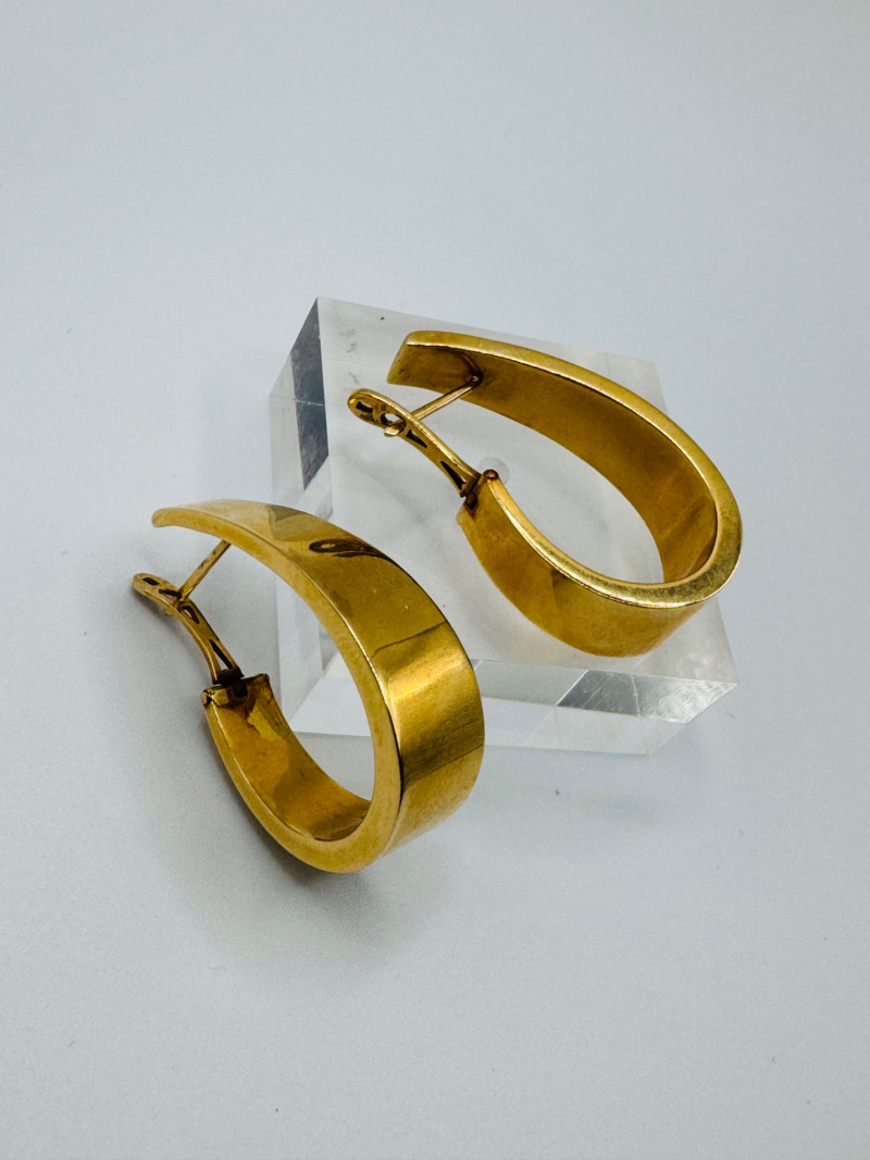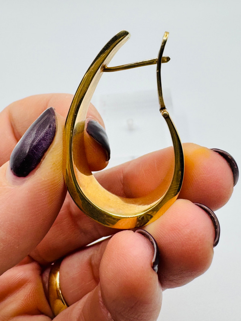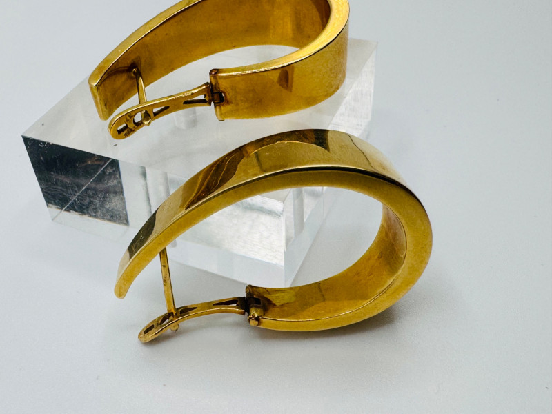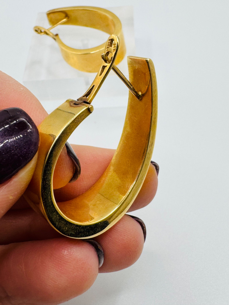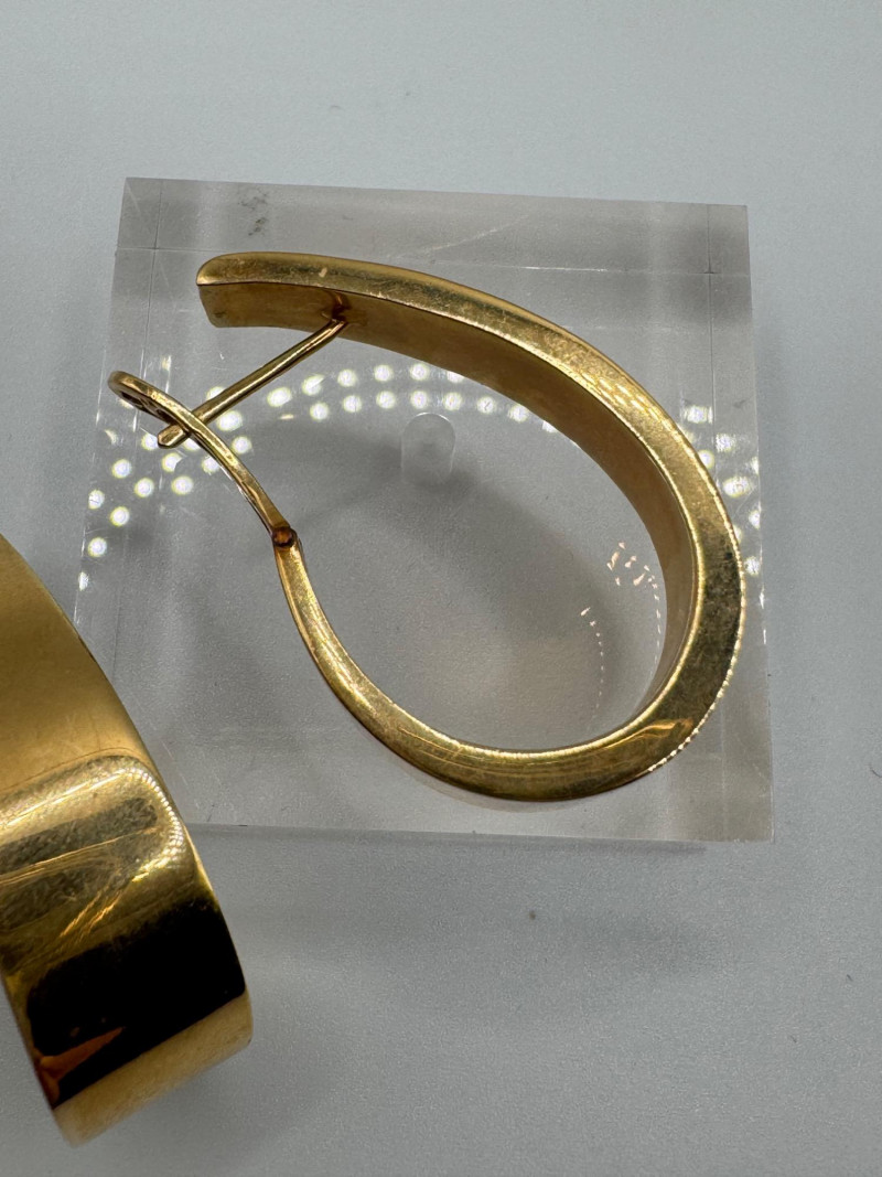 14K Gold Sculptural J Hoop Earrings – 9.91g. Important Disclaimer: Jewelry in this lot has not been tested. By bidding, you agree to purchase as is, with no guarantees on metal purity, gemstone authenticity, or content. No refunds issued on these factors.