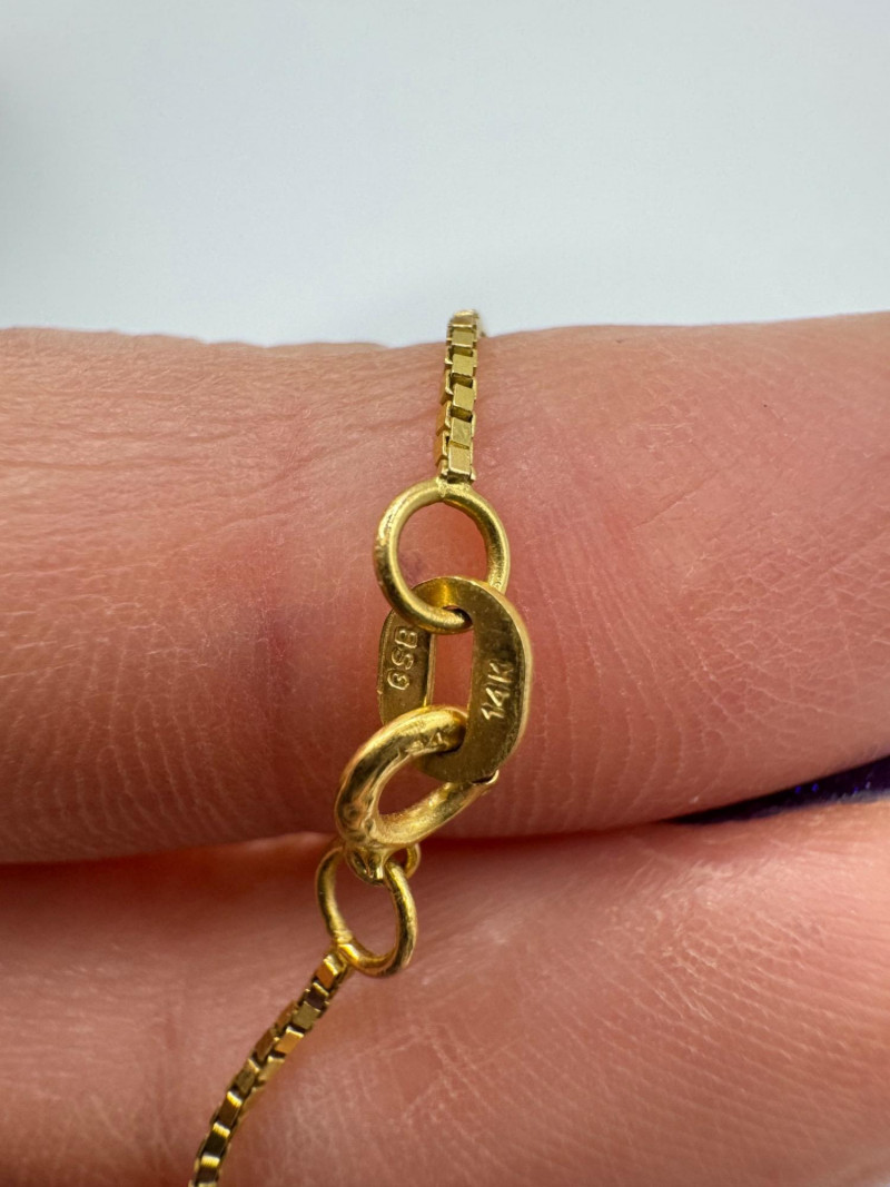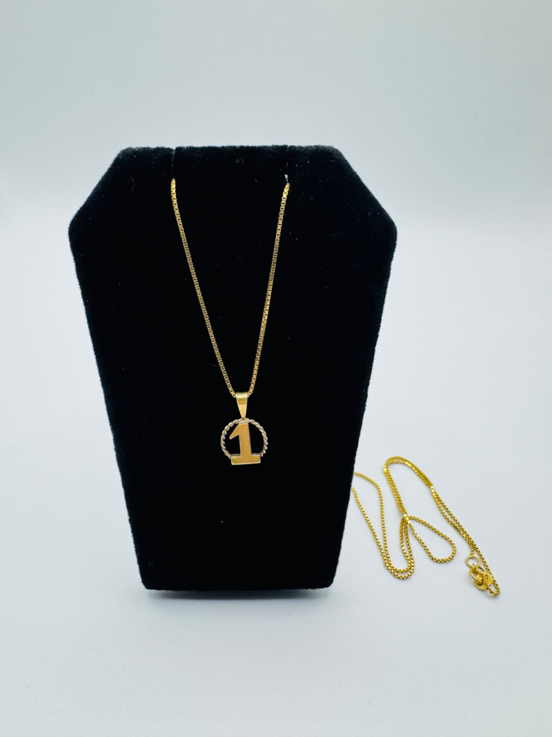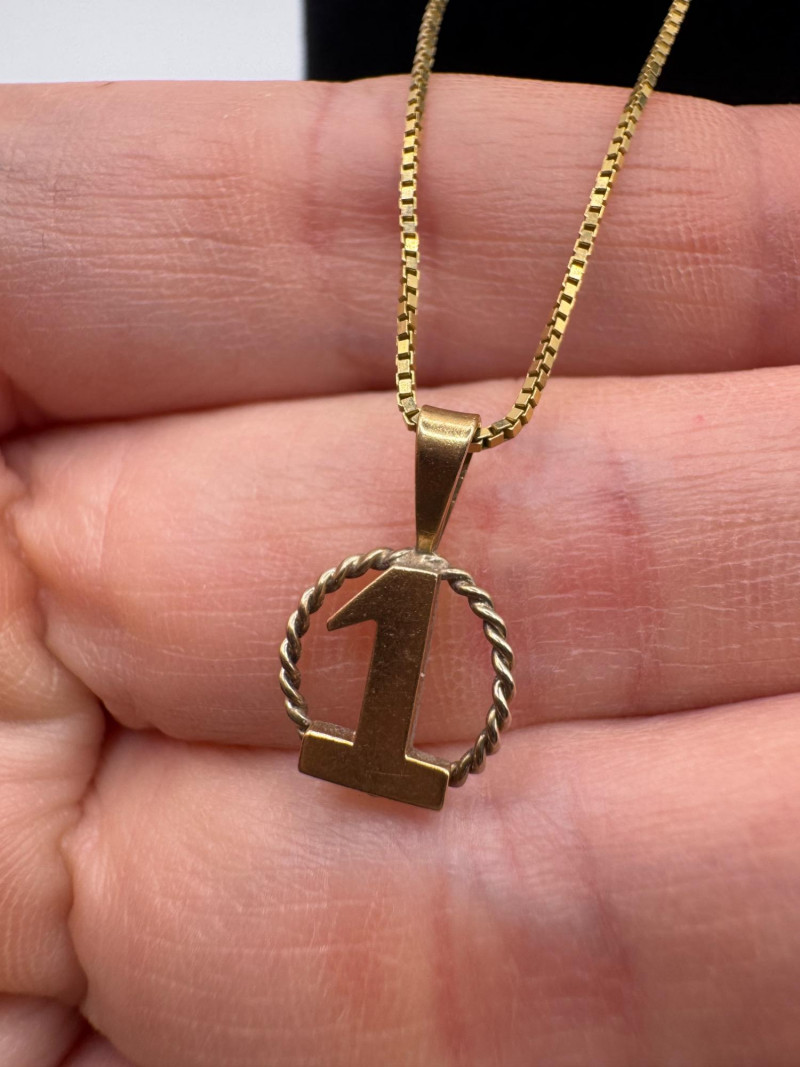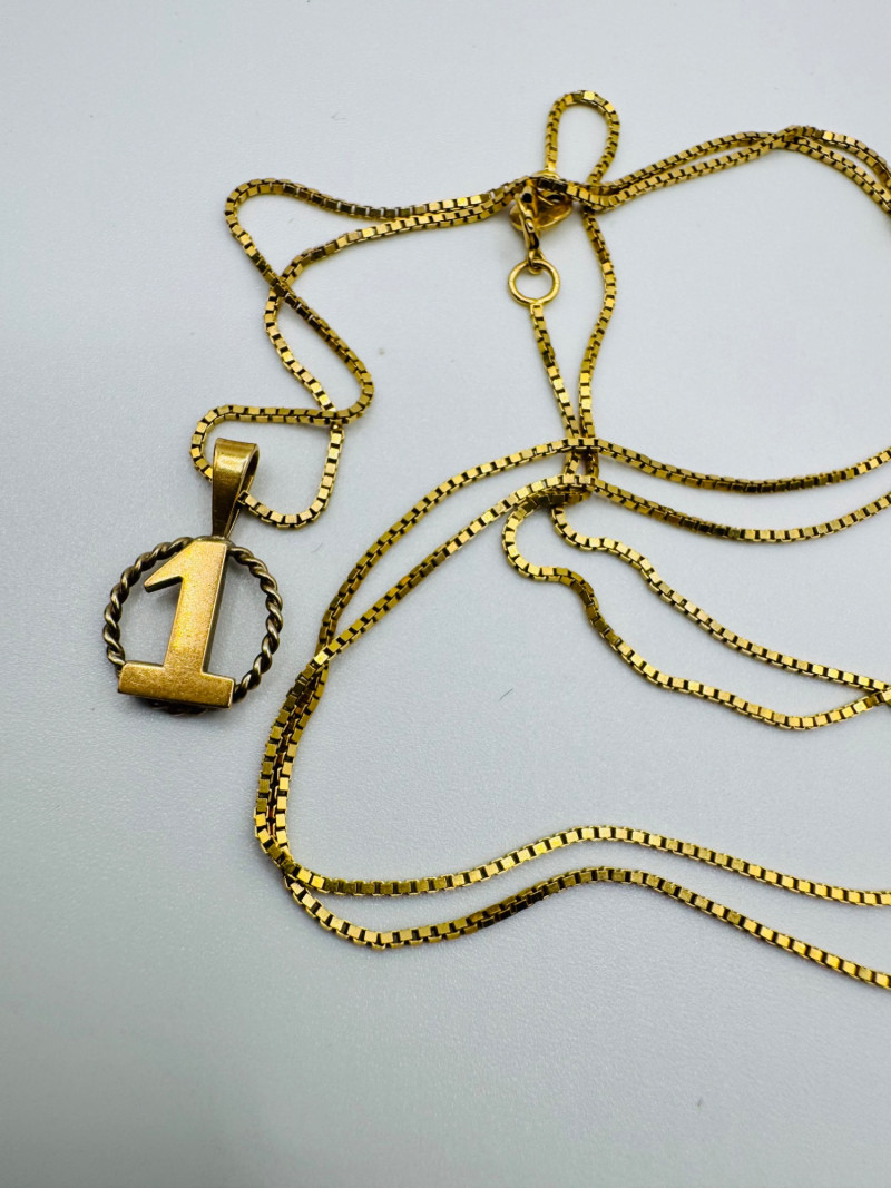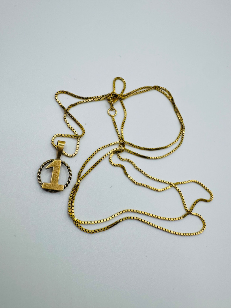 14K Gold “#1” Pendant Necklace – 24” Box Chain – 3.2g. Important Disclaimer: Jewelry in this lot has not been tested. By bidding, you agree to purchase as is, with no guarantees on metal purity, gemstone authenticity, or content. No refunds issued on these factors.