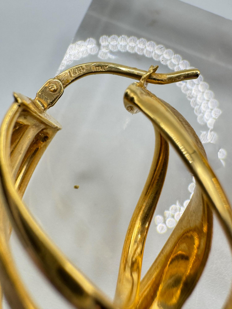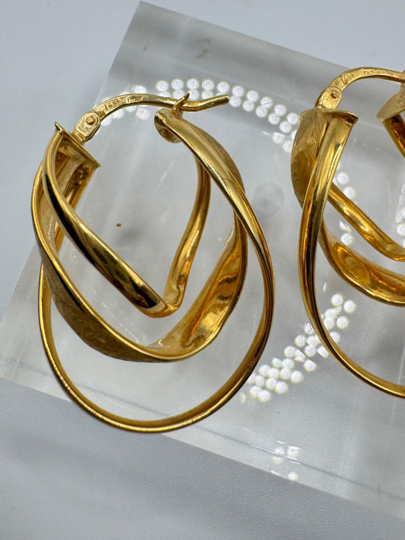 14K Gold Italian Triple Interlocking Oval Hoop Earrings – 3.54g. Important Disclaimer: Jewelry in this lot has not been tested. By bidding, you agree to purchase as is, with no guarantees on metal purity, gemstone authenticity, or content. No refunds issued on these factors.