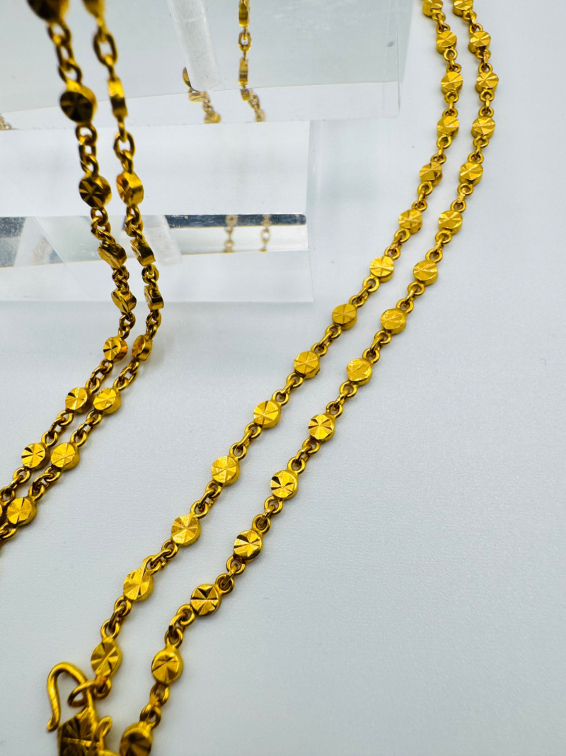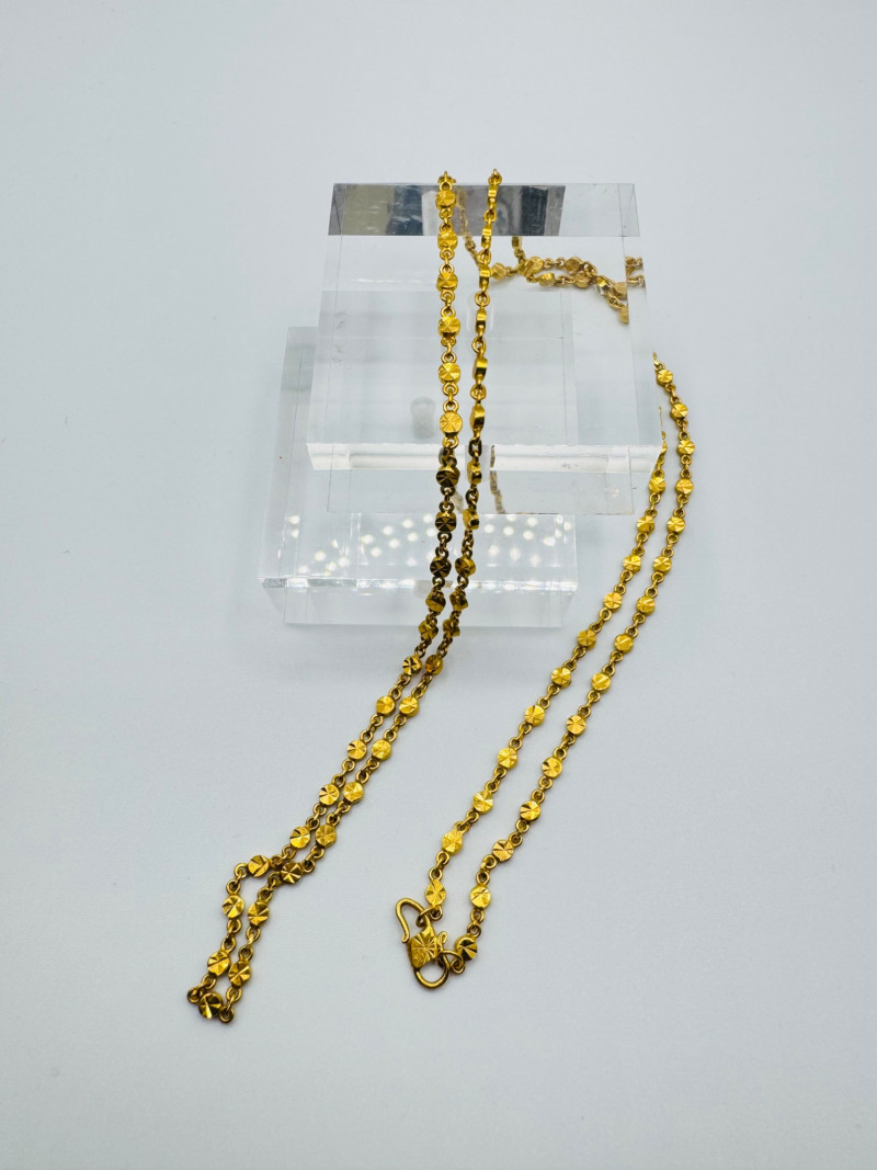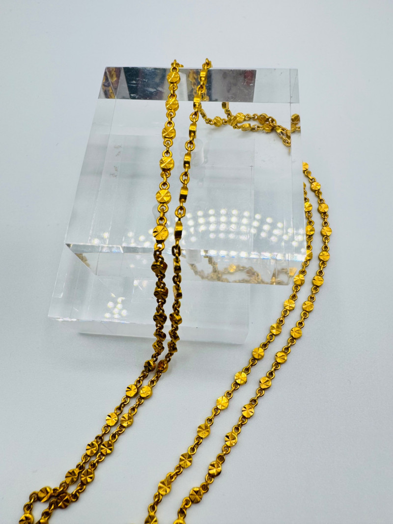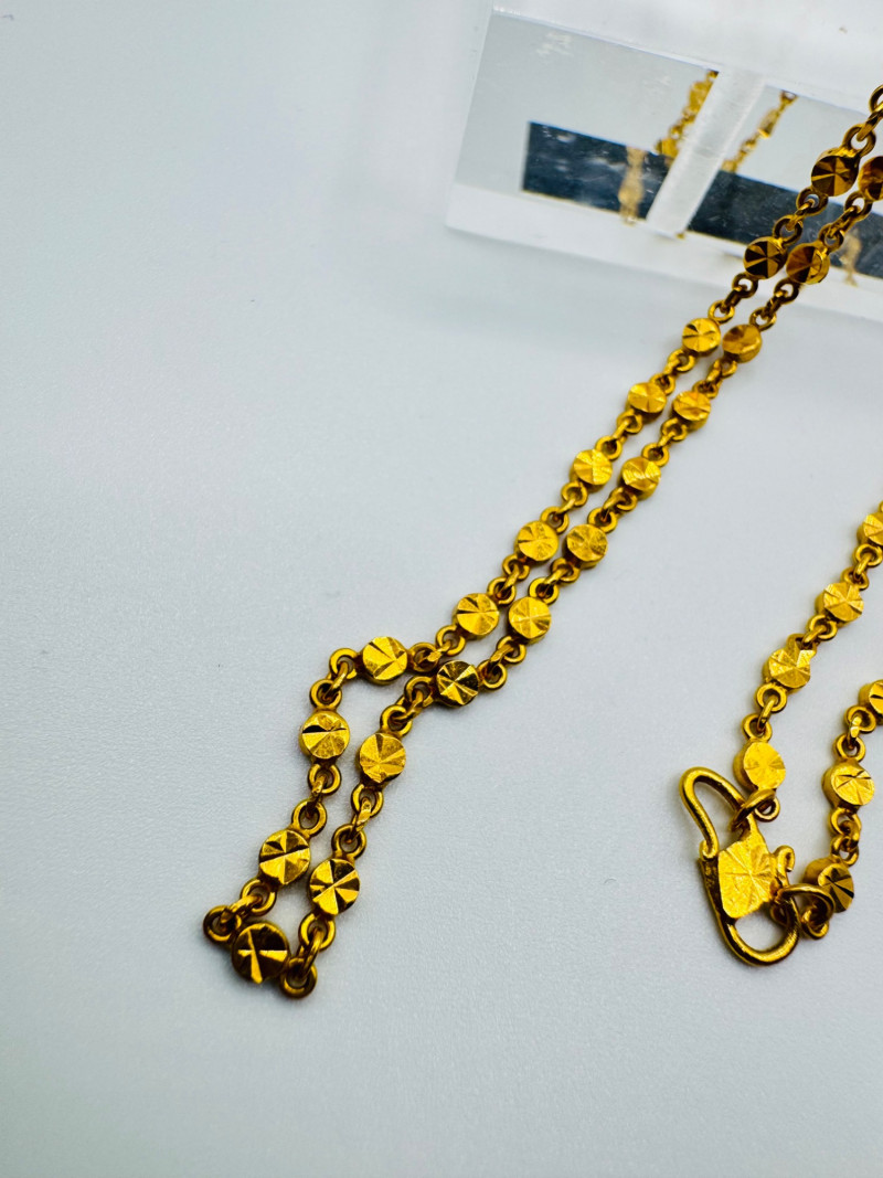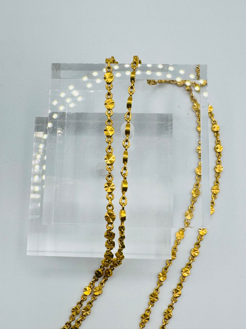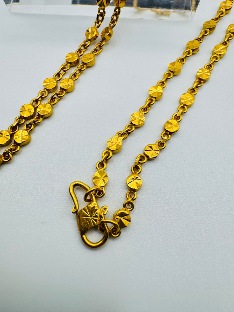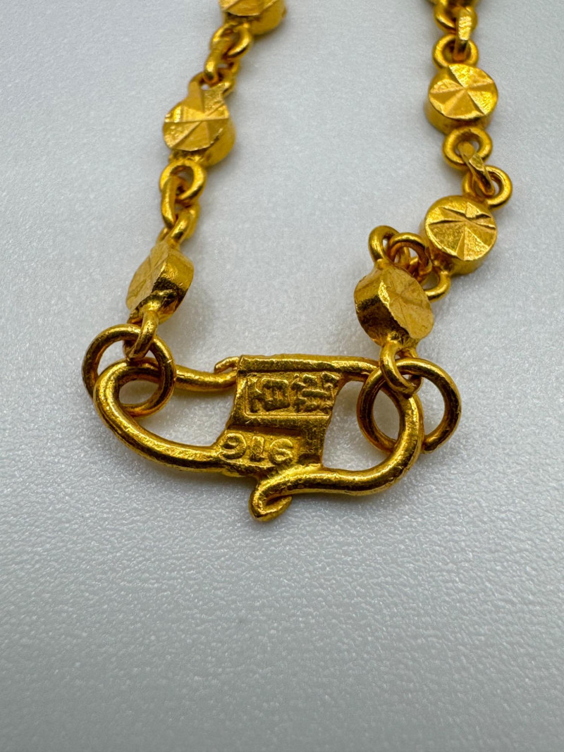 Gold Necklace Marked 916 (22K), Starburst Disc Link Chain – 13.76g. Important Disclaimer: Tested with acid, held up between 14–18K range (exact purity unknown). By bidding, you agree to purchase as is, with no guarantees on metal purity, gemstone authenticity, or content. No refunds issued on these factors.