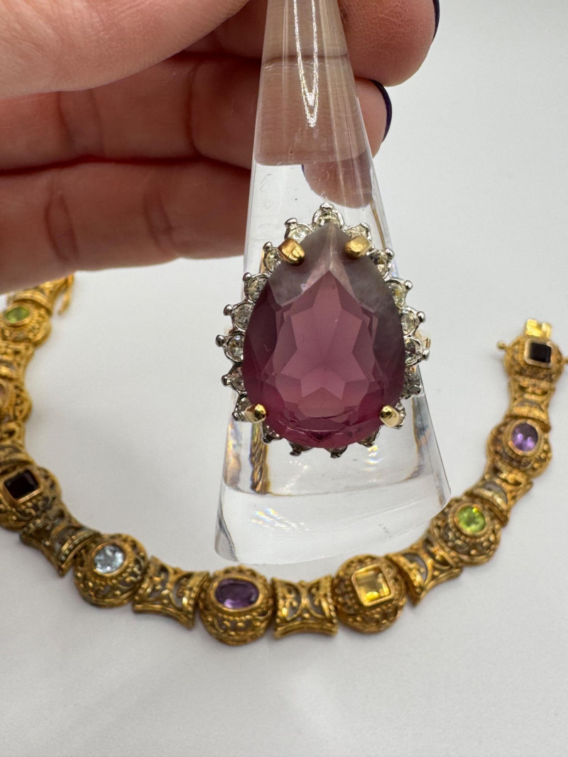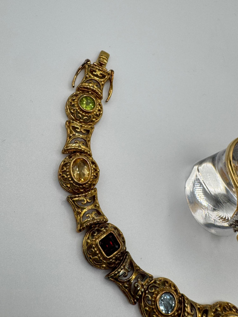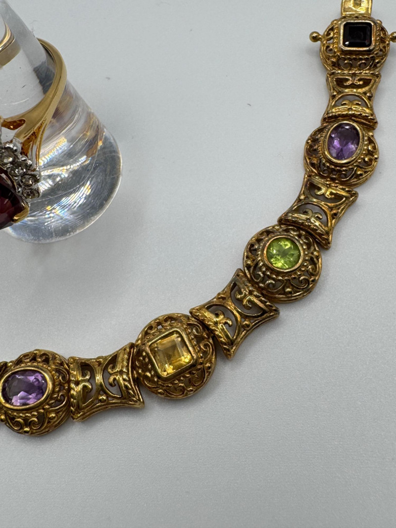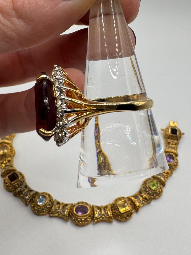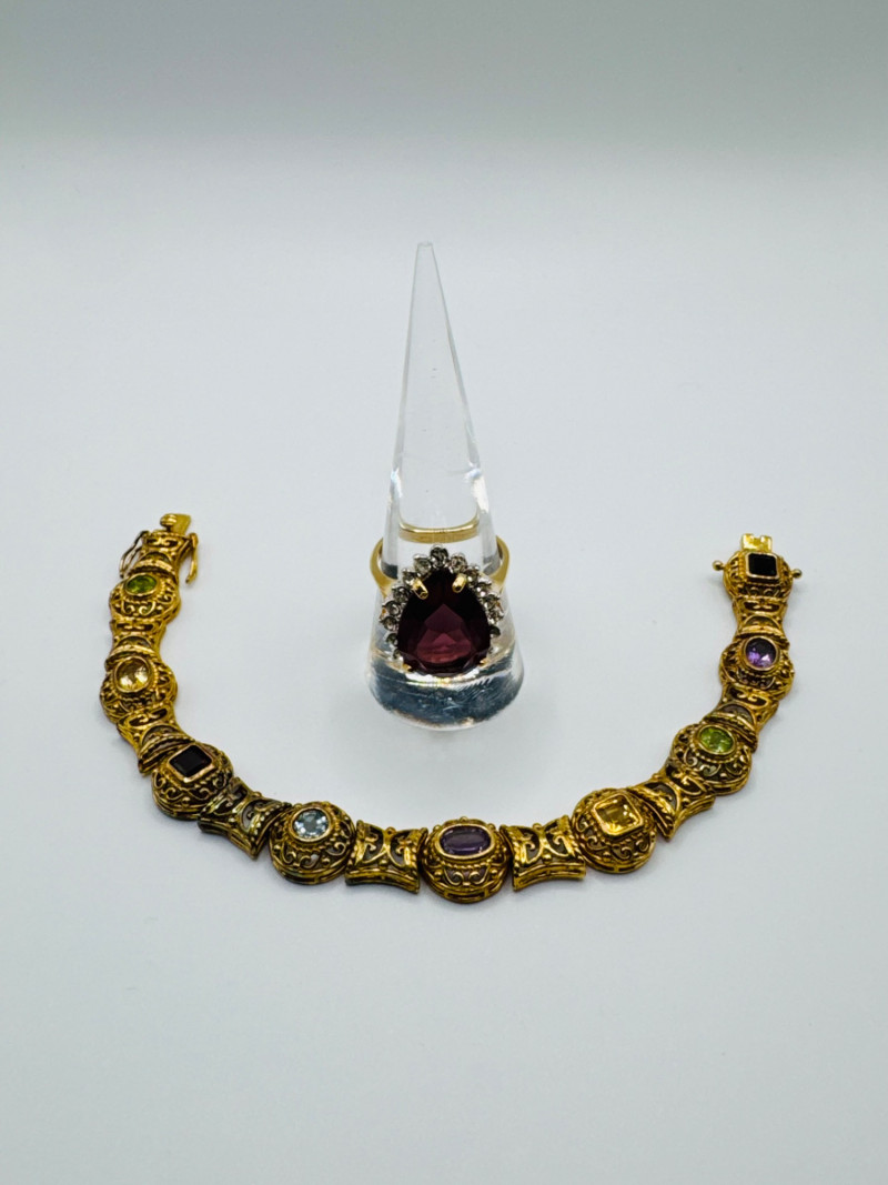 925 Gold-Tone Bracelet w/ Gemstones + 18K Tear Drop Ring Size 9–10. Important Disclaimer: Jewelry in this lot has not been tested. By bidding, you agree to purchase as is, with no guarantees on metal purity, gemstone authenticity, or content. No refunds issued on these factors.