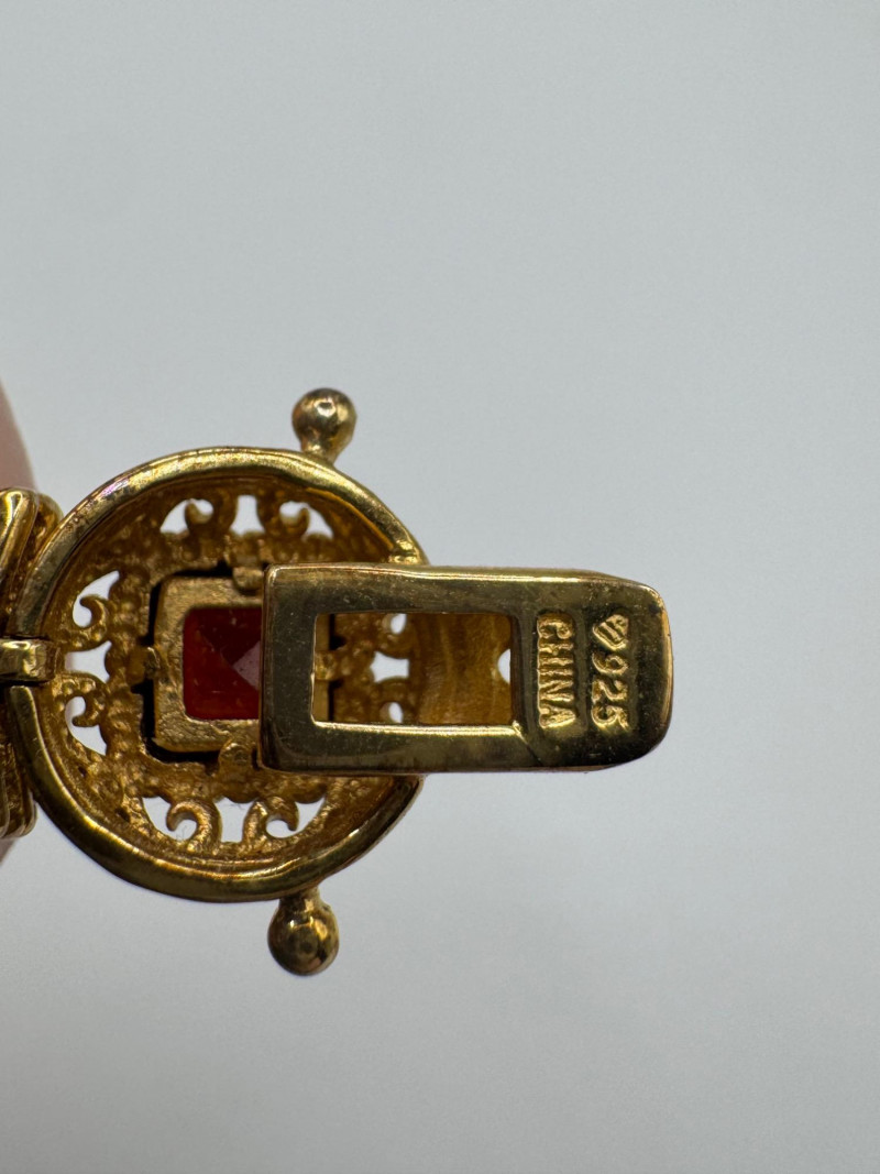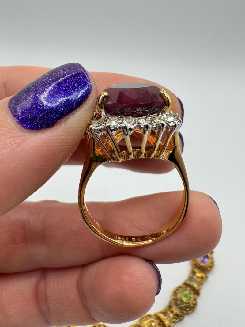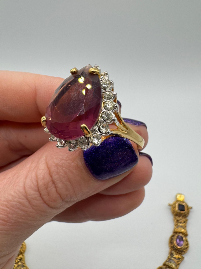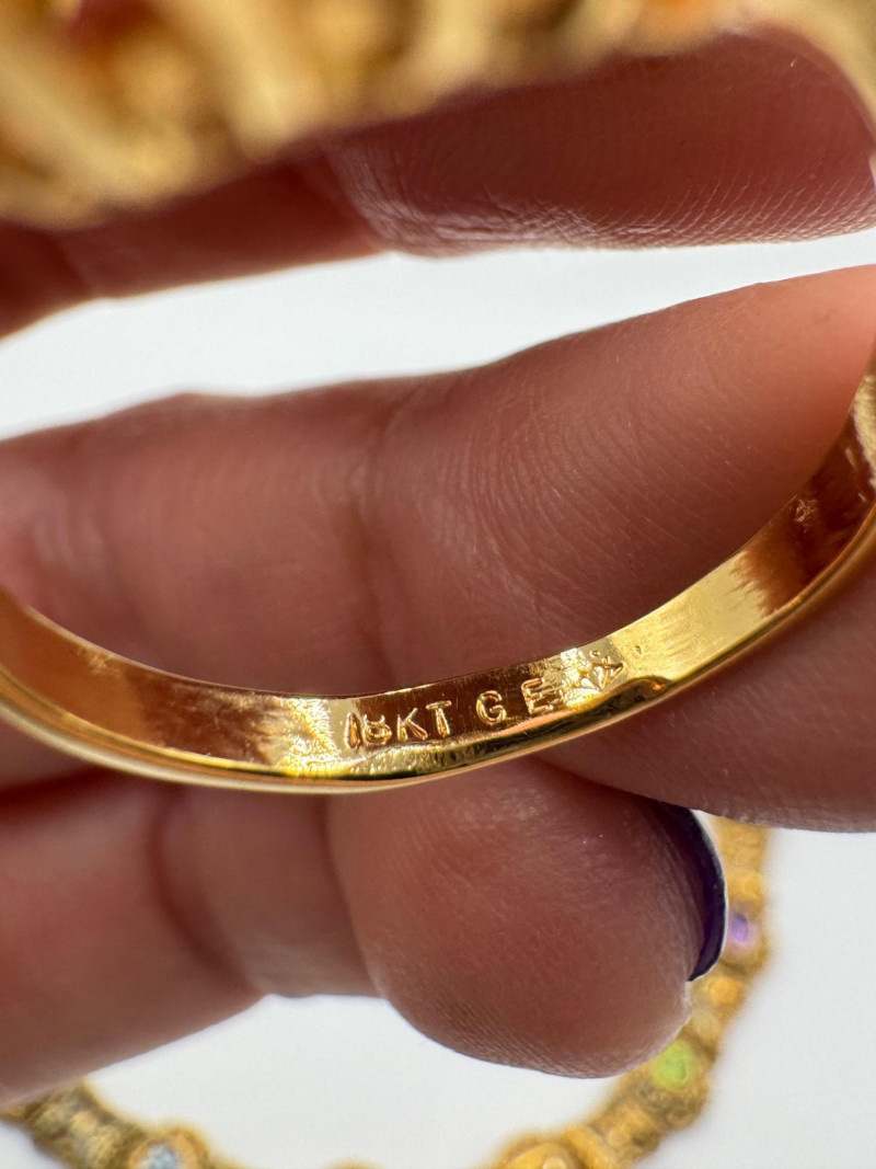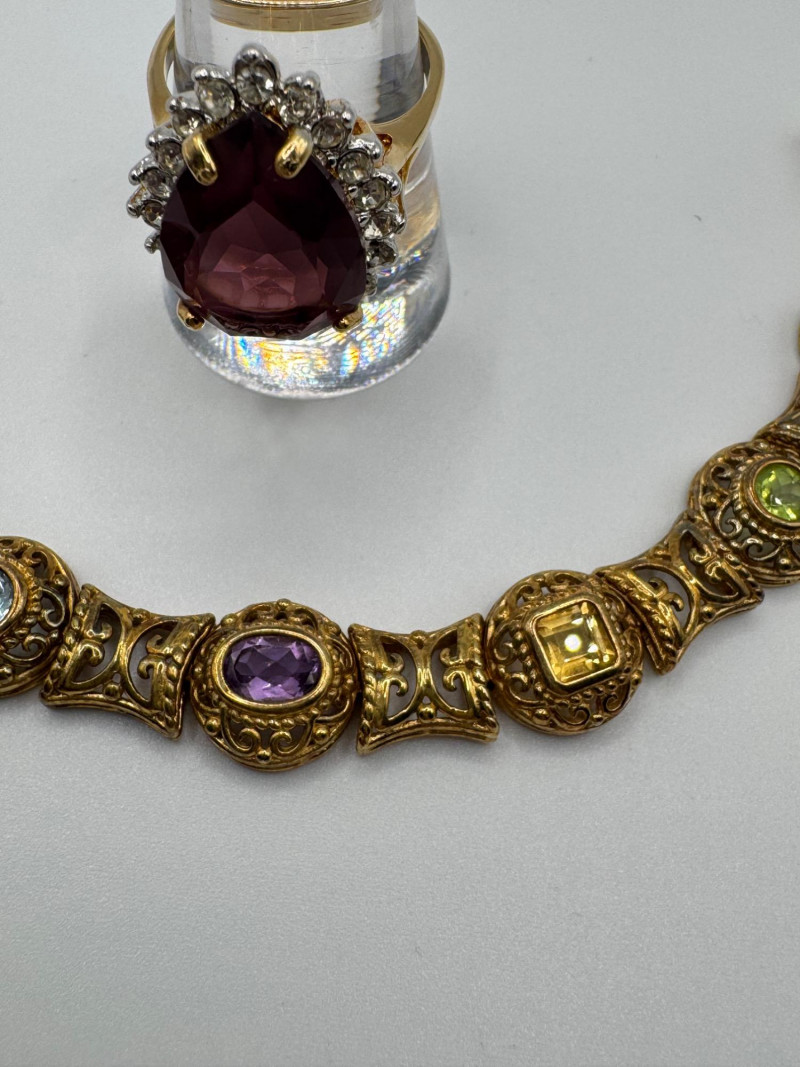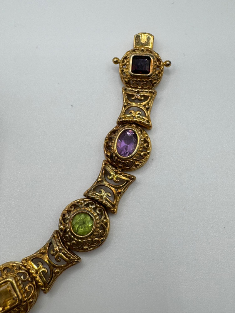 925 Gold-Tone Bracelet w/ Gemstones + 18K Tear Drop Ring Size 9–10. Important Disclaimer: Jewelry in this lot has not been tested. By bidding, you agree to purchase as is, with no guarantees on metal purity, gemstone authenticity, or content. No refunds issued on these factors.