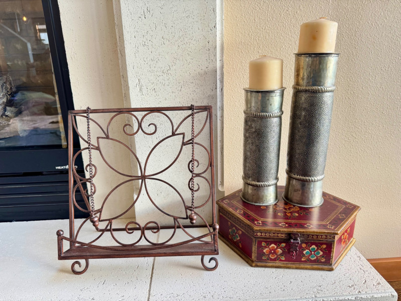 Metal Cookbook Stand, Silver Candle Holders & Hexagonal Box Set.