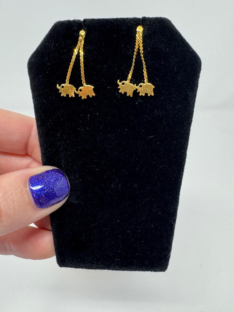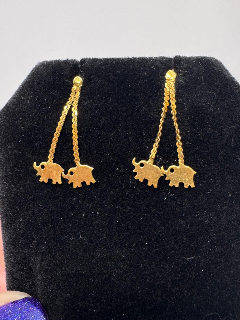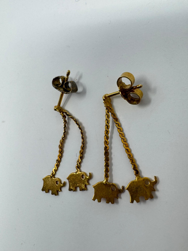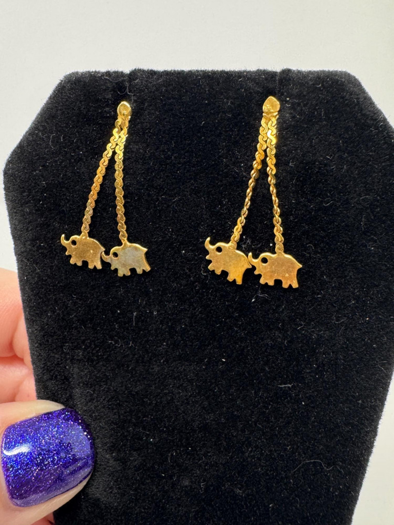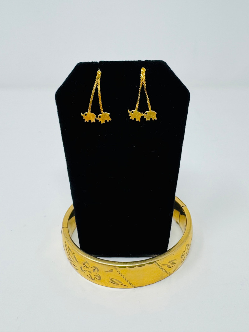Potential14K Gold Elephant Drop Earrings & Gold-Filled Engraved Bangle, 1.52g. Important Disclaimer: Jewelry in this lot has not been tested. By bidding, you agree to purchase as is, with no guarantees on metal purity, gemstone authenticity, or content. No refunds issued on these factors.